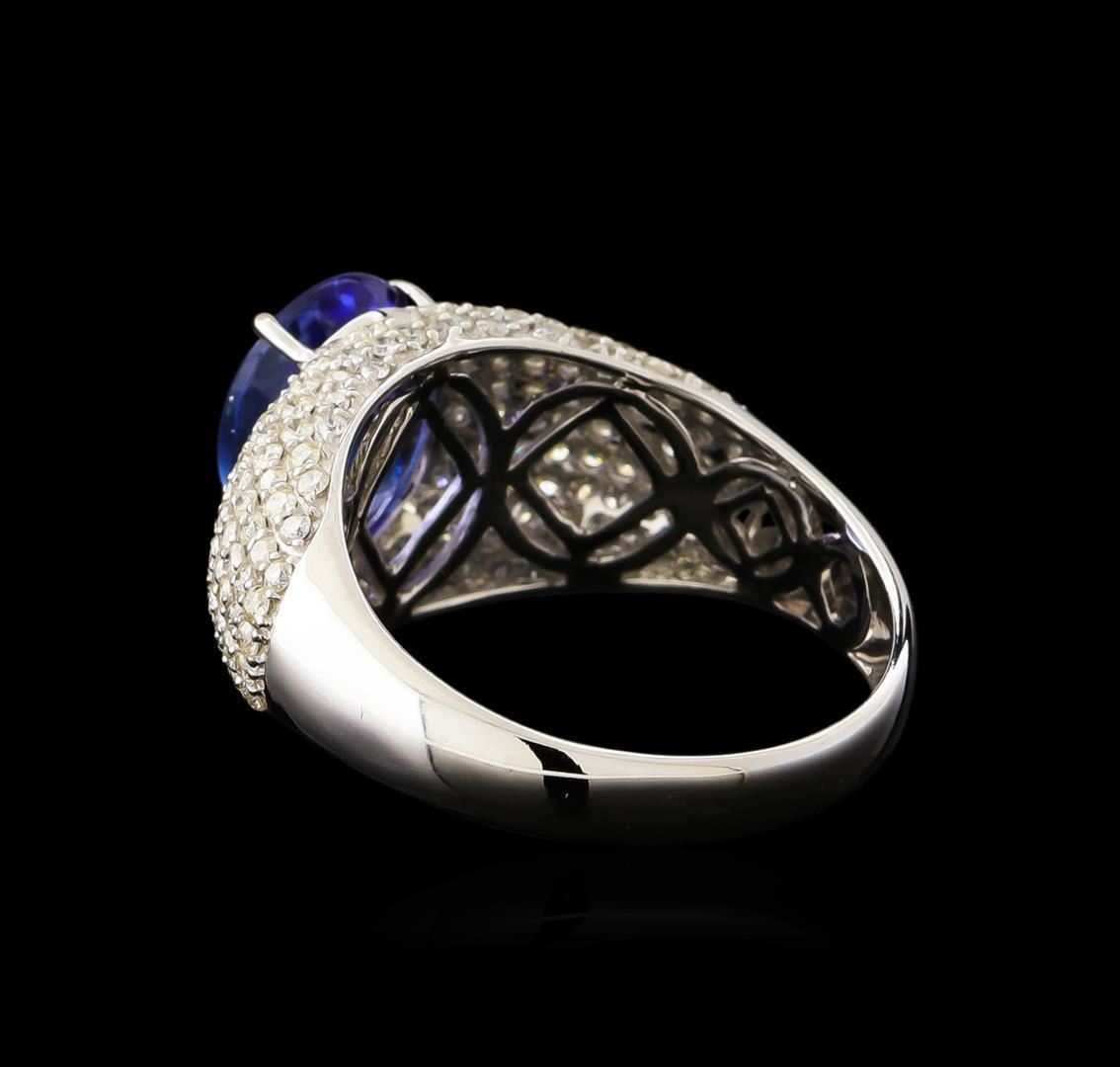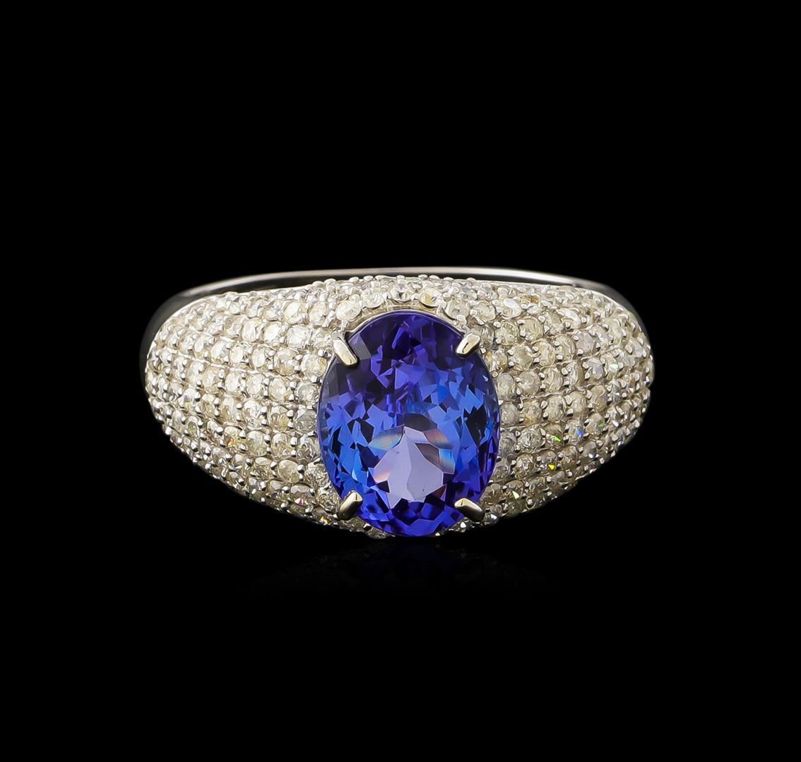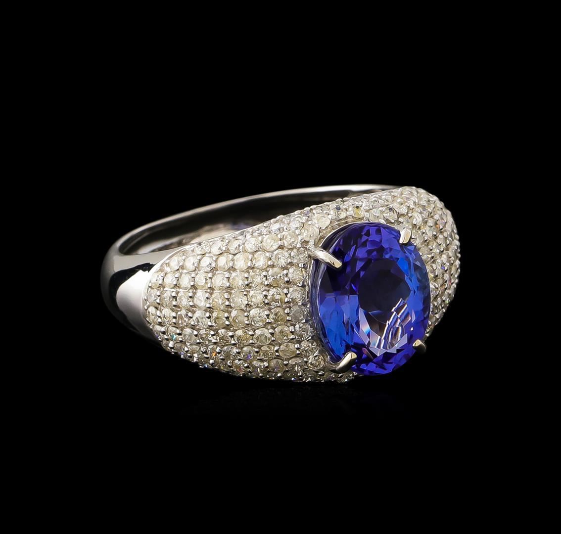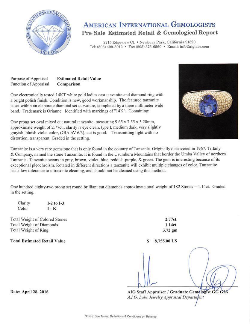 One electronically tested 14KT white gold ladies cast tanzanite and diamond ring with a bright polish finish. The featured tanzanite is set within an elaborate diamond set curvature, completed by a three millimeter wide band. Trademark is Orianne. Identified with markings of "14K". Condition is new, good workmanship. Containing: One prong set oval mixed cut natural tanzanite, measuring 9.65 x 7.55 x 5.20mm, approximate weight of 2.77ct., clarity is eye clean, type I, medium dark, very slightly grayish, bluish violet color, (GIA bV 6/3), cut is good. Transmitting light with no distortion, transparent. Graded in the setting. Tanzanite is a very rare gemstone that is only found in the country of Tanzania. Originally discovered in 1967. Tiffany & Company, named the stone Tanzanite. It is found in the Usumburu Mountains that border the Umba Valley of northern Tanzania. Tanzanite occurs in gray, brown, violet, blue, reddish-purple, & green. The gem is interesting because of its exceptional pleochroism. Rotated in different directions a tanzanite will exhibit multiple changes of color. Tanzanite has a low tolerance to ultrasonic cleaning, and should not be cleaned using this method. One Hundred Eighty-Two prong set round brilliant cut diamonds approximate total weight of 182 Stones = 1.14ct. Graded in the setting. Clarity: I-2 to I-3. Color: I - K. Total Weight of Colored Stones 2.77ct. Total Weight of Diamonds 1.14ct. Total Weight of Ring 3.72gm.