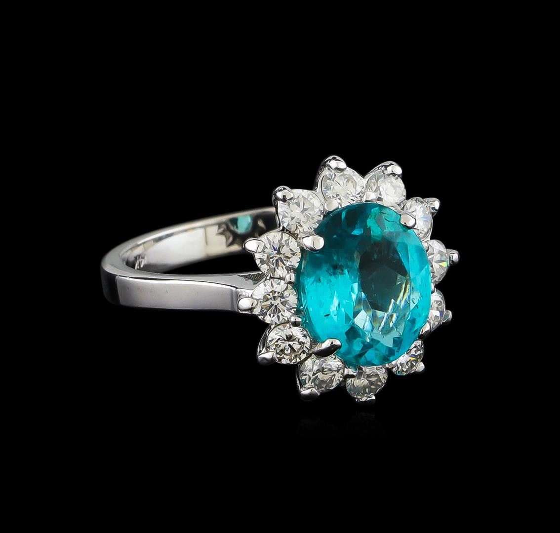 One electronically tested 14KT white gold ladies cast apatite and diamond ring with a bright polish finish. The featured apatite is set within a diamond floret bezel, completed by a two and one-half millimeter wide band. Identified with markings of "14K". Condition is new, good workmanship. Containing: One prong set oval mixed cut natural apatite, measuring 9.90 x 8.05 x 4.80mm, 6%. bulge factor, exact weight 2.78ct., clarity is slightly included, medium, very slightly grayish, greenish blue color, (GIA gB 5/3), cut is good. Transmitting light with a minimum of distortion, transparent,. Naturally occurring internal & external characteristics are present. Graded in the setting. Twelve prong set round brilliant cut diamonds, measuring 2.80 - 2.70 x 1.65mm exact total weight 12 Stones = 0.96ct. Graded in the setting. Clarity: SI-2 to I-1. Color: H - J. Total Weight of Colored Stones 2.78ct. Total Weight of Diamonds 0.96ct. Total Weight of Ring 4.97gm. AIG Appraised.