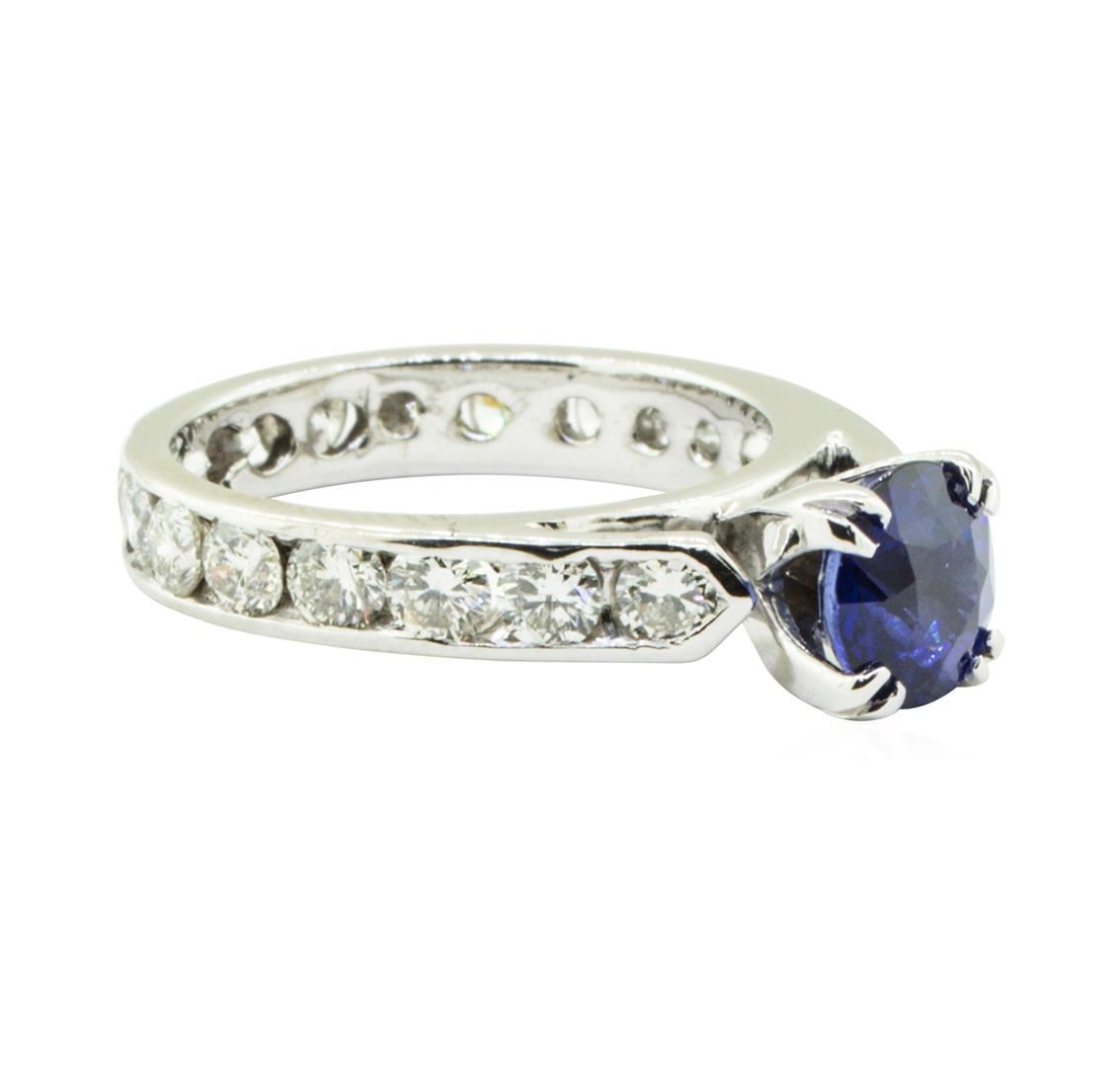 One electronically tested 14KT white gold lady's combination cast & assembled fashion straight line ring with a cathedral shank with a bright polish finish. The featured lady's ring has a diamond eternity shank measuring 3.20 millimeters in width. Condition is like new, good workmanship. Containing: One prong set round modified brilliant cut natural blue sapphire, measuring 6.50 - 6.46 x 3.60 mm, (depth est.) approximate weight of 1.22ct., clarity is eye clean, medium, strong, violetish blue color, (GIA vB 5/5), cut is very good. Transmitting light with no distortion, transparent. Colored gemstones are presumed to have been subjected to commonly used enhancement processes. Graded in the setting. Nineteen channel set round brilliant cut diamonds, measuring 2.85 - 2.75 x 1.72mm (depth est.) approximate total weight of 19 Stones = 1.56ct. Diamonds have very small chip. Graded in the setting. Color H - I Clarity VS-2 to SI-1 Cut Very Good. Total Weight of Colored Stones 1.22ct.. Total Weight of Diamonds 1.56ct.. Total Weight of Ring 3.40gm GAS Appraised at $5300.00. GAS Appraised.