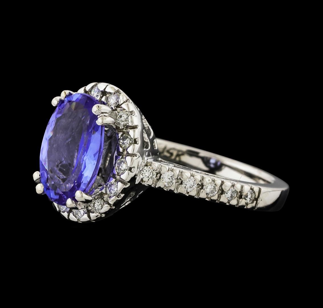One Tanzanite and Diamond Ring featuring: 14KT White Gold with a total weight of 5.96 grams, Tanzanite with a total weight of 2.80ct, and 26 diamonds with a total weight of 0.38ctw.