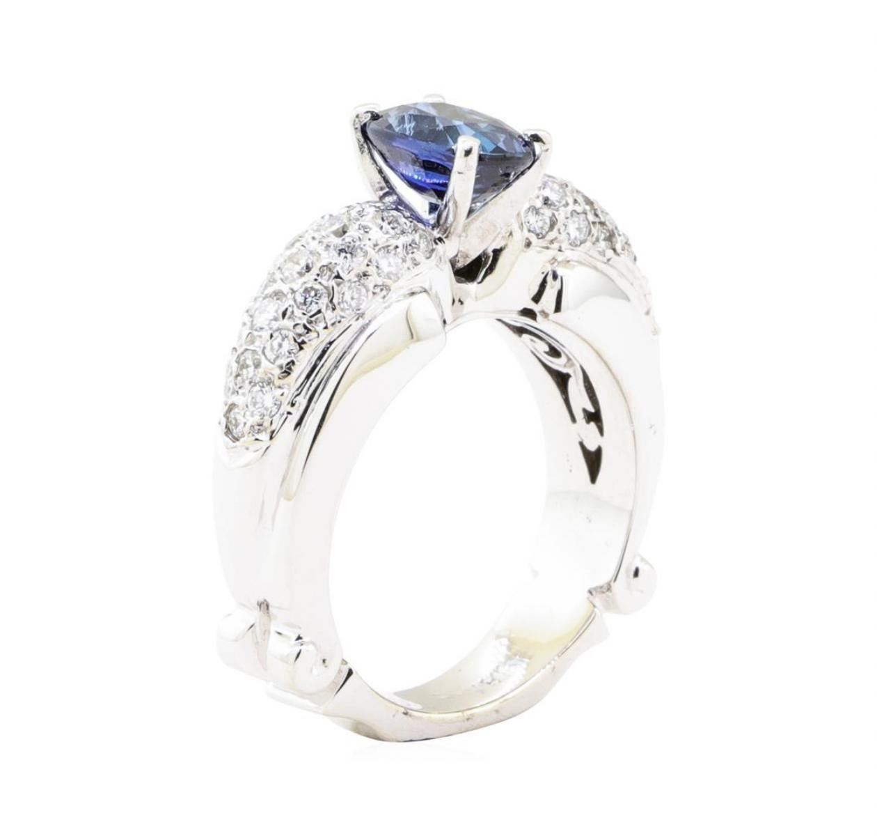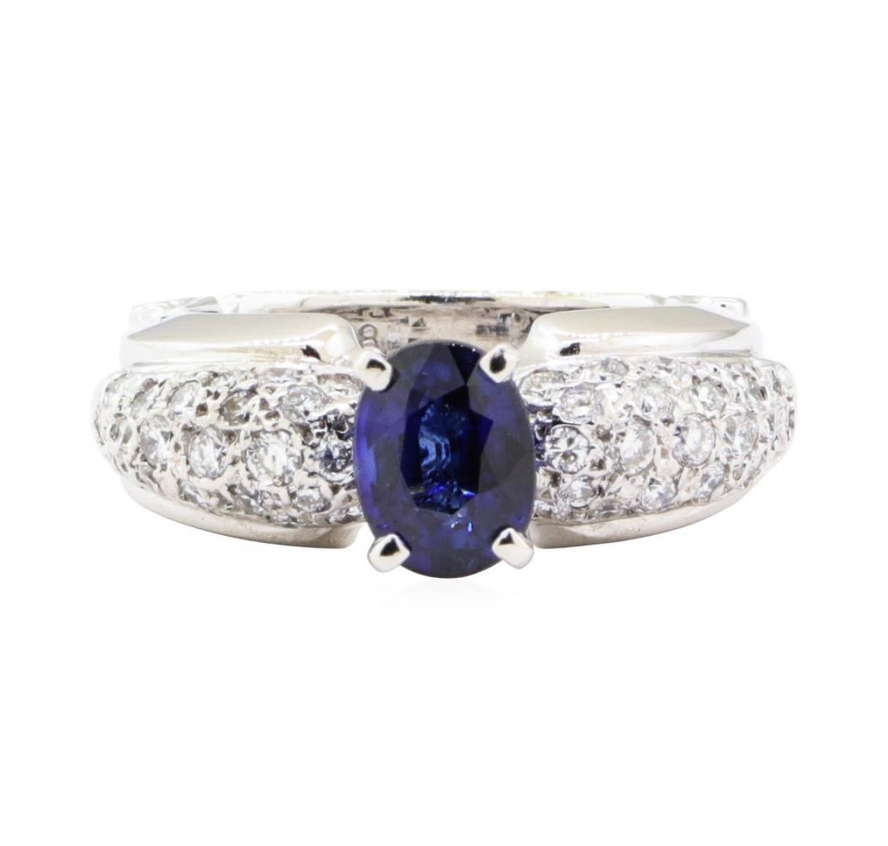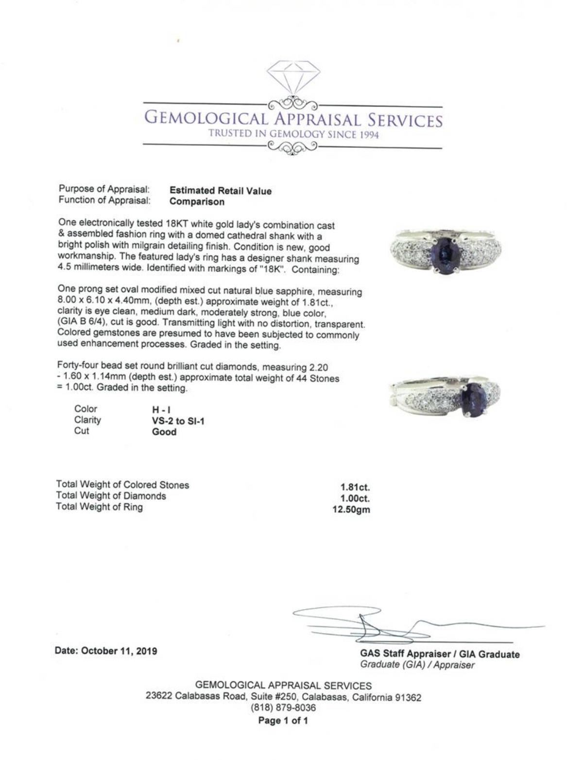 One electronically tested 18KT white gold lady's combination cast & assembled fashion ring with a domed cathedral shank with a bright polish with milgrain detailing finish. The featured lady's ring has a designer shank measuring 4.5 millimeters wide. Identified with markings of '18K'. Condition is new, good workmanship. Containing: One prong set oval modified mixed cut natural blue sapphire, measuring 8.00 x 6.10 x 4.40mm, (depth est.) approximate weight of 1.81ct., clarity is eye clean, medium dark, moderately strong, blue color, (GIA B 6/4), cut is good. Transmitting light with no distortion, transparent. Colored gemstones are presumed to have been subjected to commonly used enhancement processes. Graded in the setting. Forty-Four bead set round brilliant cut diamonds, measuring 2.20 - 1.60 x 1.14mm (depth est.) approximate total weight of 44 Stones = 1.00 ct. Graded in the setting. Color H - I Clarity VS-2 to SI-1 Cut Good. Total Weight of Colored Stones 1.81ct.. Total Weight of Diamonds 1.00 ct.. Total Weight of Ring 12.50gm GAS Appraised at $6200.00. GAS Appraised.
