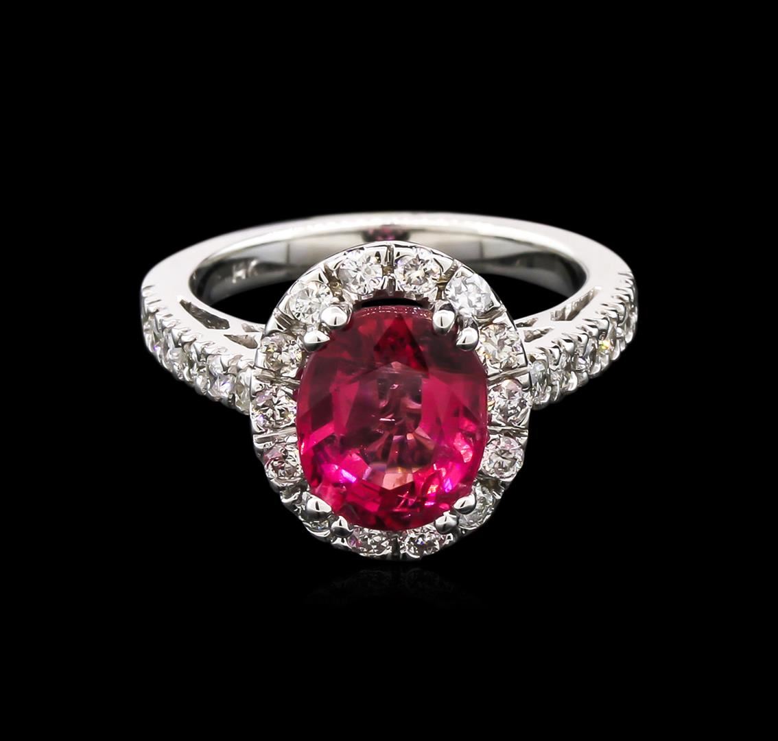 One electronically tested 14KT white gold lady's cast fashion ring with a halo with a bright polish finish. The featured lady's ring has a shank measuring 2.42 millimeters wide. Identified with markings of "14K". Condition is new, good workmanship. Containing: One prong set oval modified brilliant cut natural pink tourmaline, measuring 9.65 x 8.09 x 5.27mm, approximate weight of 2.83ct., clarity is severely included, type II, medium, moderately strong, purple red color, (GIA PR 5/4), cut is good. Transmitting light with a minimum of distortion, transparent. Colored gemstones are presumed to have been subjected to commonly used enhancement processes. Graded in the setting. Twenty-Six split prong set round brilliant cut diamonds, measuring 1.90 - 1.85 x 1.20mm (depth est.) approximate total weight of 26 Stones = 0.67ct. Graded in the setting. Clarity: SI-2 to I-1. Color: H - I. Cut Good. Total Weight of Colored Stones 2.83ct. Total Weight of Diamonds 0.67ct. Total Weight of Ring 5.90gm. GAS Appraised at $5,280.00.