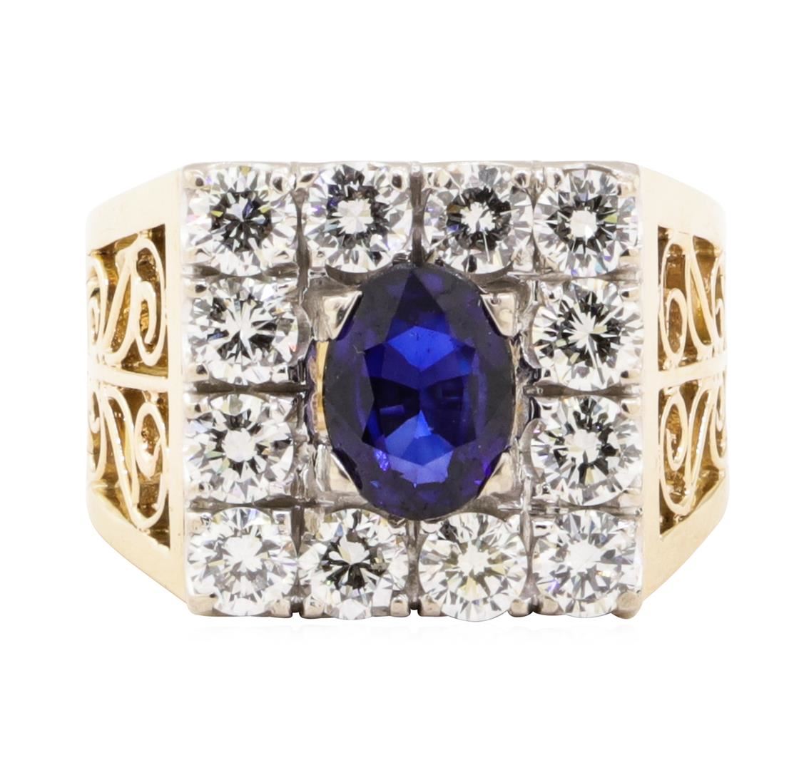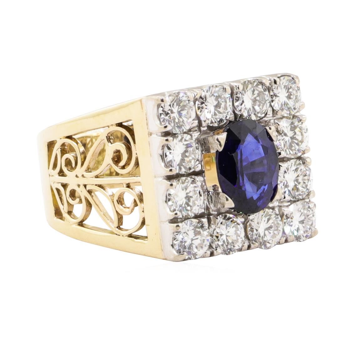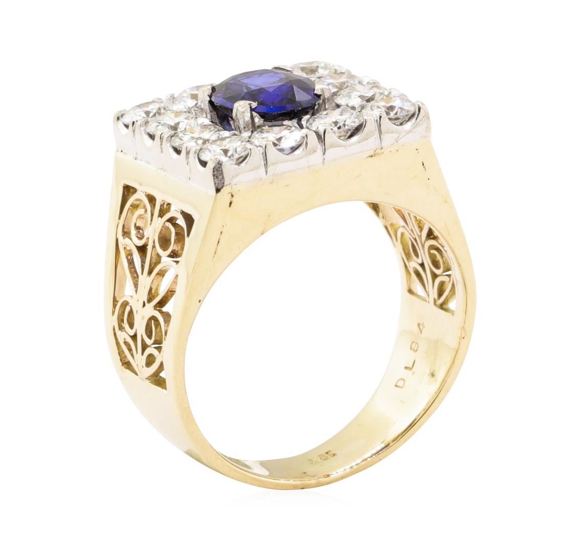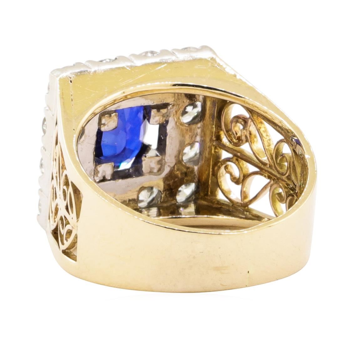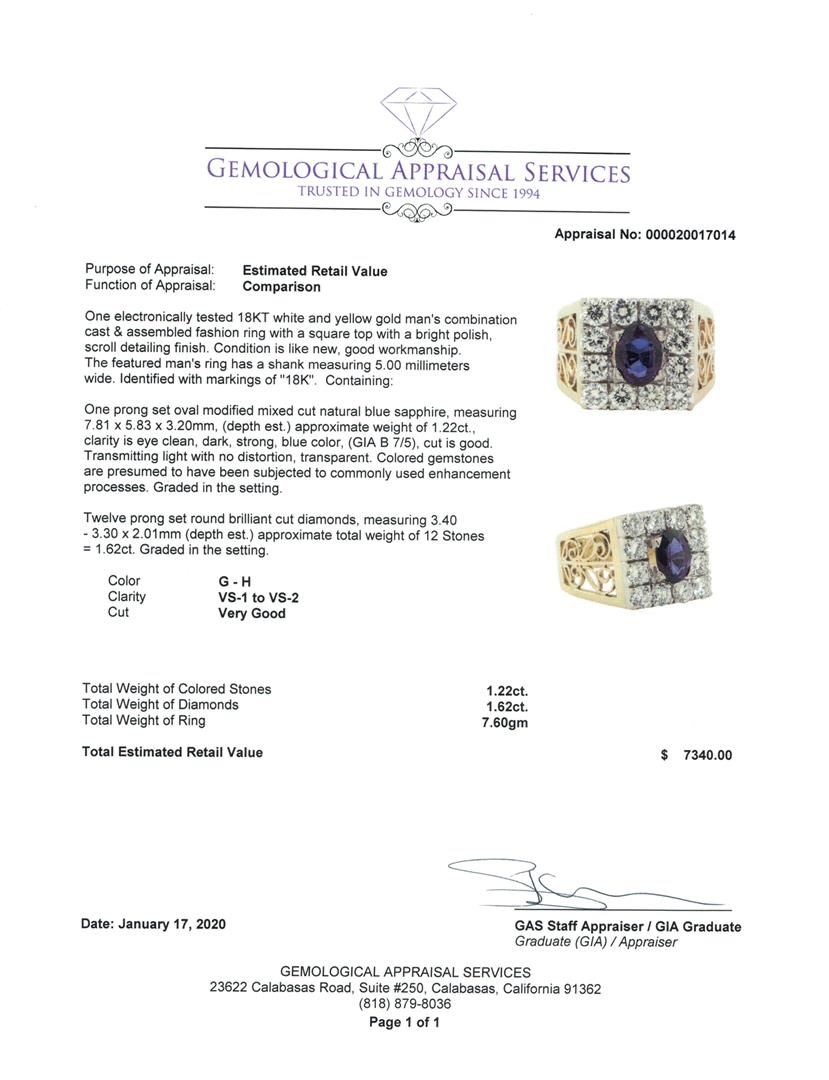 One electronically tested 18KT white and yellow gold man's combination cast & assembled fashion ring with a square top with a bright polish, scroll detailing finish. The featured man's ring has a shank measuring 5.00 millimeters wide. Identified with markings of '18K'. Condition is like new, good workmanship. Containing: One prong set oval modified mixed cut natural blue sapphire, measuring 7.81 x 5.83 x 3.20mm, (depth est.) approximate weight of 1.22ct., clarity is eye clean, dark, strong, blue color, (GIA B 7/5), cut is good. Transmitting light with no distortion, transparent. Colored gemstones are presumed to have been subjected to commonly used enhancement processes. Graded in the setting. Twelve prong set round brilliant cut diamonds, measuring 3.40 - 3.30 x 2.01mm (depth est.) approximate total weight of 12 Stones = 1.62ct. Graded in the setting. Color G - H Clarity VS-1 to VS-2 Cut Very Good. Total Weight of Colored Stones 1.22ct.. Total Weight of Diamonds 1.62ct.. Total Weight of Ring 7.60gm GAS Appraised at $7340.00. GAS Appraised.
