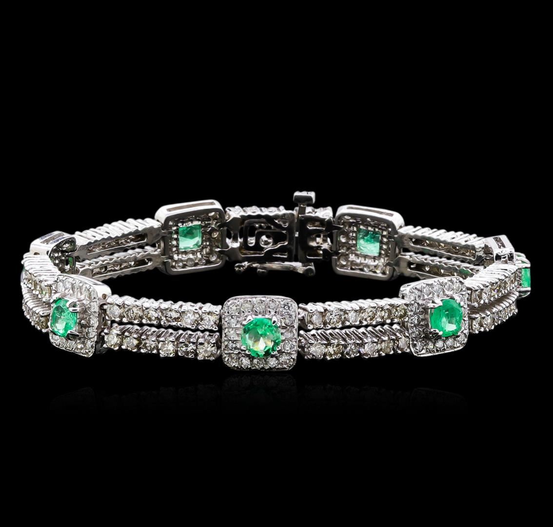 One electronically tested 14KT white gold ladies cast & assembled emerald and diamond bracelet with a bright polish finish. Seven inch length bracelet composed of emerald and diamond bezels, supported by mirroring diamond ribbons terminating in a concealed clasp with safety. Identified with markings of "14K". Condition is good. Containing: Seven prong set round mixed cut natural emeralds, measuring 4.80 - 4.80 x 3.12 mm, approximate total weight of 2.84ct., clarity is slightly included, type III, medium dark, very slightly grayish, very slightly bluish green color, (GIA vslbG 6/3), cut is good. Transmitting light with a minimum of distortion, transparent. Naturally occurring internal & external characteristics are present. Indications of oil residue. Color grade is an average for the group. Graded in the setting. One Hundred Ninety-Six prong & bead set round brilliant cut diamonds, measuring 2.50 - 1.60 x 1.23mm (depth est.) approximate total weight of 196 Stones = 6.86ct. Graded in the setting. Clarity: SI-2 to I-2. Color: I - K. Total Weight of Colored Stones 2.84ct. Total Weight of Diamonds 6.86ct. AIG Appraised.