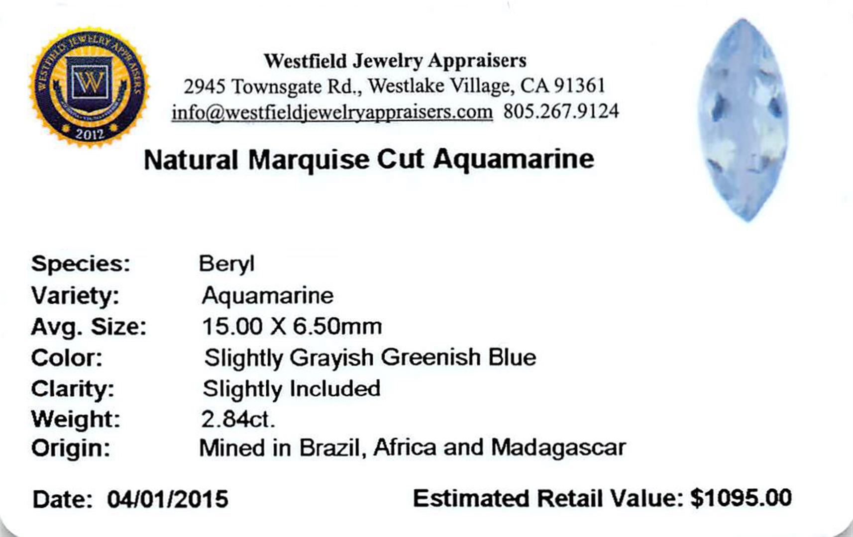 One marquise cut natural aquamarine exact weight 2.84ct., clarity is slightly included, type I, medium, slightly grayish, very slightly greenish blue color, (GIA vslgB 5/2), cut is good. Westfield Appraised.