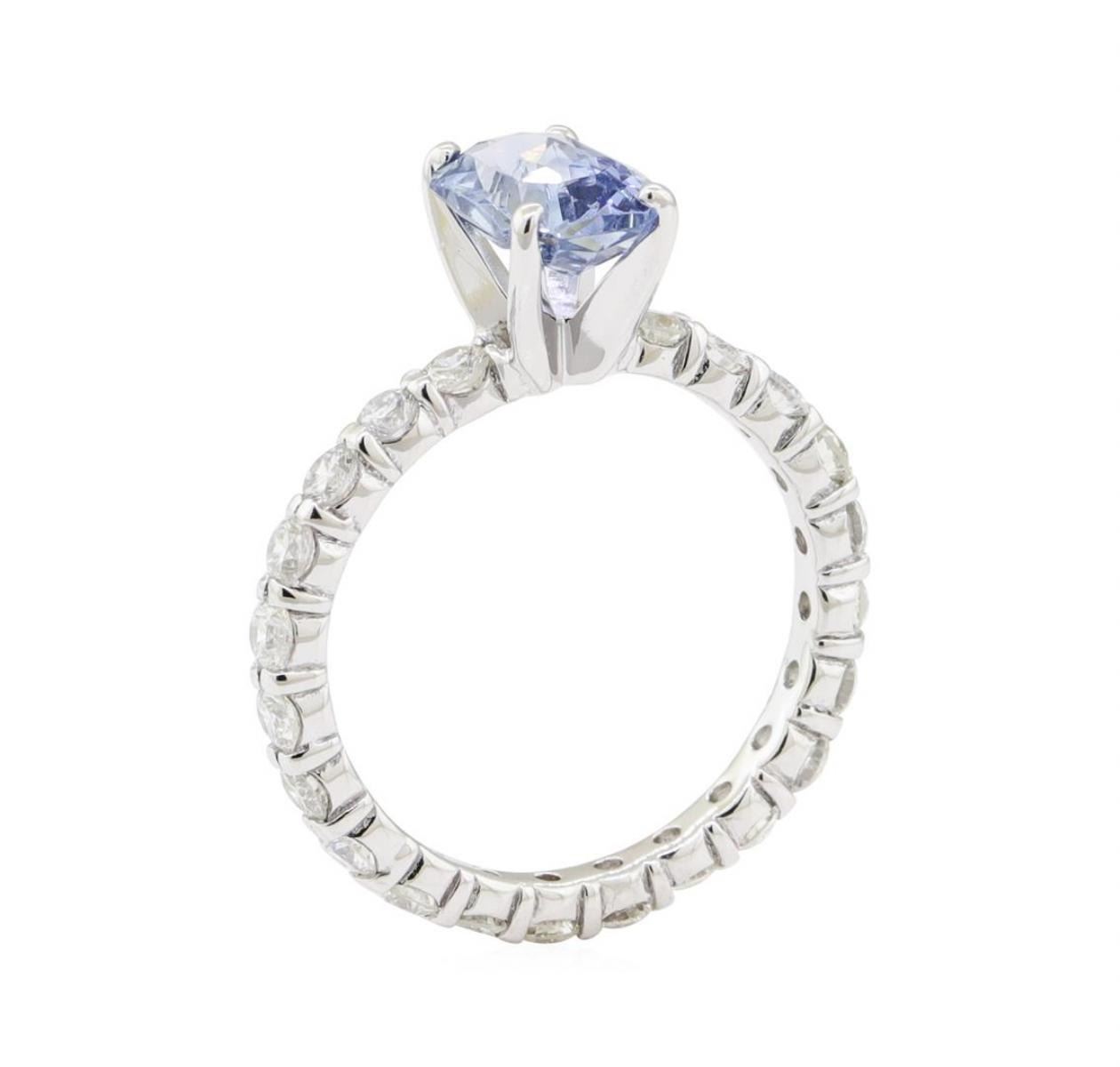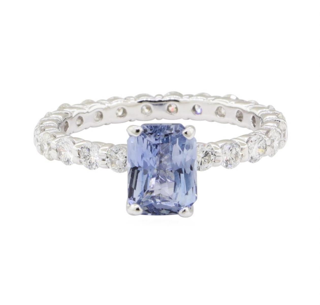 One electronically tested 14KT white gold lady's combination cast & assembled fashion ring with a straight line eternity motif with a bright polish finish. The featured lady's ring has a shank measuring 2.30 millimeters wide. Condition is new, good workmanship. Containing: One prong set radiant modified brilliant cut natural blue sapphire, measuring 7.65 x 5.80 x 4.00mm, (depth est.) approximate weight of 1.84ct., clarity is eye clean, light, moderately strong, blue color, (GIA B 3/4), cut is very good. Transmitting light with no distortion, transparent. Colored gemstones are presumed to have been subjected to commonly used enhancement processes. Graded in the setting. Twenty-Two prong set round brilliant cut diamonds, measuring 2.35 - 2.25 x 1.43mm (depth est.) approximate total weight of 22 Stones = 1.00ct. Graded in the setting. Color H - I Clarity SI-1 to SI-2 Cut Good. Total Weight of Colored Stones 1.84ct.. Total Weight of Diamonds 1.00ct.. Total Weight of Ring 2.70gm GAS Appraised at $3805.00. GAS Appraised.