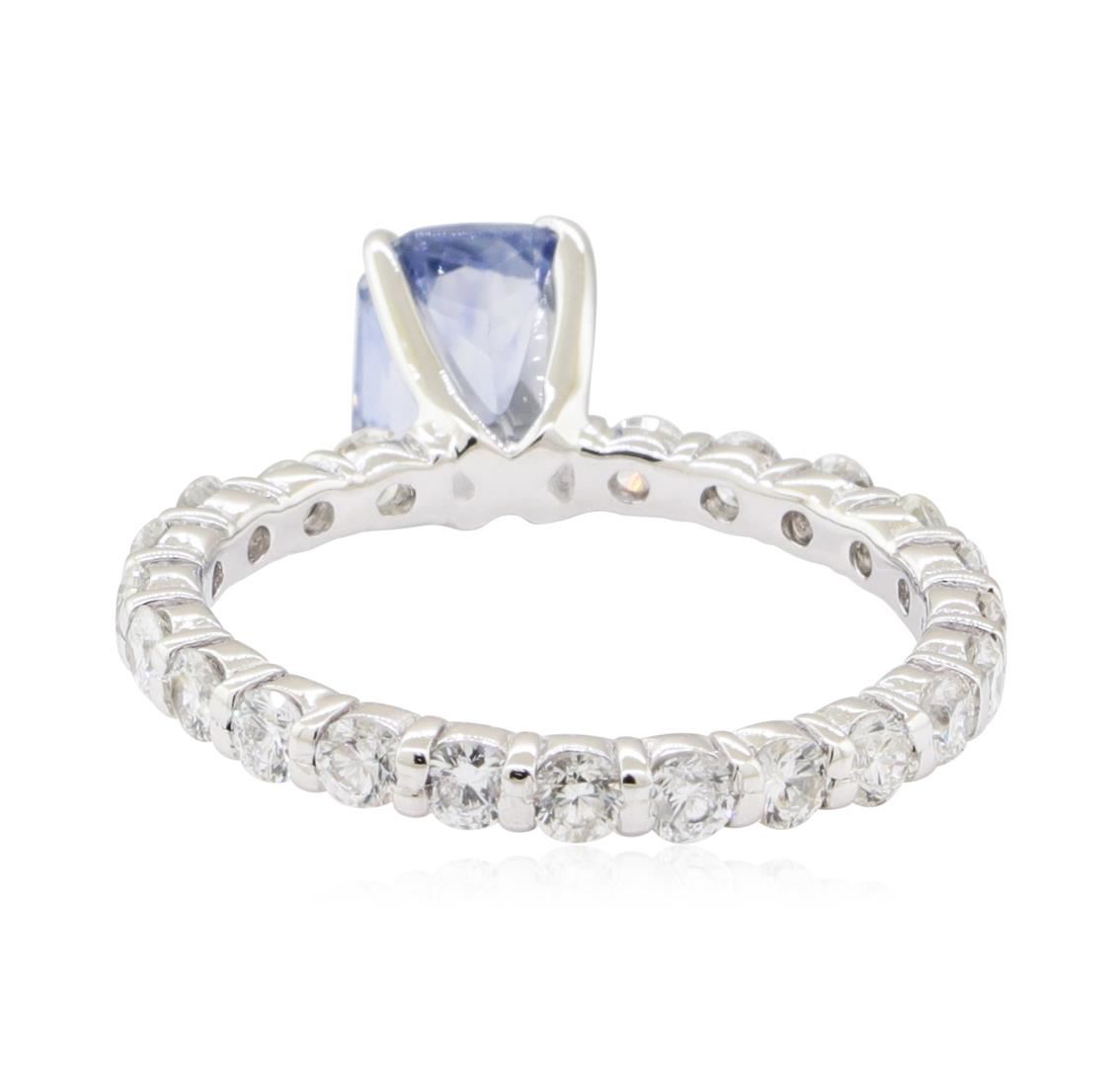One electronically tested 14KT white gold lady's combination cast & assembled fashion ring with a straight line eternity motif with a bright polish finish. The featured lady's ring has a shank measuring 2.30 millimeters wide. Condition is new, good workmanship. Containing: One prong set radiant modified brilliant cut natural blue sapphire, measuring 7.65 x 5.80 x 4.00mm, (depth est.) approximate weight of 1.84ct., clarity is eye clean, light, moderately strong, blue color, (GIA B 3/4), cut is very good. Transmitting light with no distortion, transparent. Colored gemstones are presumed to have been subjected to commonly used enhancement processes. Graded in the setting. Twenty-Two prong set round brilliant cut diamonds, measuring 2.35 - 2.25 x 1.43mm (depth est.) approximate total weight of 22 Stones = 1.00ct. Graded in the setting. Color H - I Clarity SI-1 to SI-2 Cut Good. Total Weight of Colored Stones 1.84ct.. Total Weight of Diamonds 1.00ct.. Total Weight of Ring 2.70gm GAS Appraised at $3805.00. GAS Appraised.