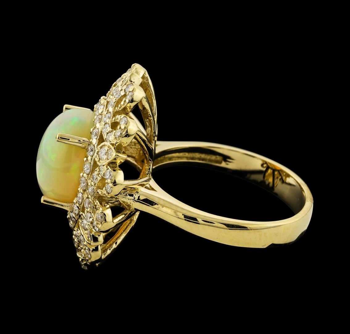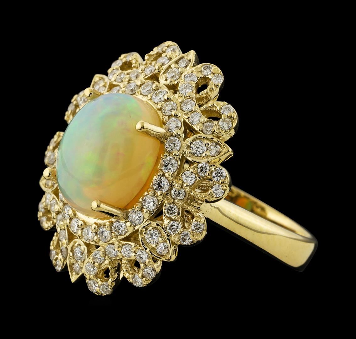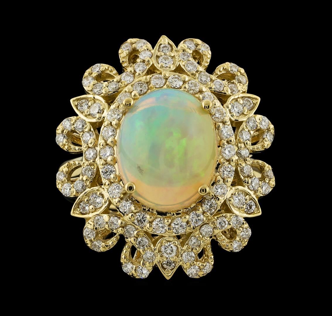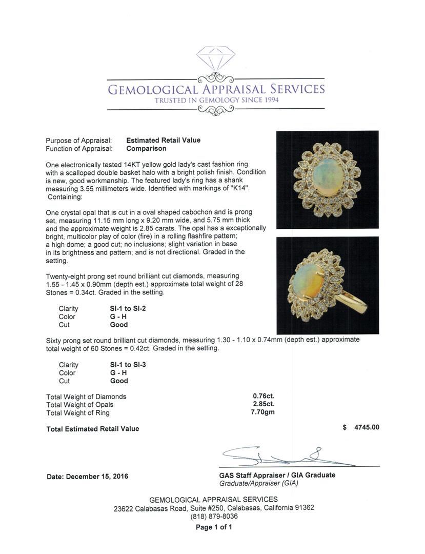 One electronically tested 14KT yellow gold lady's cast fashion ring with a scalloped double basket halo with a bright polish finish. The featured lady's ring has a shank measuring 3.55 millimeters wide. Identified with markings of 'K14'. Condition is new, good workmanship. Containing: One crystal opal that is cut in a oval shaped cabochon and is prong set, measuring 11.15 mm long x 9.20 mm wide, and 5.75 mm thick and the approximate weight is 2.85 carats. The opal has a exceptionally bright, multicolor play of color (fire) in a rolling flashfire pattern; a high dome; a good cut; no inclusions; slight variation in base in its brightness and pattern; and is not directional. Graded in the setting. Twenty-Eight prong set round brilliant cut diamonds, measuring 1.55 - 1.45 x 0.90mm (depth est.) approximate total weight of 28 Stones = 0.34ct. Graded in the setting. Clarity SI-1 to SI-2. Color: G - H Cut Good Sixty prong set round brilliant cut diamonds, measuring 1.30 - 1.10 x 0.74mm (depth est.) approximate total weight of 60 Stones = 0.42ct. Graded in the setting. Clarity SI-1 to SI-3. Color: G - H Cut Good. Total Weight of Diamonds 0.76ct.. Total Weight of Opals 2.85ct.. Total Weight of Ring 7.70gm. GAS Appraised.