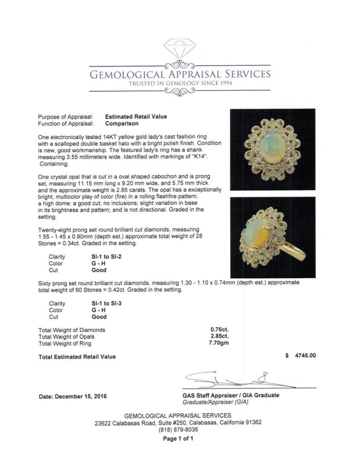 One electronically tested 14KT yellow gold lady's cast fashion ring with a scalloped double basket halo with a bright polish finish. The featured lady's ring has a shank measuring 3.55 millimeters wide. Identified with markings of 'K14'. Condition is new, good workmanship. Containing: One crystal opal that is cut in a oval shaped cabochon and is prong set, measuring 11.15 mm long x 9.20 mm wide, and 5.75 mm thick and the approximate weight is 2.85 carats. The opal has a exceptionally bright, multicolor play of color (fire) in a rolling flashfire pattern; a high dome; a good cut; no inclusions; slight variation in base in its brightness and pattern; and is not directional. Graded in the setting. Twenty-Eight prong set round brilliant cut diamonds, measuring 1.55 - 1.45 x 0.90mm (depth est.) approximate total weight of 28 Stones = 0.34ct. Graded in the setting. Clarity SI-1 to SI-2. Color: G - H Cut Good Sixty prong set round brilliant cut diamonds, measuring 1.30 - 1.10 x 0.74mm (depth est.) approximate total weight of 60 Stones = 0.42ct. Graded in the setting. Clarity SI-1 to SI-3. Color: G - H Cut Good. Total Weight of Diamonds 0.76ct.. Total Weight of Opals 2.85ct.. Total Weight of Ring 7.70gm. GAS Appraised.