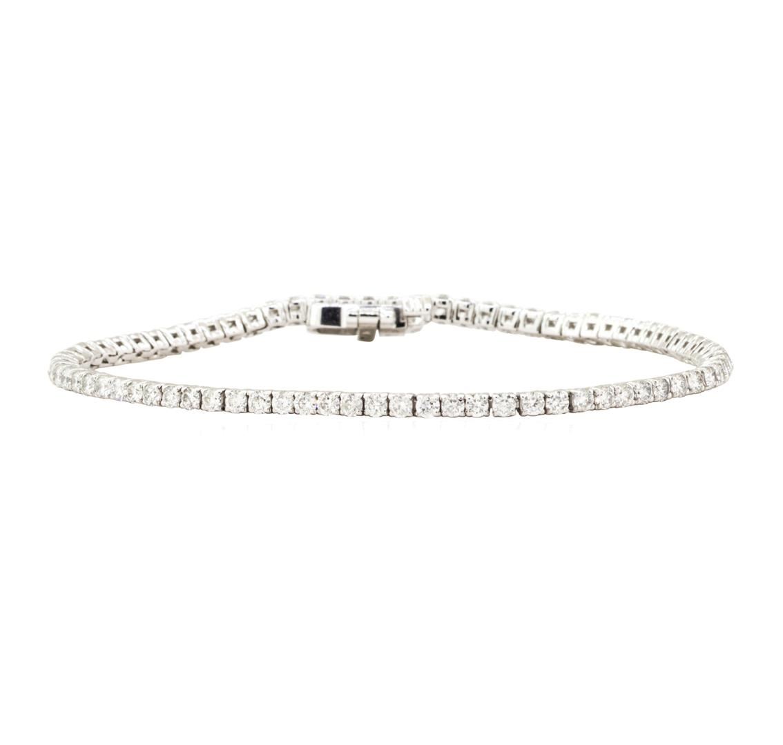 One electronically tested 14KT white gold lady's combination cast & assembled fashion straight line tennis bracelet with a tongue clasp with fold-under safety with a bright polish finish. The featured lady's tennis bracelet measures 7.00 inches in length. Identified with markings of '14K'. Condition is new, good workmanship. Containing: Seventy-Seven prong set round brilliant cut diamonds, measuring 2.20 - 2.10 x 1.32mm (depth est.) approximate total weight of 77 Stones = 2.85ct. Graded in the setting. Color G - H Clarity SI-1 to SI-2 Cut Very Good. Total Weight of Diamonds 2.85ct.. Total Weight of Tennis Bracelet 7.90gm GAS Appraised at $9120.00. GAS Appraised.