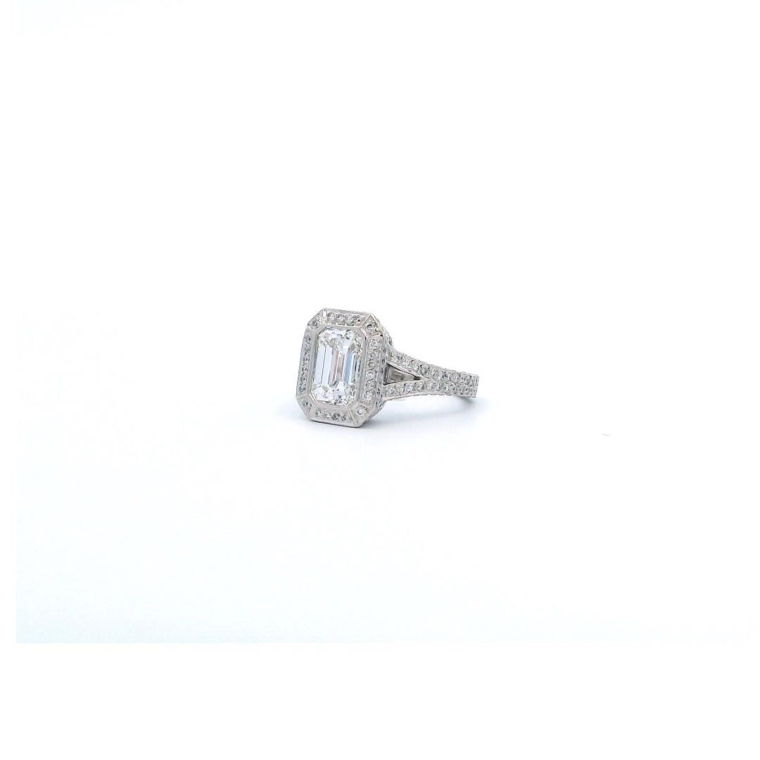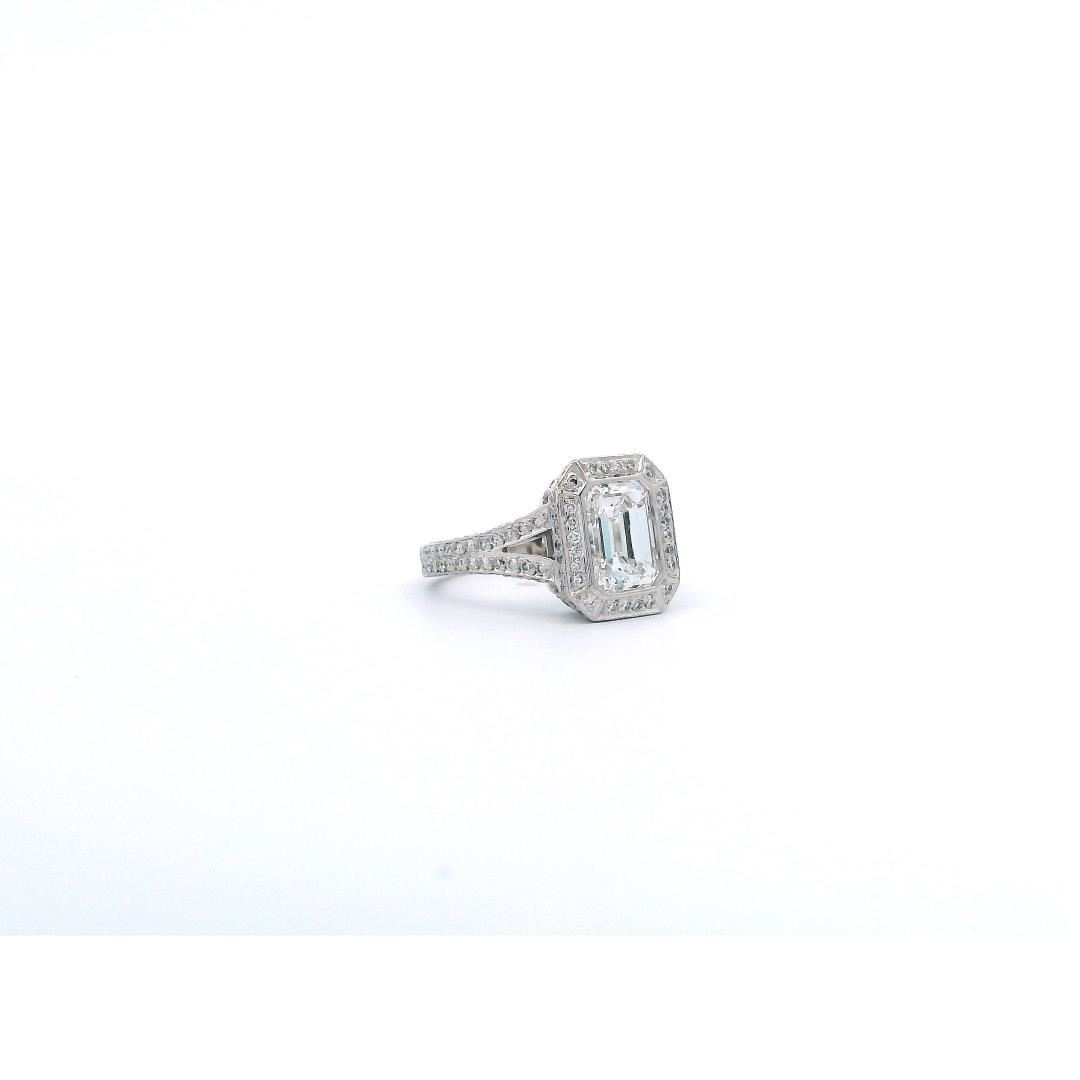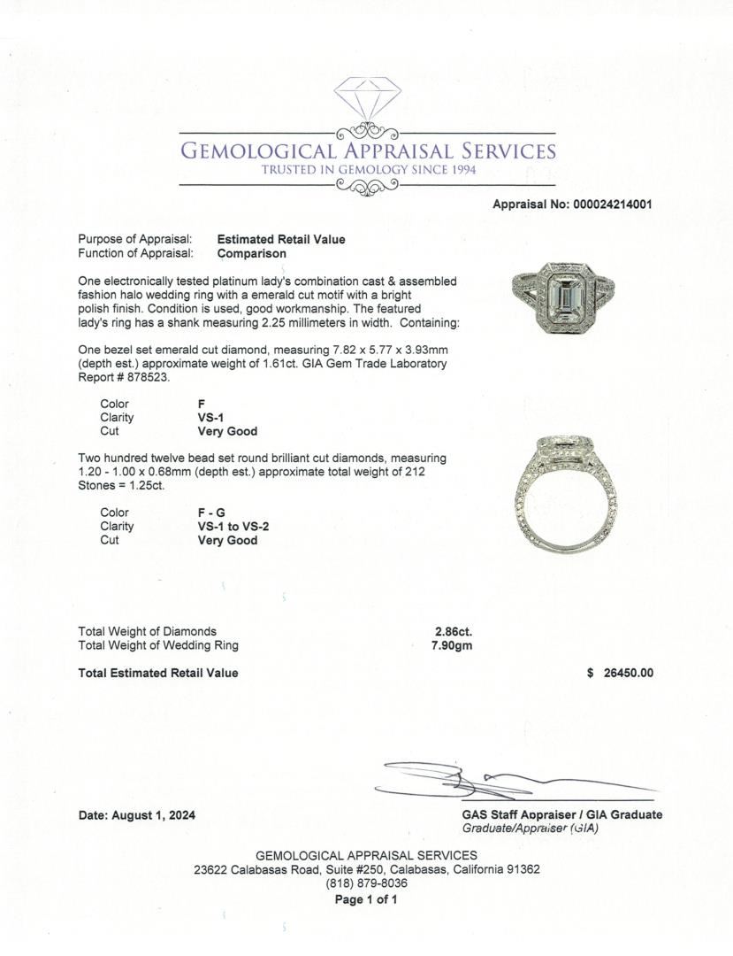 This ring features an exquisite 1.61ct emerald cut diamond with VS-1 clarity and F color. Beautiful craftsmanship and GIA certified! One electronically tested platinum lady's combination cast & assembled fashion halo wedding ring with an emerald cut motif with a bright polish finish. Condition is used, good workmanship. The featured lady's ring has a shank measuring 2.25 millimeters in width. Containing: One bezel set emerald cut diamond, measuring 7.82 x 5.77 x 3.93mm (depth est.) approximate weight of 1.61ct. GIA Gem Trade Laboratory Report # 878523. Color: F Clarity: VS-1 Cut: Very Good Two hundred twelve bead set round brilliant cut diamonds, measuring 1.20 - 1.00 x 0.68mm (depth est.) approximate total weight of 212 Stones = 1.25ct. Color: F-G Clarity: VS-1 to VS-2 Cut: Very Good Total Weight of Diamonds: 2.86ct. Total Weight of Wedding Ring: 7.90gm Total Estimated Retail Value: $26450.00 Appraisal No: 000024214001
