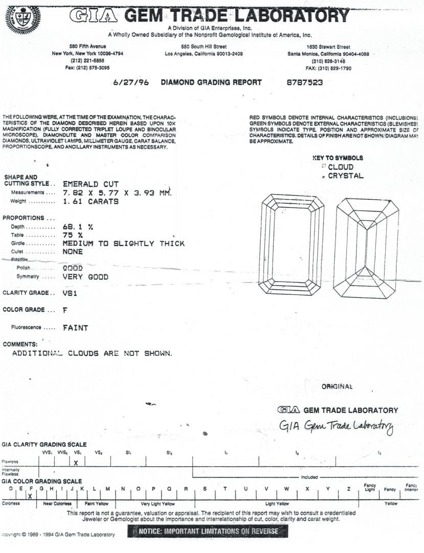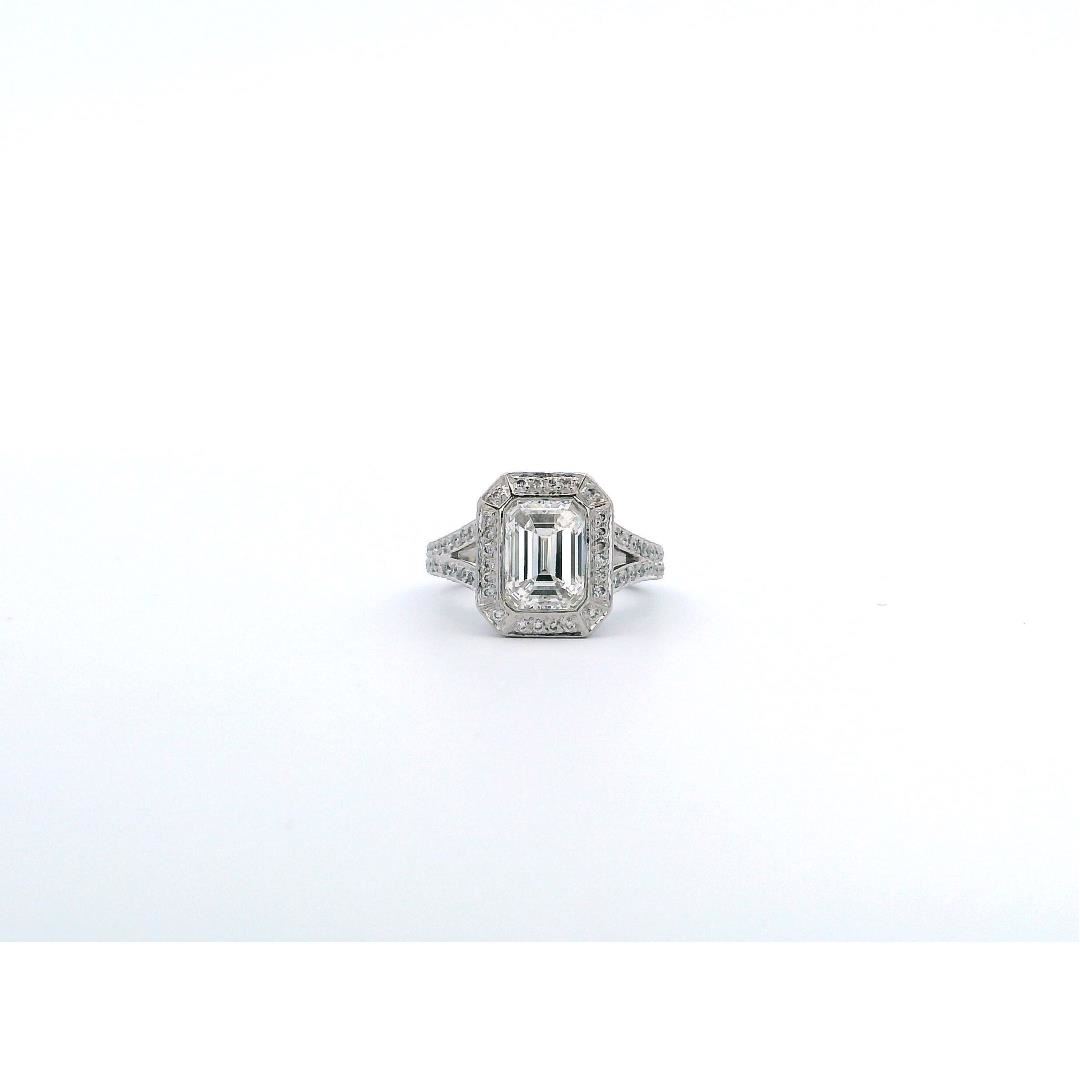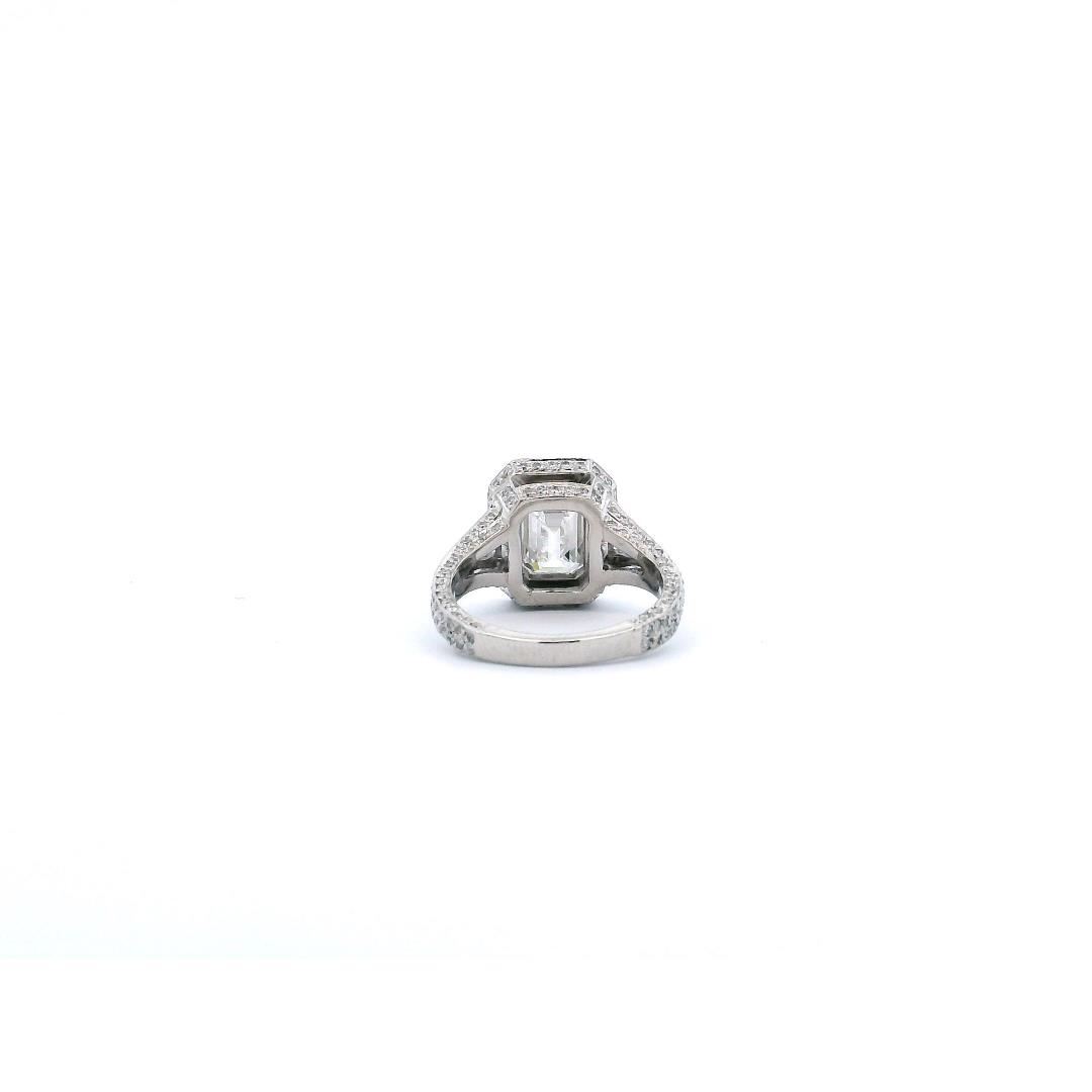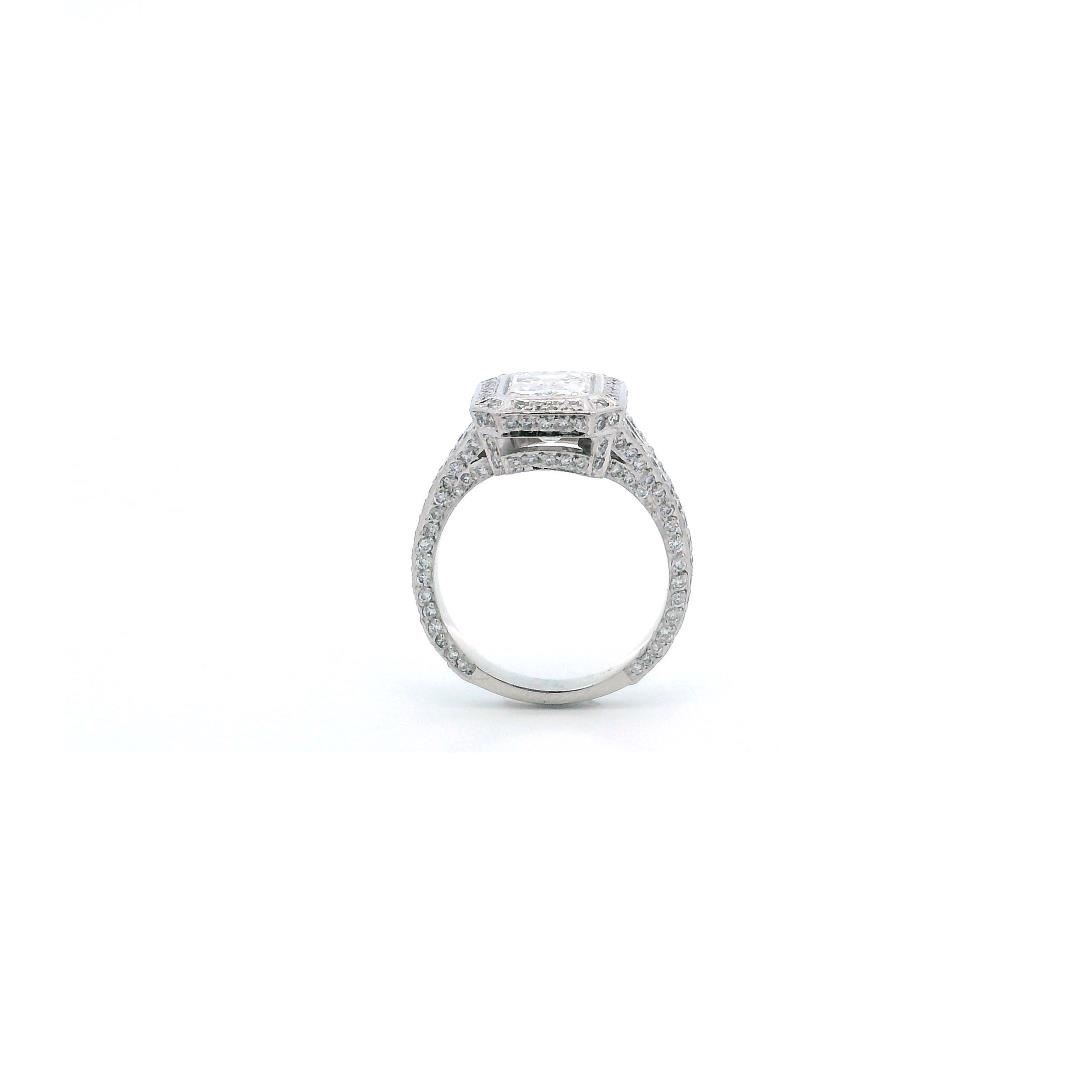 This ring features an exquisite 1.61ct emerald cut diamond with VS-1 clarity and F color. Beautiful craftsmanship and GIA certified! One electronically tested platinum lady's combination cast & assembled fashion halo wedding ring with an emerald cut motif with a bright polish finish. Condition is used, good workmanship. The featured lady's ring has a shank measuring 2.25 millimeters in width. Containing: One bezel set emerald cut diamond, measuring 7.82 x 5.77 x 3.93mm (depth est.) approximate weight of 1.61ct. GIA Gem Trade Laboratory Report # 878523. Color: F Clarity: VS-1 Cut: Very Good Two hundred twelve bead set round brilliant cut diamonds, measuring 1.20 - 1.00 x 0.68mm (depth est.) approximate total weight of 212 Stones = 1.25ct. Color: F-G Clarity: VS-1 to VS-2 Cut: Very Good Total Weight of Diamonds: 2.86ct. Total Weight of Wedding Ring: 7.90gm Total Estimated Retail Value: $26450.00 Appraisal No: 000024214001