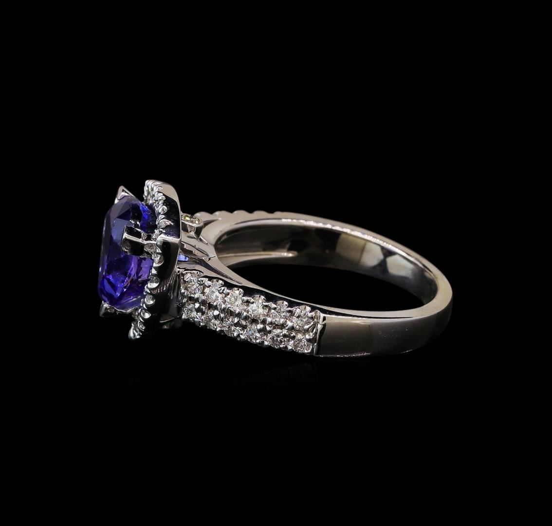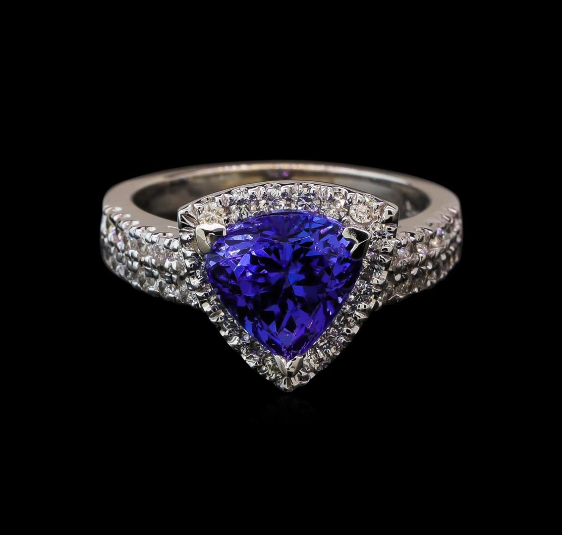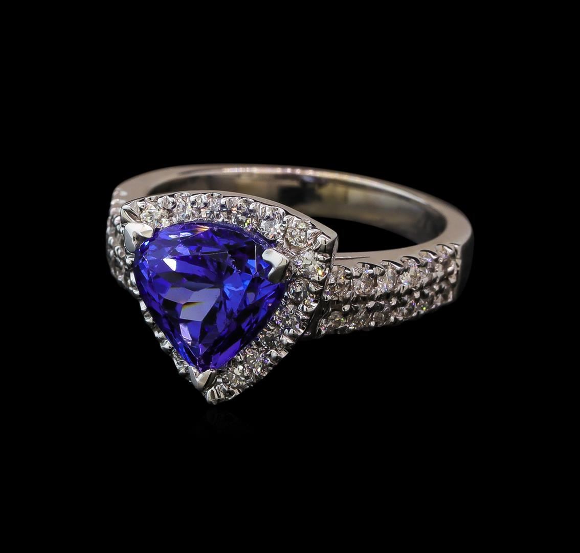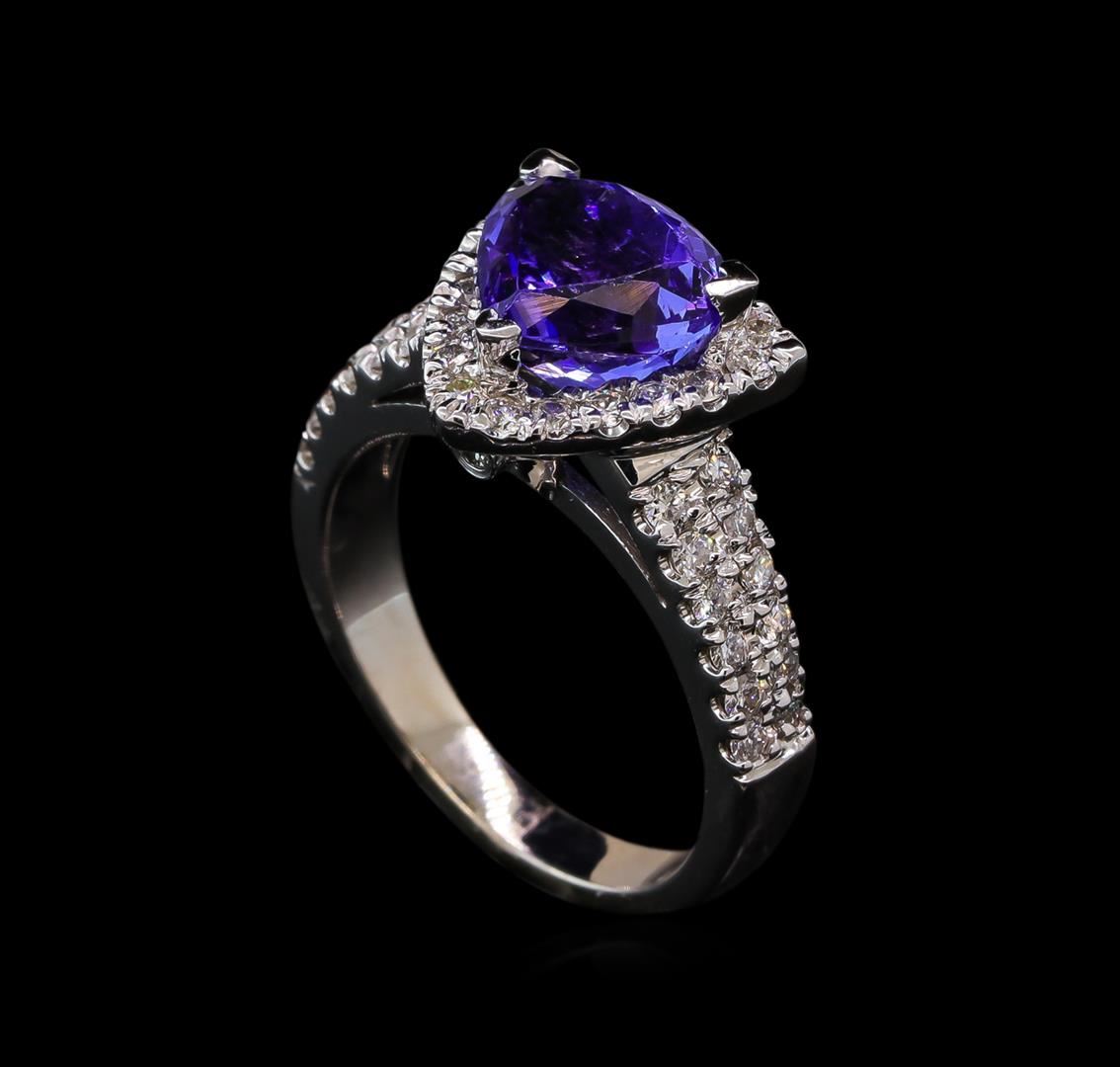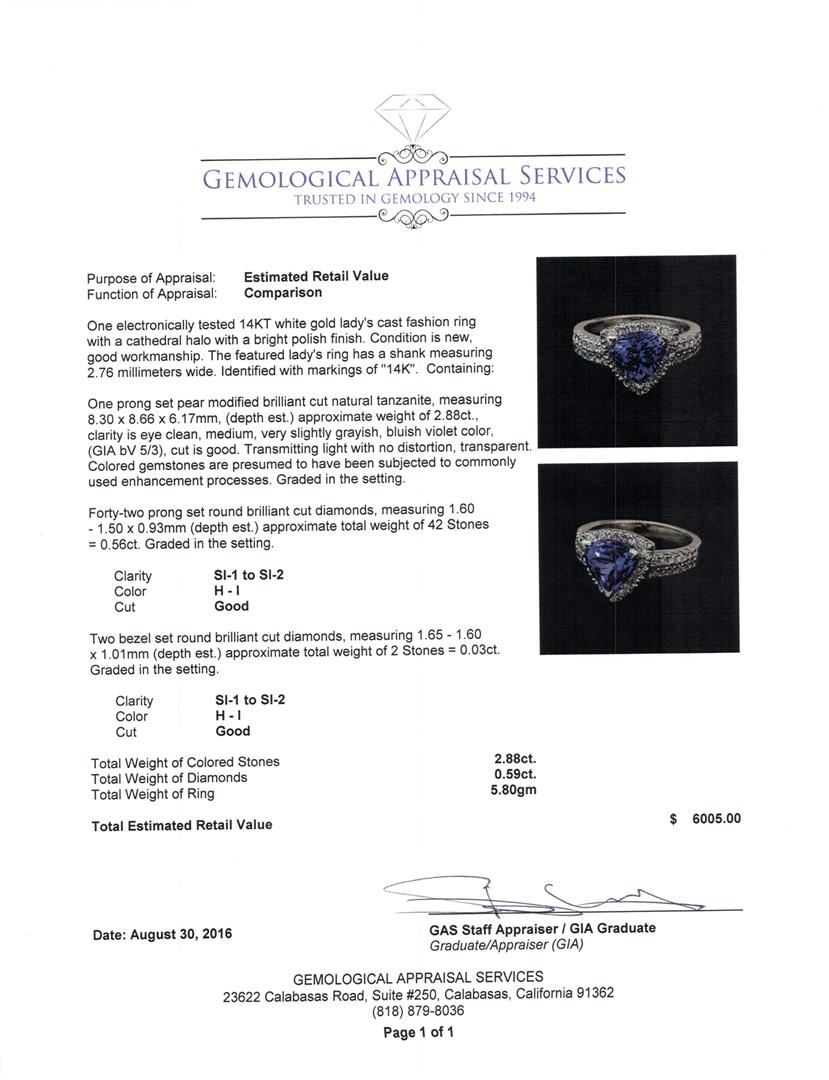 One electronically tested 14KT white gold lady's cast fashion ring with a cathedral halo with a bright polish finish. The featured lady's ring has a shank measuring 2.76 millimeters wide. Identified with markings of '14K'. Condition is new, good workmanship. Containing: One prong set pear modified brilliant cut natural tanzanite, measuring 8.30 x 8.66 x 6.17mm, (depth est.) approximate weight of 2.88ct., clarity is eye clean, medium, very slightly grayish, bluish violet color, (GIA bV 5/3), cut is good. Transmitting light with no distortion, transparent. Colored gemstones are presumed to have been subjected to commonly used enhancement processes. Graded in the setting. Forty-Two prong set round brilliant cut diamonds, measuring 1.60 - 1.50 x 0.93mm (depth est.) approximate total weight of 42 Stones = 0.56ct. Graded in the setting. Clarity SI-1 to SI-2. Color: H - I Cut Good Two bezel set round brilliant cut diamonds, measuring 1.65 - 1.60 x 1.01mm (depth est.) approximate total weight of 2 Stones = 0.03ct. Graded in the setting. Clarity SI-1 to SI-2. Color: H - I Cut Good. Total Weight of Colored Stones 2.88ct. Total Weight of Diamonds 0.59ct. Total Weight of Ring 5.80gm.