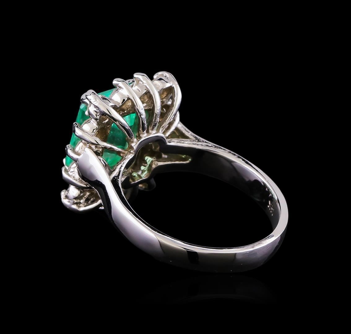 One electronically tested 14KT white gold lady's cast fashion ring with a cathedral basket halo with a bright polish finish. The featured lady's has a shank measuring 3.18 millimeters in width. Identified with markings of "14K". Condition is new, good workmanship. Containing: One prong set emerald step cut natural emerald, measuring 9.65 x 8.03 x 5.24mm, (depth est.) approximate weight of 2.90ct., clarity is slightly included, medium, moderately strong, green color, (GIA G 5/4), cut is very good. Transmitting light with a minimum of distortion, transparent. Indications of oil residue. Naturally occurring internal & external characteristics are present. Colored gemstones are presumed to have been subjected to commonly used enhancement processes. Graded in the setting. Fourteen prong set round brilliant cut diamonds, measuring 2.60 - 2.50 x 1.57mm (depth est.) approximate total weight of 14 Stones = 0.88ct. Graded in the setting. Clarity: VS-2 to SI-2. Color: H - I. Cut Good. Total Weight of Colored Stones 2.90ct. Total Weight of Diamonds 0.88ct. Total Weight of Ring 6.50gm. GAS Appraised.