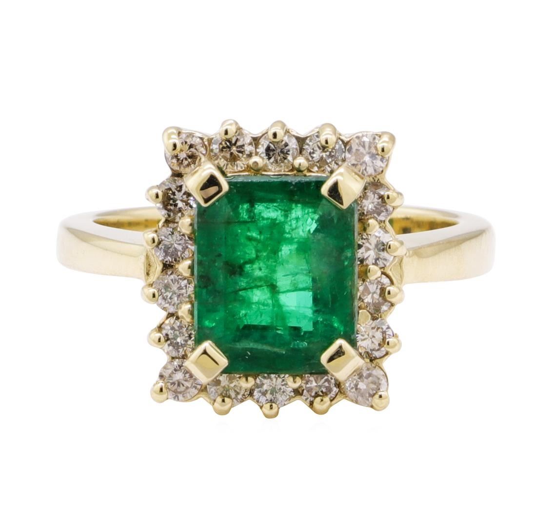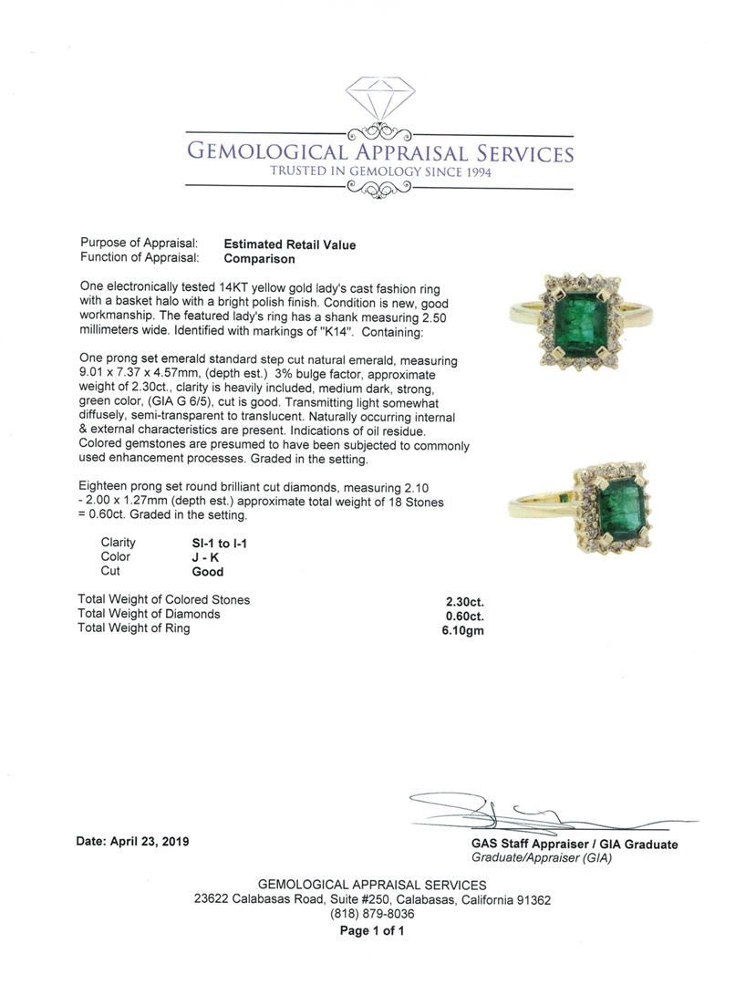 One electronically tested 14KT yellow gold lady's cast fashion ring with a basket halo with a bright polish finish. Condition is new, good workmanship. The featuredlasy's ring has a shank measuring 2.50 millimeters wide. Identifies with markings of "K14". Containing: One prong set emerald standard step cut natural emerald, measuring 9.01x7.37x4.57mm (depth est.) 3% bulge factor, approximate weight of 2.30ct., clarity is heavily included, meduim dark, strong, green color, (GIA G6/5), cut is good. Transmitting light somewhat diffusely, semi-transparent to translucent. Naturally occuring internal & external characteristics are present. Indications of oil residue. Colored gemstones are presumed to have been subjected to commonly used enhancment processes. Graded in the setting. Eighteen prong set round brilliant cut diamonds, measuring 2.10-2.00x1.27mm (depth est.) approximate total weight of 18 stones=0.60ct. graded in the setting. Clarity SI-1 to I1. Color J-k. Cut good. Total weight of colored stones 2.30ct. Total weight of diamonds 0.60ct. Total weight of ring 6.10gm. Total estimated retail value $5875.00 GAS Appraised.