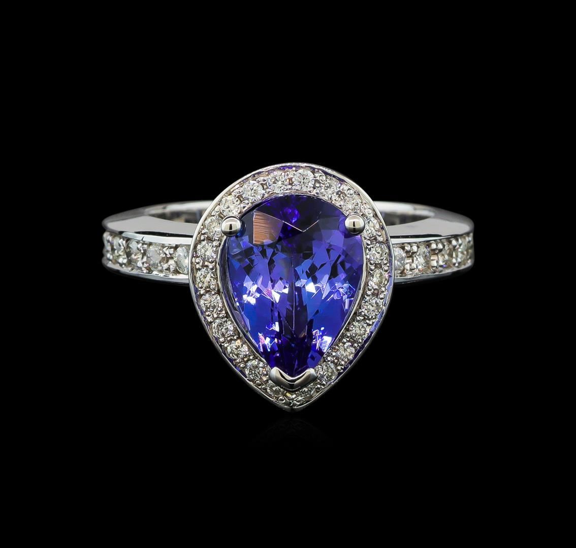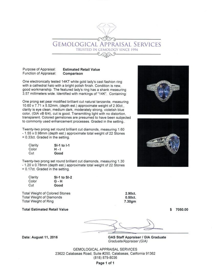 One electronically tested 14KT white gold lady's cast fashion ring with a cathedral halo with a bright polish finish. The featured lady's ring has a shank measuring 3.57 millimeters wide. Identified with markings of '14K'. Condition is new, good workmanship. Containing: One prong set pear modified brilliant cut natural tanzanite, measuring 10.60 x 7.71 x 5.52mm, (depth est.) approximate weight of 2.90ct., clarity is eye clean, medium dark, moderately strong, violetish blue color, (GIA vB 6/4), cut is good. Transmitting light with no distortion, transparent. Colored gemstones are presumed to have been subjected to commonly used enhancement processes. Graded in the setting. Twenty-Two prong set round brilliant cut diamonds, measuring 1.60 - 1.55 x 0.98mm (depth est.) approximate total weight of 22 Stones = 0.33ct. Graded in the setting. Clarity SI-1 to I-1. Color: H - I Cut Good Twenty-Two prong set round brilliant cut diamonds, measuring 1.30 - 1.20 x 0.78mm (depth est.) approximate total weight of 22 Stones = 0.17ct. Graded in the setting. Clarity SI-1 to SI-2. Color: G - H Cut Good. Total Weight of Colored Stones 2.90ct.. Total Weight of Diamonds 0.50ct.. Total Weight of Ring 7.30gm. GAS Appraised.