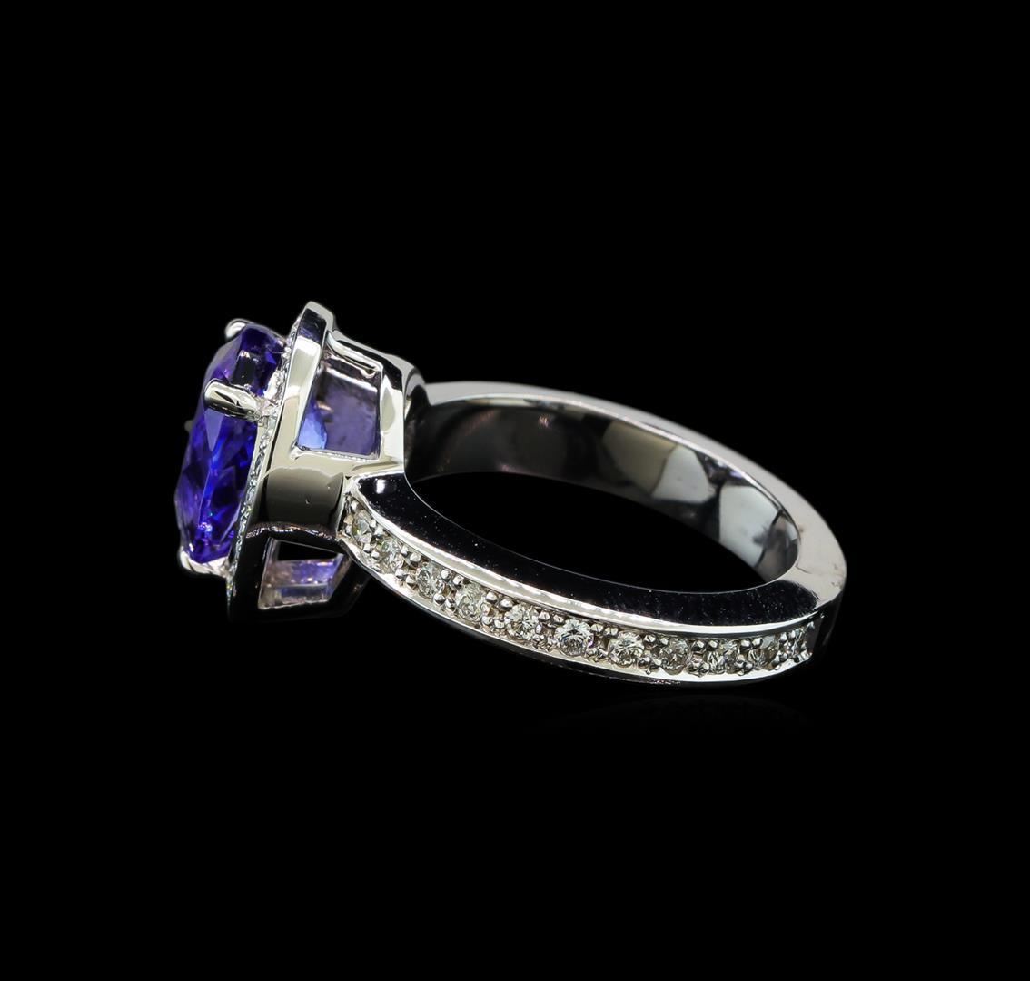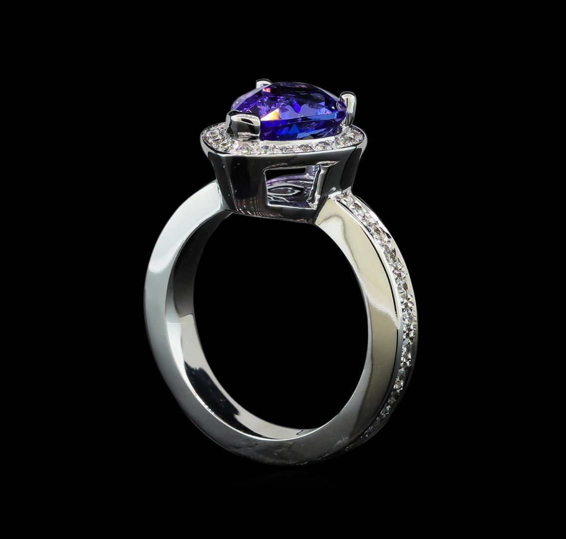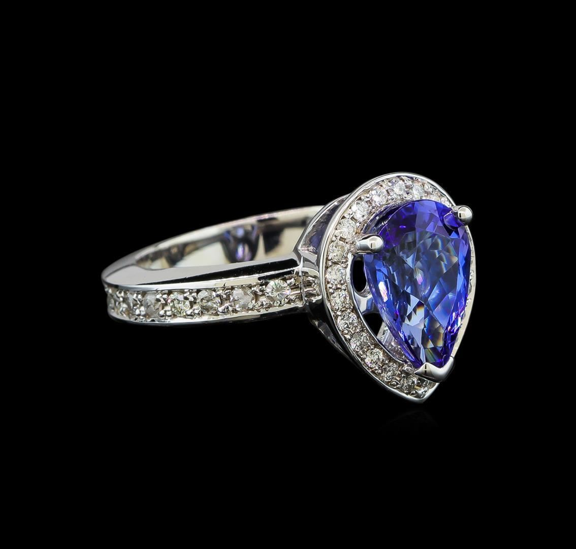 One electronically tested 14KT white gold lady's cast fashion ring with a cathedral halo with a bright polish finish. The featured lady's ring has a shank measuring 3.57 millimeters wide. Identified with markings of '14K'. Condition is new, good workmanship. Containing: One prong set pear modified brilliant cut natural tanzanite, measuring 10.60 x 7.71 x 5.52mm, (depth est.) approximate weight of 2.90ct., clarity is eye clean, medium dark, moderately strong, violetish blue color, (GIA vB 6/4), cut is good. Transmitting light with no distortion, transparent. Colored gemstones are presumed to have been subjected to commonly used enhancement processes. Graded in the setting. Twenty-Two prong set round brilliant cut diamonds, measuring 1.60 - 1.55 x 0.98mm (depth est.) approximate total weight of 22 Stones = 0.33ct. Graded in the setting. Clarity SI-1 to I-1. Color: H - I Cut Good Twenty-Two prong set round brilliant cut diamonds, measuring 1.30 - 1.20 x 0.78mm (depth est.) approximate total weight of 22 Stones = 0.17ct. Graded in the setting. Clarity SI-1 to SI-2. Color: G - H Cut Good. Total Weight of Colored Stones 2.90ct.. Total Weight of Diamonds 0.50ct.. Total Weight of Ring 7.30gm. GAS Appraised.