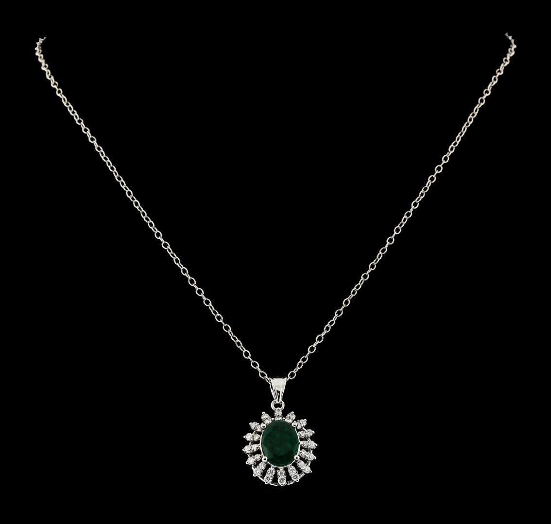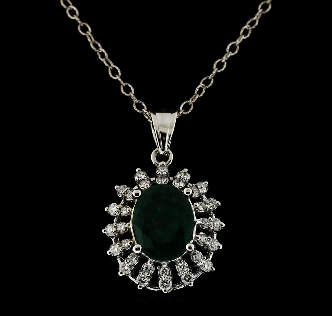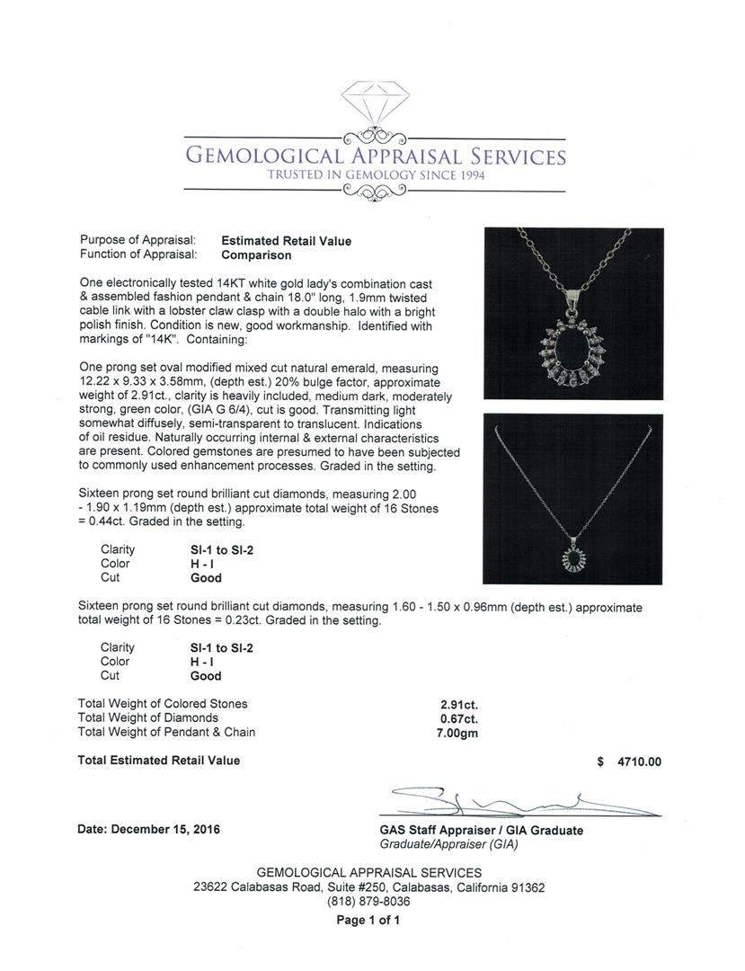 One electronically tested 14KT white gold lady's combination cast & assembled fashion pendant & chain 18.0' long, 1.9mm twisted cable link with a lobster claw clasp with a double halo with a bright polish finish. Identified with markings of '14K'. Condition is new, good workmanship. Containing: One prong set oval modified mixed cut natural emerald, measuring 12.22 x 9.33 x 3.58mm, (depth est.) 20%. bulge factor, approximate weight of 2.91ct., clarity is heavily included, medium dark, moderately strong, green color, (GIA G 6/4), cut is good. Transmitting light somewhat diffusely, semi-transparent to translucent. Indications of oil residue. Naturally occurring internal & external characteristics are present. Colored gemstones are presumed to have been subjected to commonly used enhancement processes. Graded in the setting. Sixteen prong set round brilliant cut diamonds, measuring 2.00 - 1.90 x 1.19mm (depth est.) approximate total weight of 16 Stones = 0.44ct. Graded in the setting. Clarity SI-1 to SI-2. Color: H - I Cut Good Sixteen prong set round brilliant cut diamonds, measuring 1.60 - 1.50 x 0.96mm (depth est.) approximate total weight of 16 Stones = 0.23ct. Graded in the setting. Clarity SI-1 to SI-2. Color: H - I Cut Good. Total Weight of Colored Stones 2.91ct.. Total Weight of Diamonds 0.67ct.. Total Weight of Pendant & Chain 7.00gm. GAS Appraised.