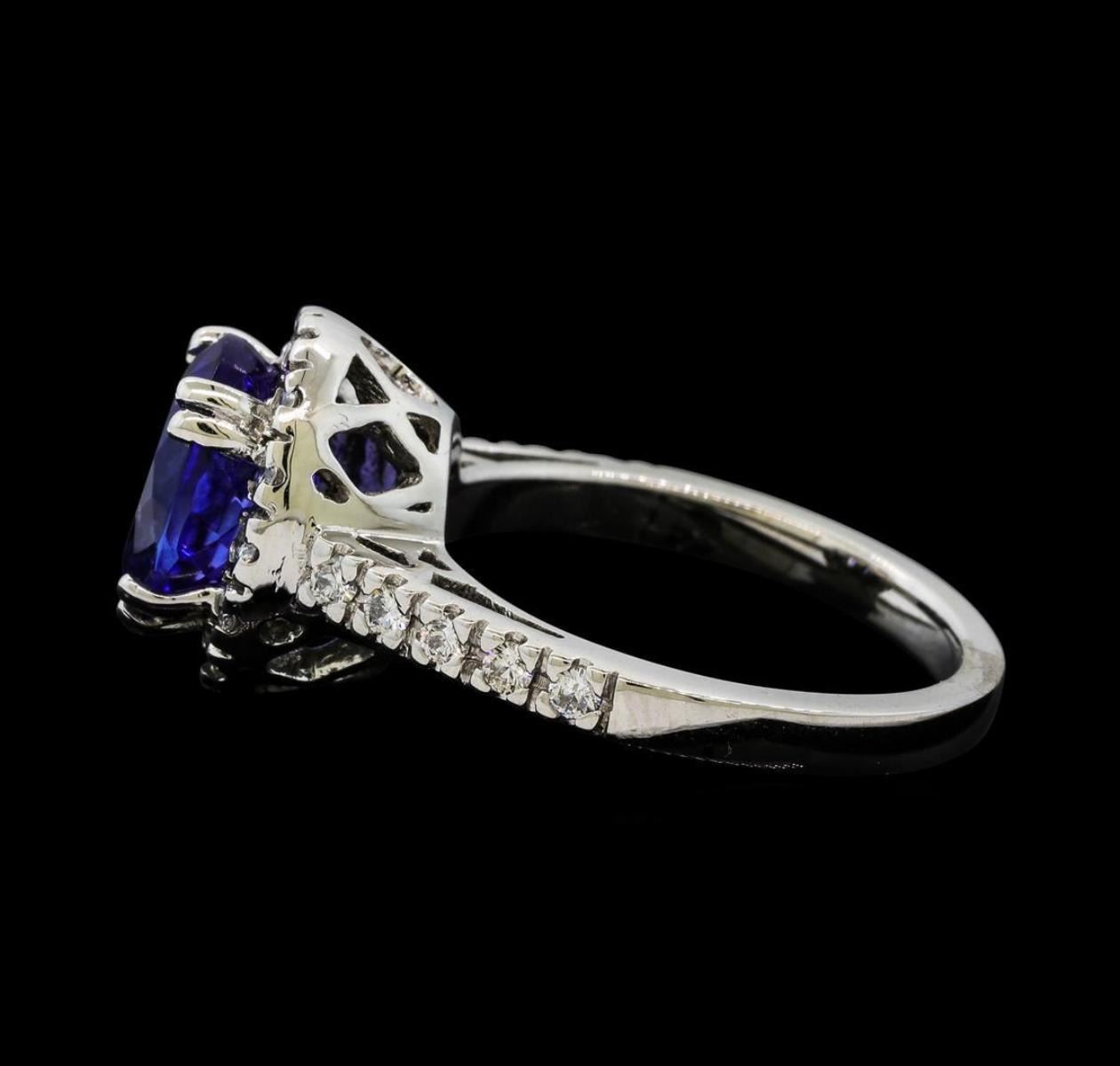 One electronically tested 14KT white gold lady's cast fashion ring with a cathedral shank with a halo with a bright polish finish. The featured lady's ring has a shank measuring 2.25 millimeters wide. Identified with markings of '14K'. Condition is new, good workmanship. Containing: One prong set oval modified brilliant cut natural tanzanite, measuring 9.56 x 7.50 x 5.28mm, (depth est.) 10%. bulge factor, approximate weight of 2.91ct., clarity is eye clean, medium dark, strong, violetish blue color, (GIA vB 6/5), cut is very good. Transmitting light with no distortion, transparent. Colored gemstones are presumed to have been subjected to commonly used enhancement processes. Graded in the setting. Twenty-Four prong set round brilliant cut diamonds, measuring 1.70 - 1.65 x 1.04mm (depth est.) approximate total weight of 24 Stones = 0.43ct. Graded in the setting. Clarity SI-1 to SI-2. Color: G - I Cut Good. Total Weight of Colored Stones 2.91ct.. Total Weight of Diamonds 0.43ct.. Total Weight of Ring 5.70gm. GAS Appraised.