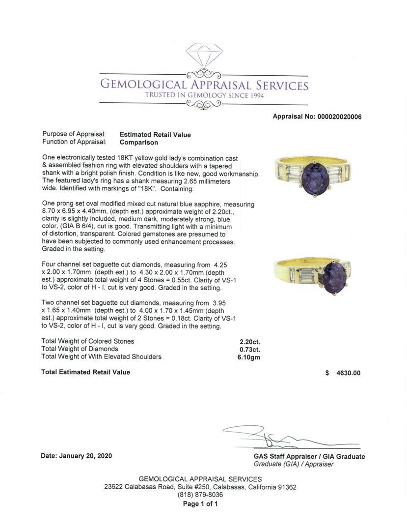 One electronically tested 18KT yellow gold lady's combination cast & assembled fashion ring with elevated shoulders with a tapered shank with a bright polish finish. The featured lady's ring has a shank measuring 2.65 millimeters wide. Identified with markings of '18K'. Condition is like new, good workmanship. Containing: One prong set oval modified mixed cut natural blue sapphire, measuring 8.70 x 6.95 x 4.40mm, (depth est.) approximate weight of 2.20ct., clarity is slightly included, medium dark, moderately strong, blue color, (GIA B 6/4), cut is good. Transmitting light with a minimum of distortion, transparent. Colored gemstones are presumed to have been subjected to commonly used enhancement processes. Graded in the setting. Four channel set baguette cut diamonds, measuring from 4.25 x 2.00 x 1.70mm (depth est.) to 4.30 x 2.00 x 1.70mm (depth est.) approximate total weight of 4 Stones = 0.55ct. Graded in the setting. Color H - I Clarity VS-1 to VS-2 Cut Very Good Two channel set baguette cut diamonds, measuring from 3.95 x 1.65 x 1.40mm (depth est.) to 4.00 x 1.70 x 1.45mm (depth est.) approximate total weight of 2 Stones = 0.18ct. Graded in the setting. Color H - I Clarity VS-1 to VS-2 Cut Very Good. Total Weight of Colored Stones 2.20ct.. Total Weight of Diamonds 0.73ct.. Total Weight of With Elevated Shoulders 6.10gm GAS Appraised at $4630.00. GAS Appraised.