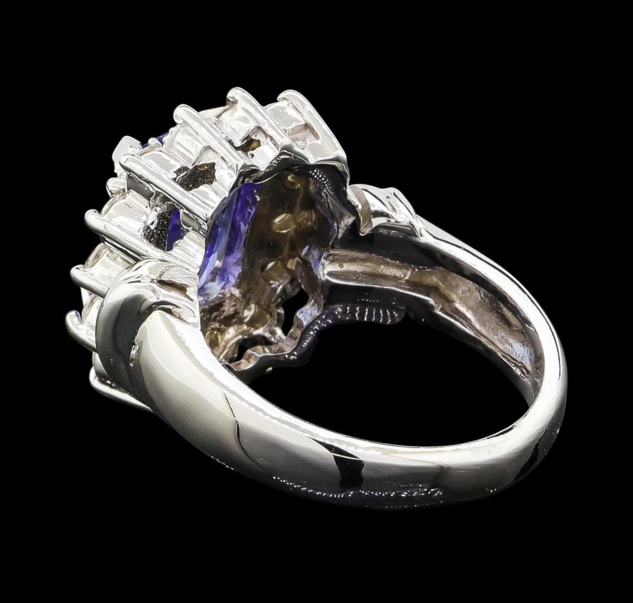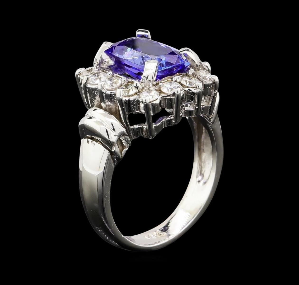 One electronically tested 14KT white gold lady's cast fashion ring with a cathedral shank with a basket halo with a bright polish finish. The featured lady's ring has two double-wire cuffs set on the shoulders and a shank measuring 3.50 millimeters wide. Identified with markings of '14K'. Condition is new, good workmanship. Containing: One prong set rectangular cushion modified brilliant cut natural tanzanite, measuring 9.96 x 7.00 x 4.81mm, (depth est.) 10%. bulge factor, approximate weight of 2.93ct., clarity is eye clean, medium, moderately strong, violetish blue color, (GIA vB 5/4), cut is good. Transmitting light with no distortion, transparent. Colored gemstones are presumed to have been subjected to commonly used enhancement processes. Graded in the setting. Ten prong set round brilliant cut diamonds, measuring 2.70 - 2.60 x 1.64mm (depth est.) approximate total weight of 10 Stones = 0.70ct. Graded in the setting. Clarity SI-1 to I-1. Color: H - I Cut Good Four prong set round brilliant cut diamonds, measuring 2.30 - 2.20 x 1.40mm (depth est.) approximate total weight of 4 Stones = 0.18ct. Graded in the setting. Clarity SI-1 to I-1. Color: H - I Cut Good. Total Weight of Colored Stones 2.93ct.. Total Weight of Diamonds 0.88ct.. Total Weight of Ring 8.50gm. GAS Appraised.