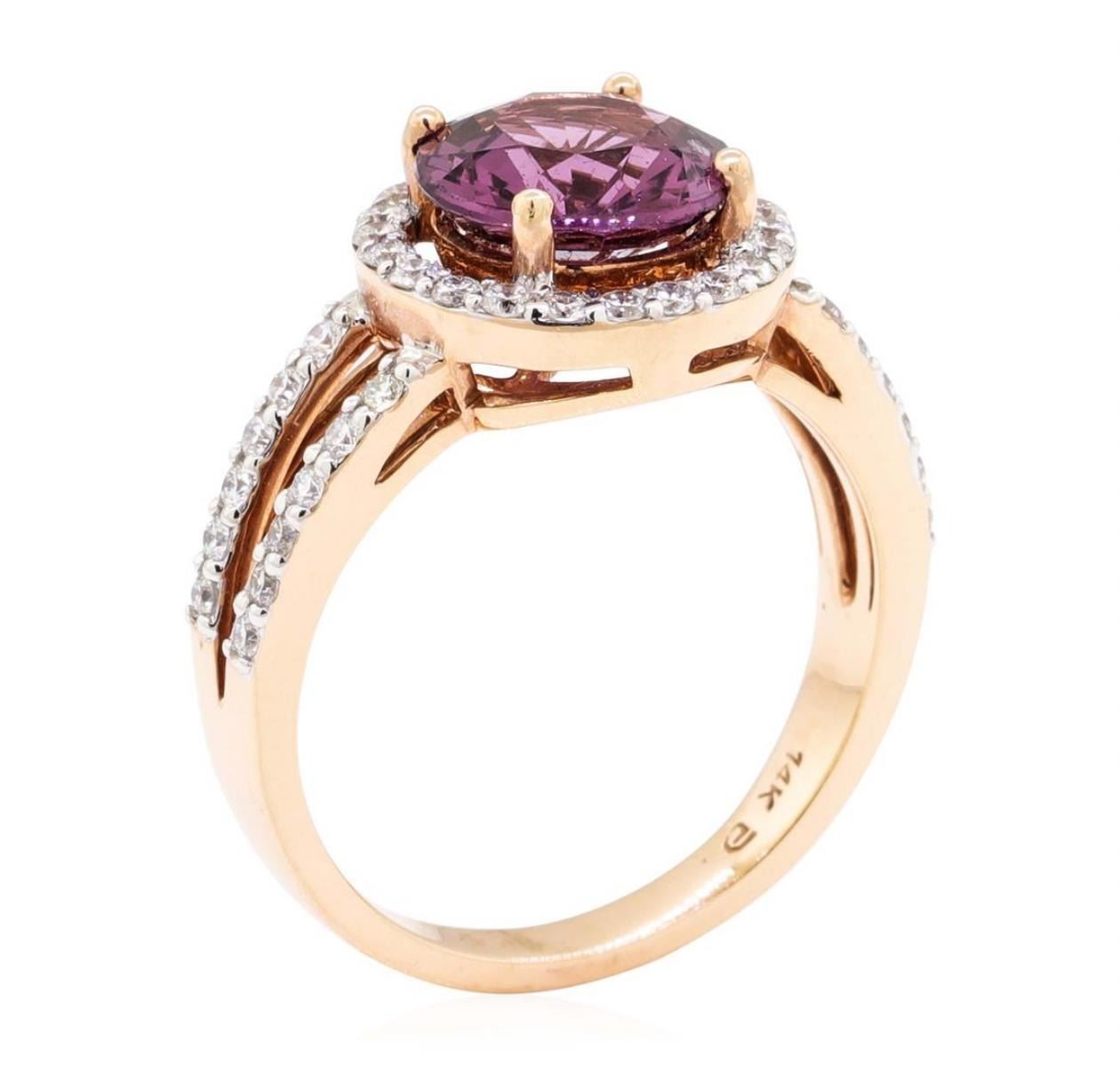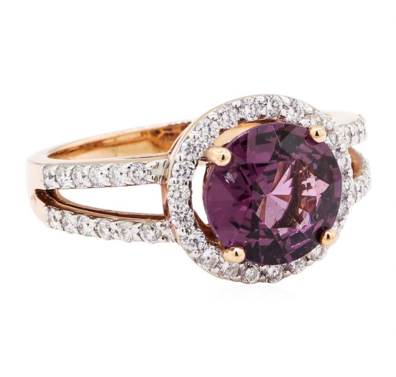 One electronically tested 14KT rose gold lady's cast fashion ring with a split shank halo with a bright polish finish. The featured lady's ring has a shank measuring 2.57 millimeters wide. Identified with markings of '14K'. Condition is new, good workmanship. Containing: One prong set round modified mixed cut natural lavender spinel, measuring 8.78 - 8.57 x 4.58 mm, (depth est.) approximate weight of 2.43ct., clarity is slightly included, medium, moderately strong, reddish purple color, (GIA rP 5/4), cut is very good. Transmitting light with a minimum of distortion, transparent. Colored gemstones are presumed to have been subjected to commonly used enhancement processes. Graded in the setting. Forty-Six prong set round brilliant cut diamonds, measuring 1.50 - 1.40 x 0.87mm (depth est.) approximate total weight of 46 Stones = 0.51ct. Graded in the setting. The area surrounding the diamonds has been rhodium plated. Color G - H Clarity VS-2 to SI-1 Cut Very Good. Total Weight of Colored Stones 2.43ct.. Total Weight of Diamonds 0.51ct.. Total Weight of Ring 4.60gm GAS Appraised at $6405.00. GAS Appraised.