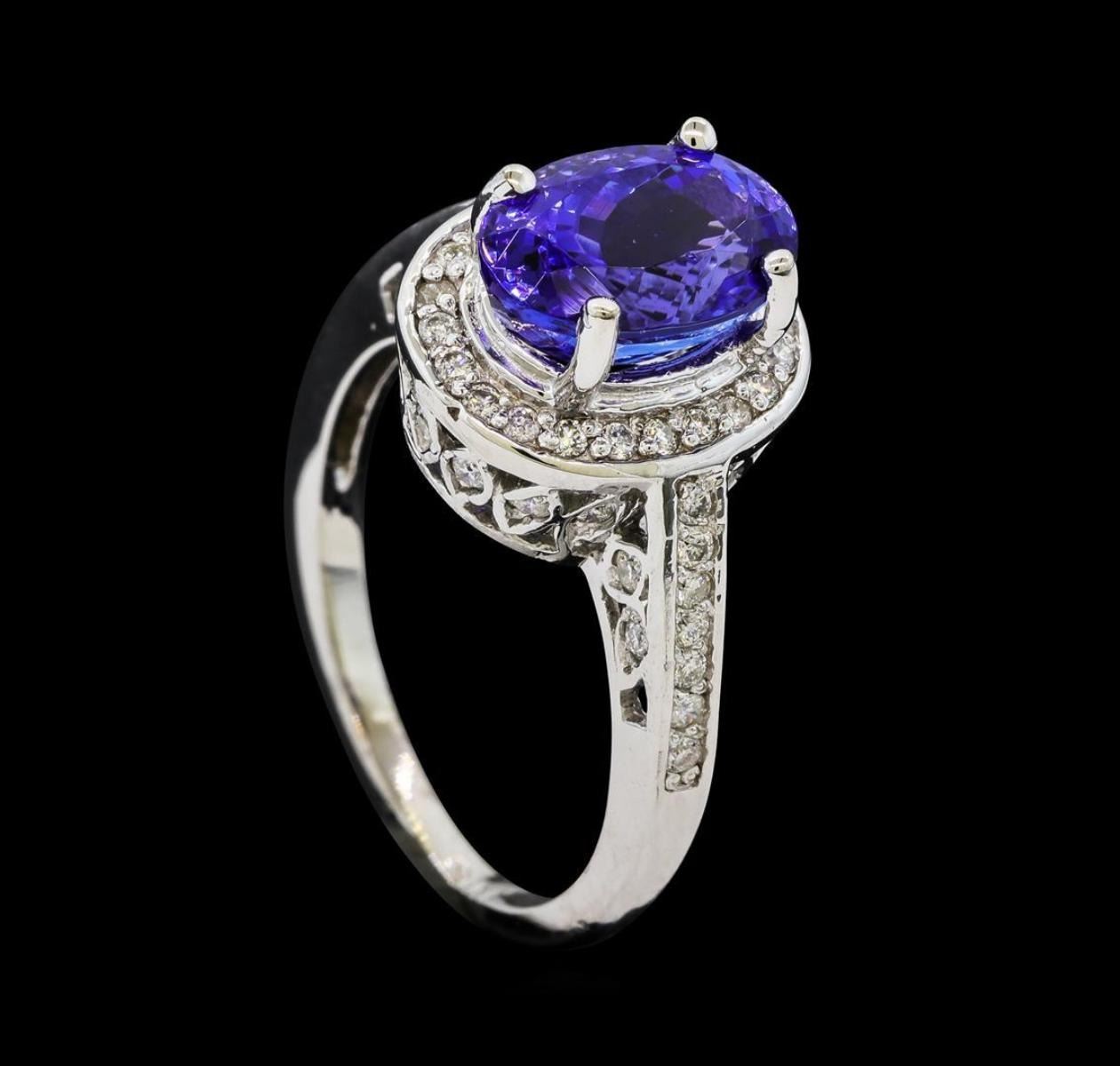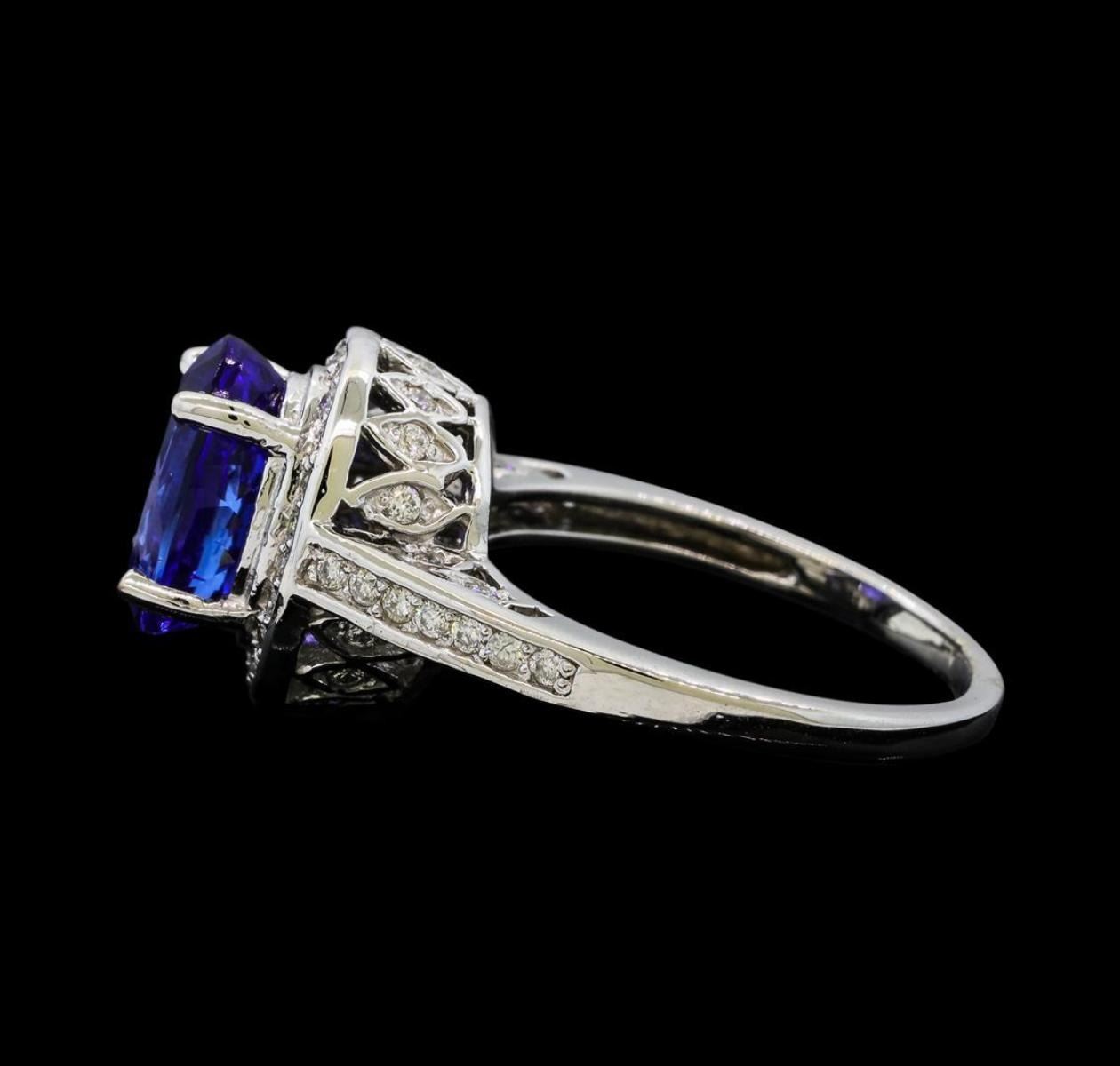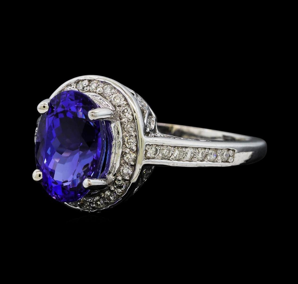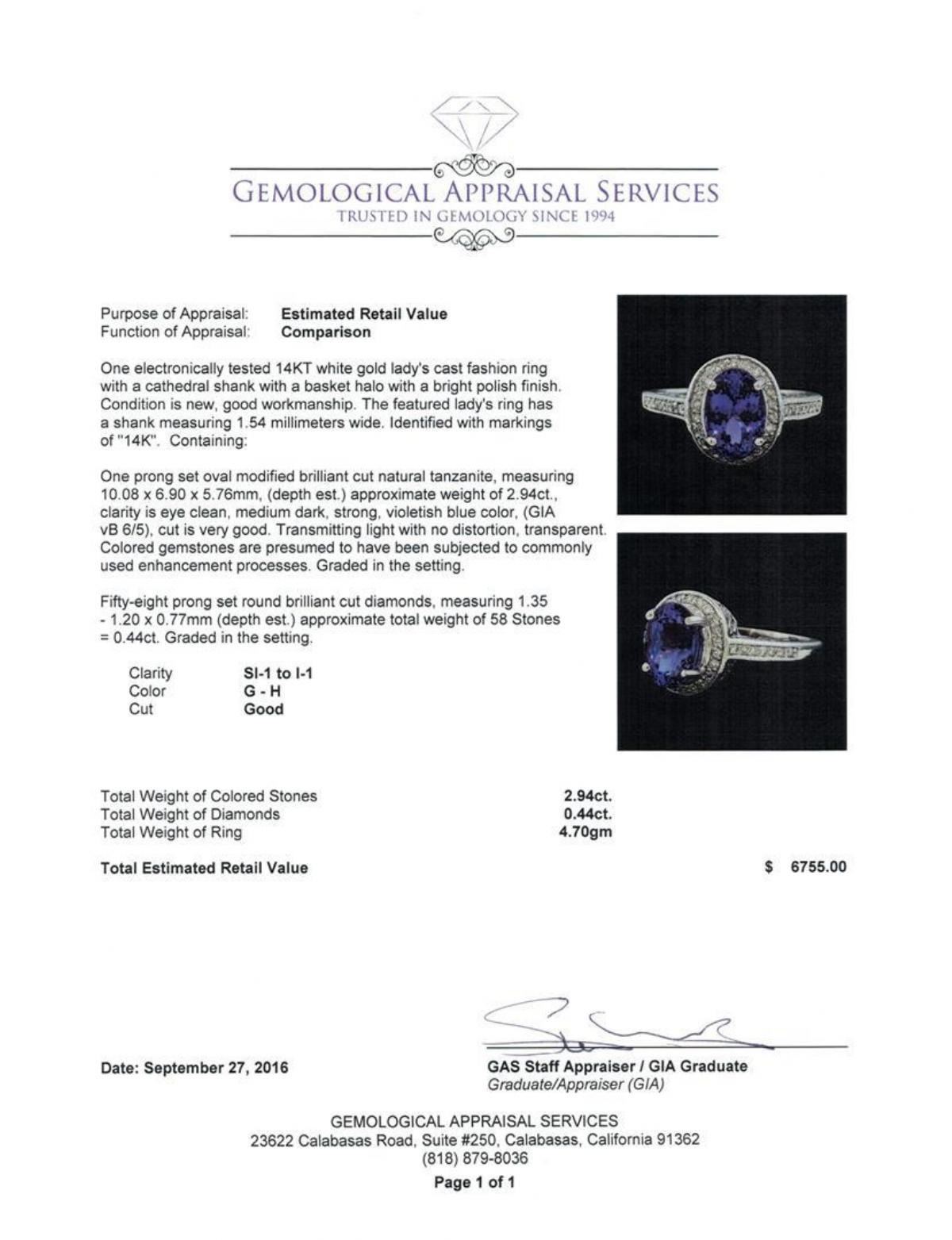 One electronically tested 14KT white gold lady's cast fashion ring with a cathedral shank with a basket halo with a bright polish finish. The featured lady's ring has a shank measuring 1.54 millimeters wide. Identified with markings of '14K'. Condition is new, good workmanship. Containing: One prong set oval modified brilliant cut natural tanzanite, measuring 10.08 x 6.90 x 5.76mm, (depth est.) approximate weight of 2.94ct., clarity is eye clean, medium dark, strong, violetish blue color, (GIA vB 6/5), cut is very good. Transmitting light with no distortion, transparent. Colored gemstones are presumed to have been subjected to commonly used enhancement processes. Graded in the setting. Fifty-Eight prong set round brilliant cut diamonds, measuring 1.35 - 1.20 x 0.77mm (depth est.) approximate total weight of 58 Stones = 0.44ct. Graded in the setting. Clarity SI-1 to I-1. Color: G - H Cut Good. Total Weight of Colored Stones 2.94ct.. Total Weight of Diamonds 0.44ct.. Total Weight of Ring 4.70gm.