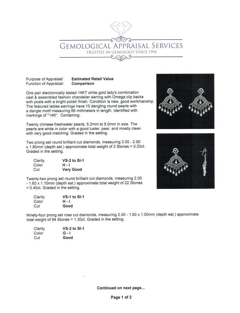 One pair electronically tested 14KT white gold lady's combination cast & assembled fashion chandelier earring with Omega clip backs with posts with a bright polish finish. The featured ladies earrings have 10 dangling round pearls with a dangle motif measuring 66 millimeters in length. Identified with markings of '14K'. Condition is new, good workmanship. Containing: Twenty Chinese freshwater pearls, 5.2mm to 5.0mm in size. The pearls are white in color with a good luster, pear, and mostly clean with very good matching. Graded in the setting. Two prong set round brilliant cut diamonds, measuring 3.00 - 2.90 x 1.80mm (depth est.) approximate total weight of 2 Stones = 0.20 ct. Graded in the setting. Clarity VS-2 to SI-1. Color: H - I Cut Very Good Twenty-Two prong set round brilliant cut diamonds, measuring 2.00 - 1.60 x 1.10mm (depth est.) approximate total weight of 22 Stones = 0.45ct. Graded in the setting. Clarity VS-1 to SI-1. Color: H - I Cut Good Ninety-Four prong set rose cut diamonds, measuring 2.00 - 1.60 x 1.00mm (depth est.) approximate total weight of 94 Stones = 1.30 ct. Graded in the setting. Clarity VS-2 to SI-1. Color: G - I Cut Good Two Hundred Eighty-Six pave' set round brilliant cut diamonds, measuring 1.00 - 0.95 x 0.60mm (depth est.) approximate total weight of 286 Stones = 1.00 ct. Graded in the setting. Clarity VS-1 to SI-1. Color: G - H Cut Good. Total Weight of Diamonds 2.95ct.. Total Weight of Chandelier Earring 29.70gm GAS Appraised.