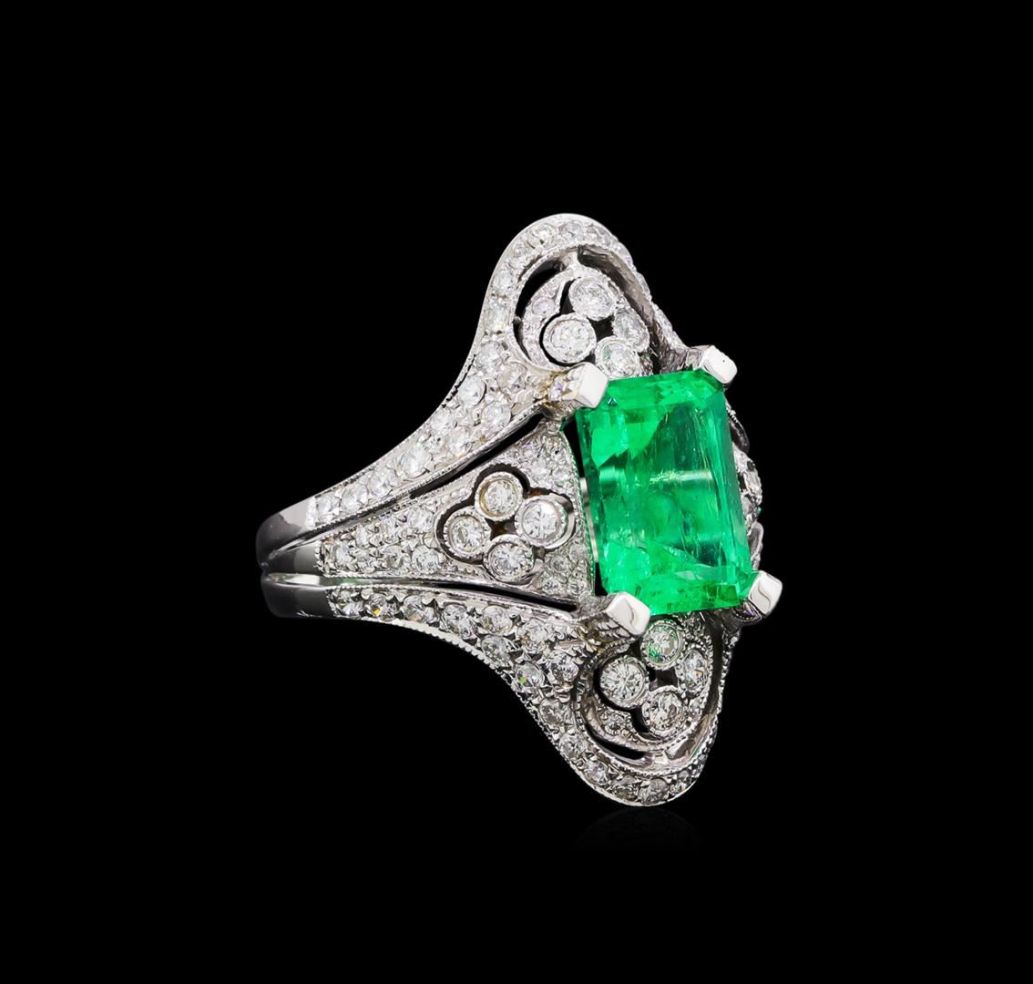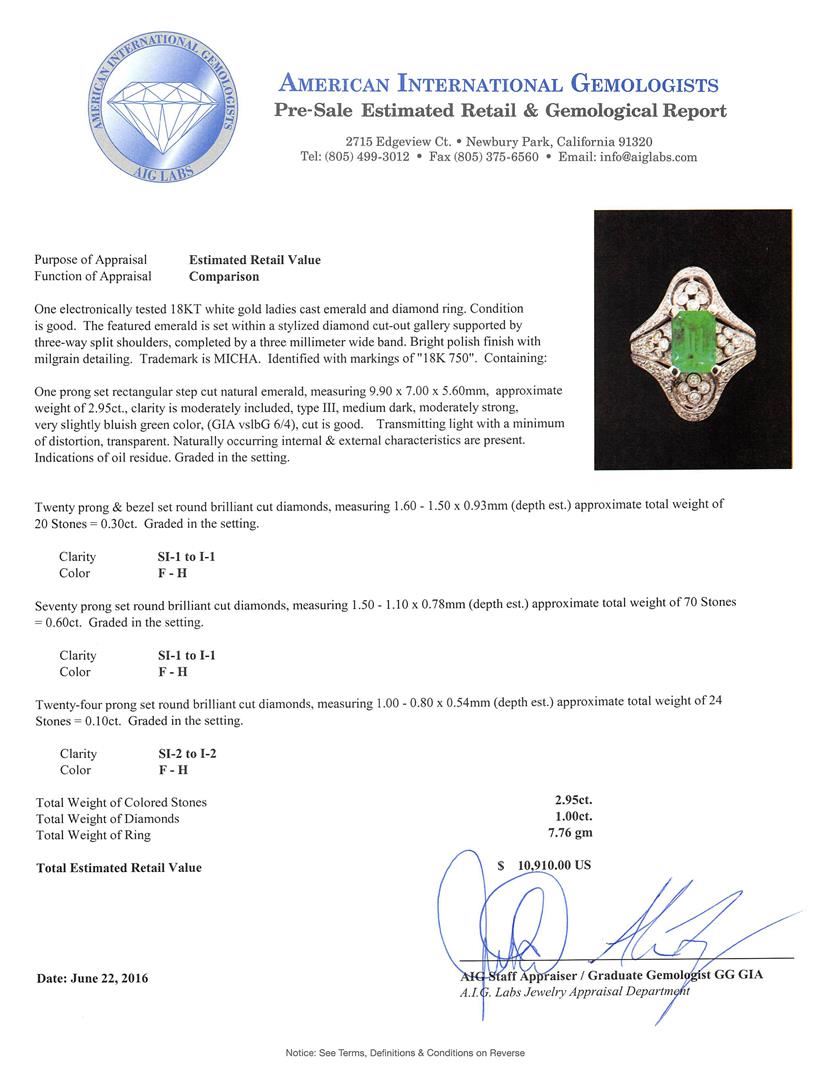 One electronically tested 18KT white gold ladies cast emerald and diamond ring. The featured emerald is set within a stylized diamond cut-out gallery supported by three-way split shoulders, completed by a three millimeter wide band. Bright polish finish with milgrain detailing. Trademark is MICHA. Identified with markings of "18K 750". Condition is good. Containing: One prong set rectangular step cut natural emerald, measuring 9.90 x 7.00. x 5.60mm, approximate weight of 2.95ct., clarity is moderately included, type III, medium dark, moderately strong, very slightly bluish green color, (GIA vslbG 6/4), cut is good. Transmitting light with a minimum of distortion, transparent. Naturally occurring internal & external characteristics are present. Indications of oil residue. Graded in the setting. Twenty prong & bezel set round brilliant cut diamonds, measuring 1.60 - 1.50 x 0.93mm (depth est.) approximate total weight of 20 Stones = 0.30ct. Graded in the setting. Clarity: SI-1 to I-1 . Color: F - H Seventy prong set round brilliant cut diamonds, measuring 1.50 - 1.10 x 0.78mm (depth est.) approximate total weight of 70 Stones = 0.60ct. Graded in the setting. Clarity: SI-1 to I-1 . Color: F - H Twenty-Four prong set round brilliant cut diamonds, measuring 1.00. - 0.80 x 0.54mm (depth est.) approximate total weight of 24 Stones = 0.10ct. Graded in the setting. Clarity: SI-2 to I-2 . Color: F - H. Total Weight of Colored Stones 2.95ct.. Total Weight of Diamonds 1.00ct.. Total Weight of Ring 7.76gm. AIG Appraised.