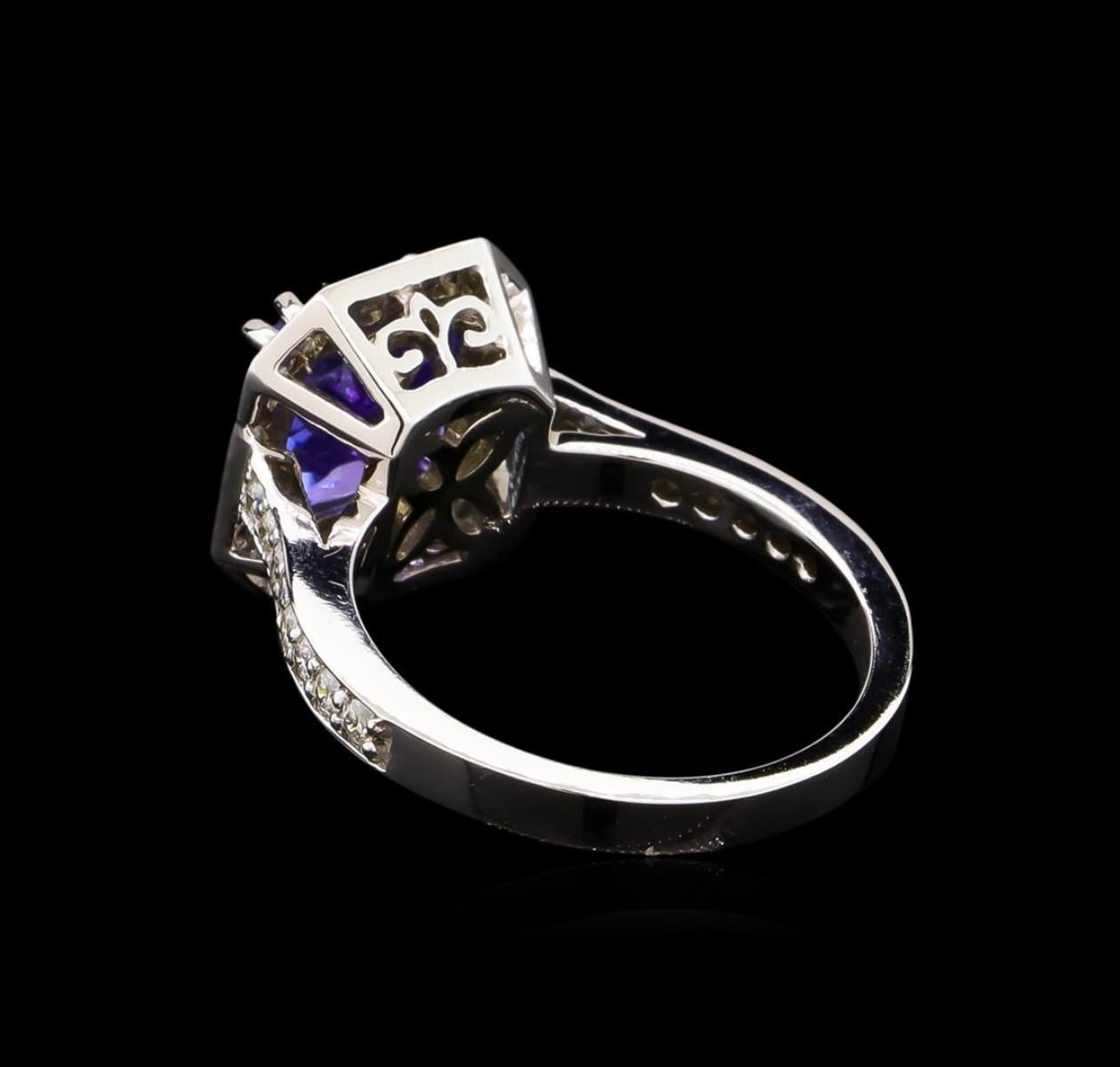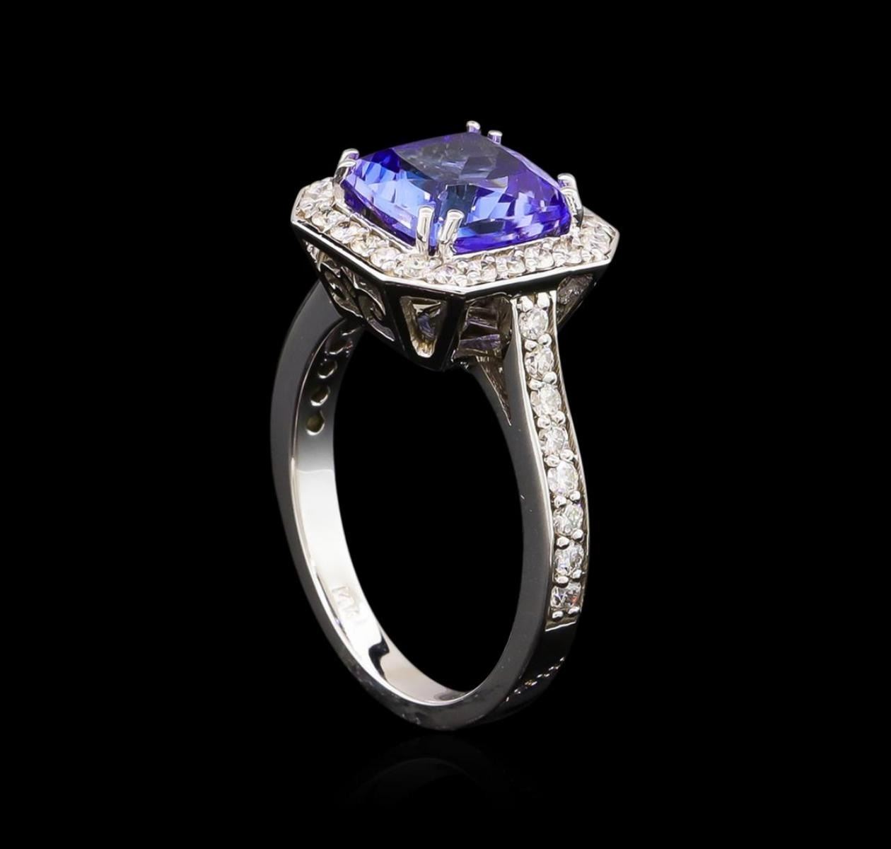 One electronically tested 14KT white gold lady's cast fashion ring with a square basket halo with a bright polish finish. The featured lady's ring has a shank measuring 2.27 millimeters wide. Identified with markings of "14K". Condition is new, good workmanship. Containing: One prong set square cushion modified brilliant cut natural tanzanite, measuring 8.42 x 8.32 x 5.44mm, approximate weight of 2.95ct., clarity is eye clean, type I, medium, very slightly grayish, bluish violet color, (GIA bV 5/3), cut is good. Transmitting light with no distortion, transparent. Colored gemstones are presumed to have been subjected to commonly used enhancement processes. Graded in the setting. Sixteen prong set round brilliant cut diamonds, measuring 1.60 - 1.55 x 0.98mm (depth est.) approximate total weight of 16 Stones = 0.24ct. Graded in the setting. Clarity: SI-1 to I-1. Color: H - I. Cut Good Sixteen prong set round brilliant cut diamonds, measuring 1.40 - 1.30 x 0.84mm (depth est.) approximate total weight of 16 Stones = 0.16ct. Graded in the setting. Clarity: SI-1 to I-1. Color: H - I. Cut Good. Total Weight of Colored Stones 2.95ct. Total Weight of Diamonds 0.40ct. Total Weight of Ring 4.85gm.