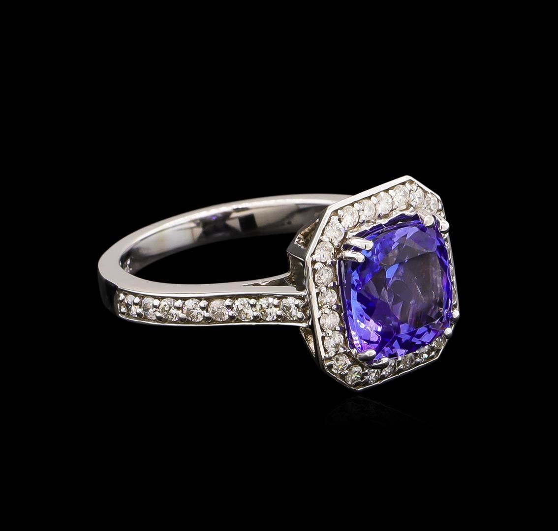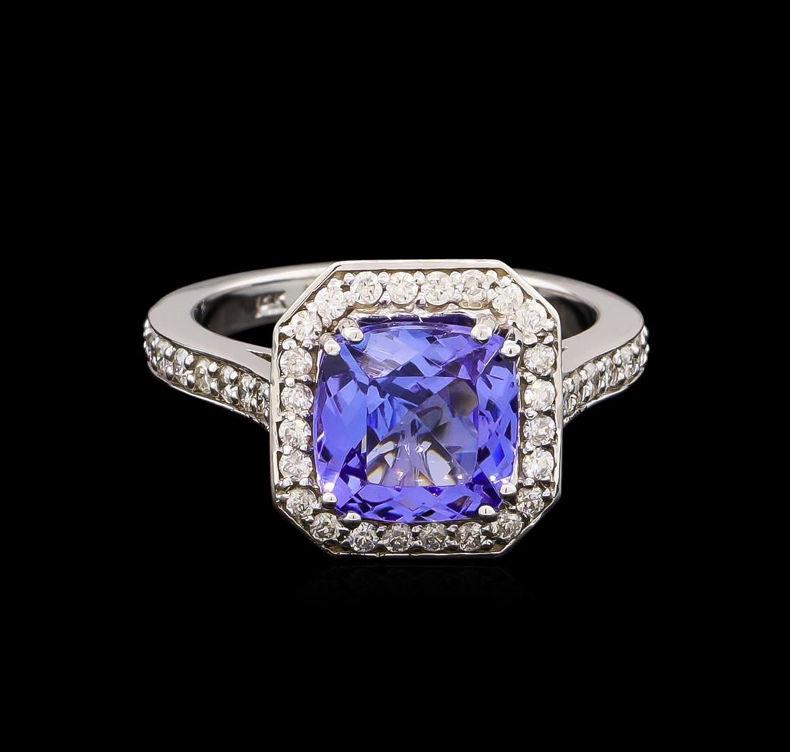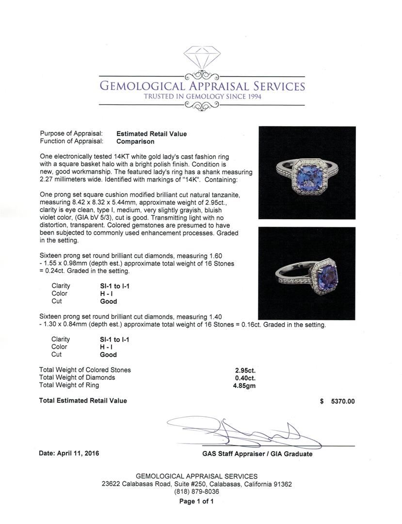 One electronically tested 14KT white gold lady's cast fashion ring with a square basket halo with a bright polish finish. The featured lady's ring has a shank measuring 2.27 millimeters wide. Identified with markings of "14K". Condition is new, good workmanship. Containing: One prong set square cushion modified brilliant cut natural tanzanite, measuring 8.42 x 8.32 x 5.44mm, approximate weight of 2.95ct., clarity is eye clean, type I, medium, very slightly grayish, bluish violet color, (GIA bV 5/3), cut is good. Transmitting light with no distortion, transparent. Colored gemstones are presumed to have been subjected to commonly used enhancement processes. Graded in the setting. Sixteen prong set round brilliant cut diamonds, measuring 1.60 - 1.55 x 0.98mm (depth est.) approximate total weight of 16 Stones = 0.24ct. Graded in the setting. Clarity: SI-1 to I-1. Color: H - I. Cut Good Sixteen prong set round brilliant cut diamonds, measuring 1.40 - 1.30 x 0.84mm (depth est.) approximate total weight of 16 Stones = 0.16ct. Graded in the setting. Clarity: SI-1 to I-1. Color: H - I. Cut Good. Total Weight of Colored Stones 2.95ct. Total Weight of Diamonds 0.40ct. Total Weight of Ring 4.85gm.