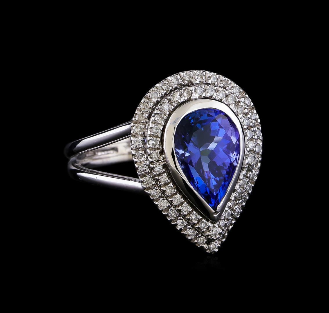 One electronically tested 14KT white gold lady's cast fashion ring with a split shank double basket halo with a bright polish finish. The featured lady's ring has a double shank measuring 3.17 millimeters in width. Identified with markings of "K14". Condition is new, good workmanship. Containing: One bezel set oval pear modified brilliant cut natural tanzanite, measuring 11.90 x 8.30 x 6.35mm, (depth est.) approximate weight of 2.96ct., clarity is eye clean, medium dark, very slightly grayish, bluish violet color, (GIA bV 6/3), cut is very good. Transmitting light with no distortion, transparent. Colored gemstones are presumed to have been subjected to commonly used enhancement processes. Graded in the setting. Sixty-Six prong set round brilliant cut diamonds, measuring 1.20 - 1.10 x 0.71mm (depth est.) approximate total weight of 66 Stones = 0.36ct. Graded in the setting. Clarity: SI-1 to SI-2. Color: H - I. Cut Good. Total Weight of Colored Stones 2.96ct. Total Weight of Diamonds 0.36ct. Total Weight of Ring 7.10gm. GAS Appraised.