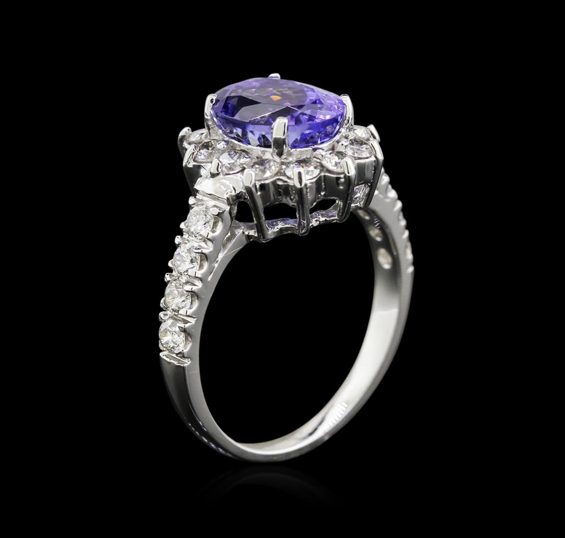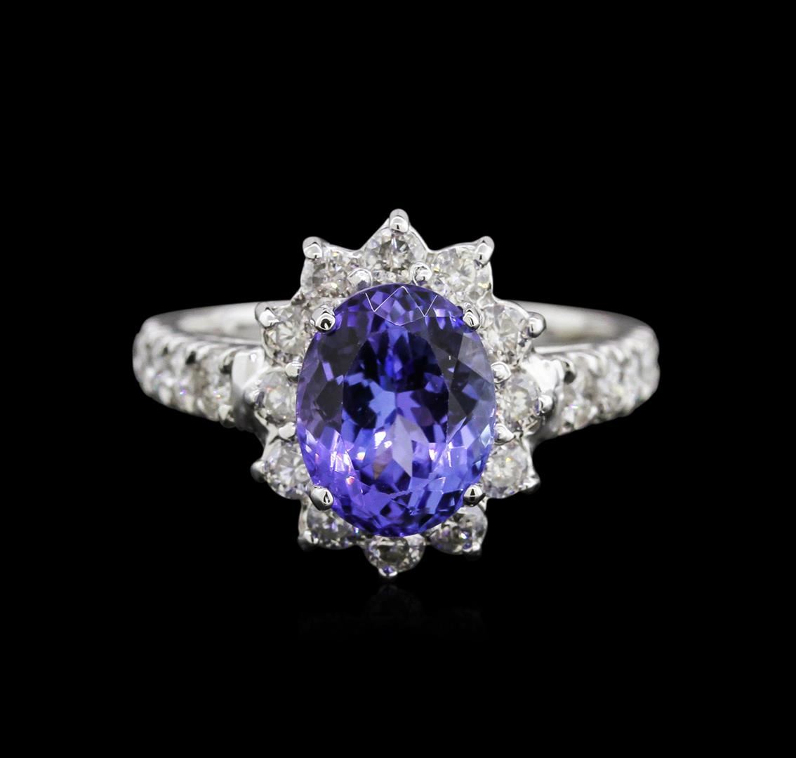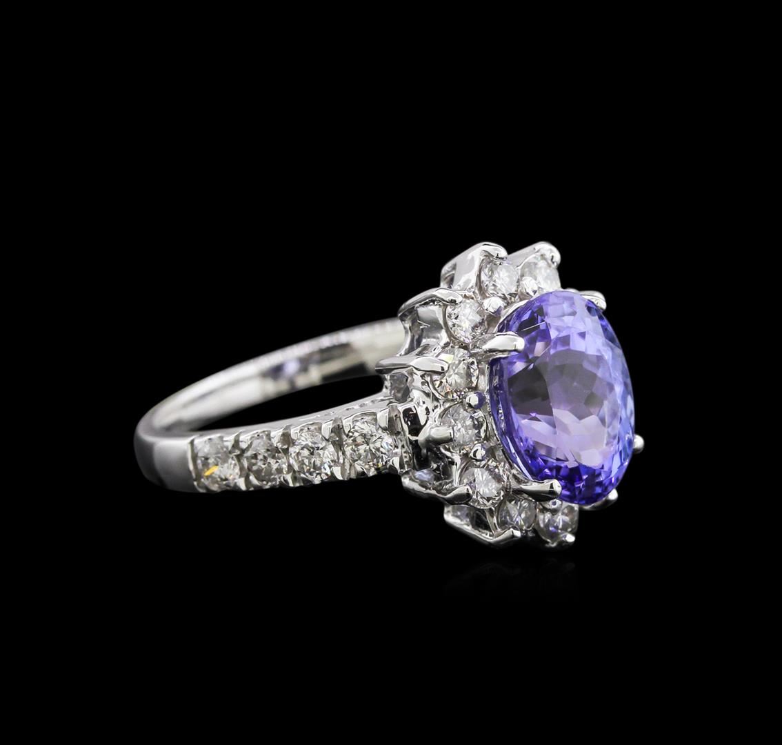 One electronically tested 14KT white gold lady's cast fashion ring with a halo with a bright polish finish. The featured lady's ring has a 1.95 millimeter wide shank. Identified with markings of "K14". Condition is new, good workmanship. Containing: One prong set oval modified brilliant cut natural tanzanite, measuring 9.58 x 7.51 x 5.71mm, approximate weight of 2.97ct., clarity is eye clean, type I, medium, very slightly grayish, bluish violet color, (GIA bV 5/3), cut is good. Transmitting light with no distortion, transparent. Colored gemstones are presumed to have been subjected to commonly used enhancement processes. Graded in the setting. Twenty prong set round brilliant cut diamonds, measuring 2.30 - 2.25 x 1.44mm (depth est.) approximate total weight of 20 Stones = 0.90ct. Graded in the setting. Clarity: SI-1 to I-1. Color: H - I. Cut Good. Total Weight of Colored Stones 2.97ct. Total Weight of Diamonds 0.90ct. Total Weight of Ring 4.60gm. GAS Appraised.