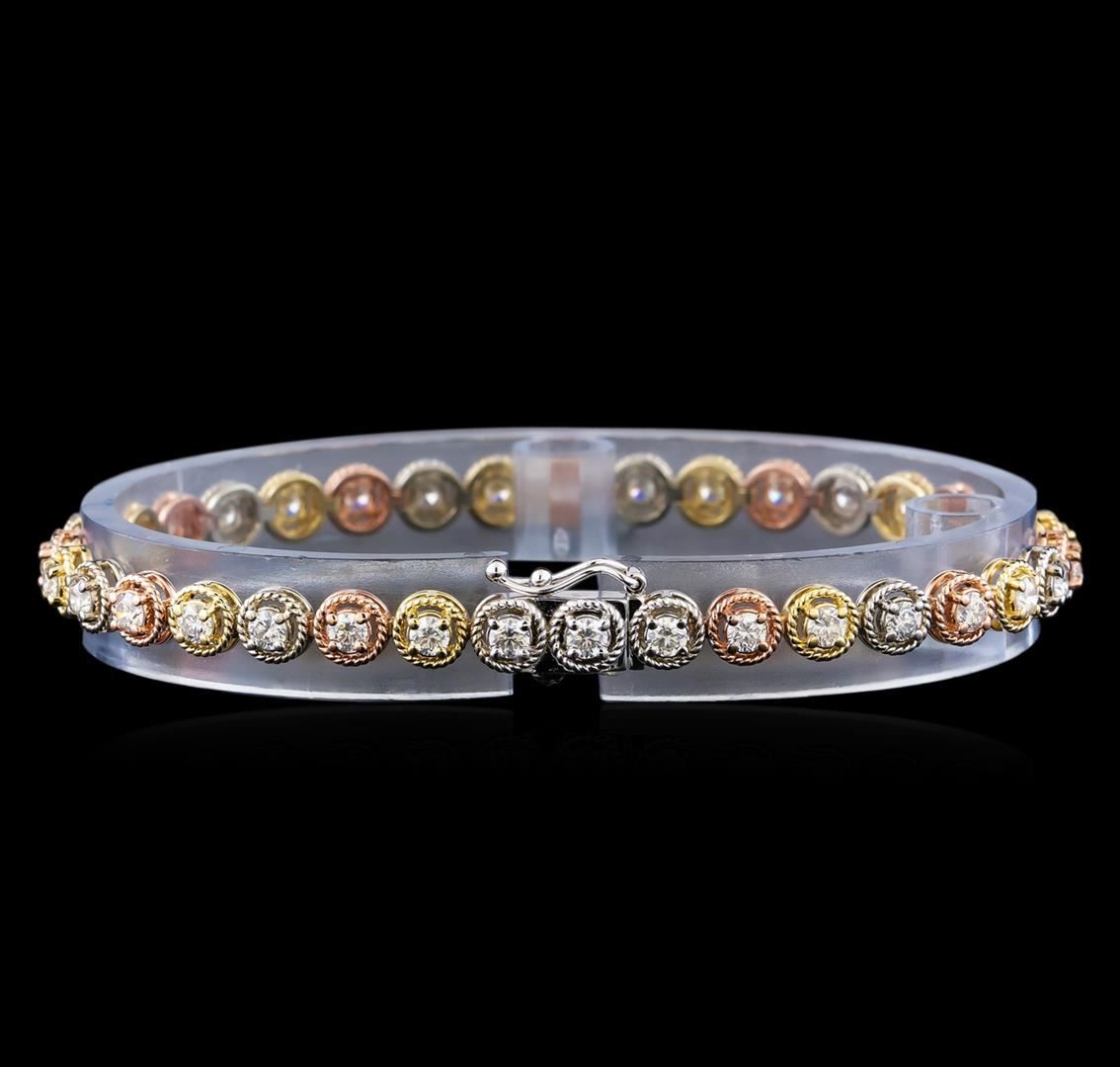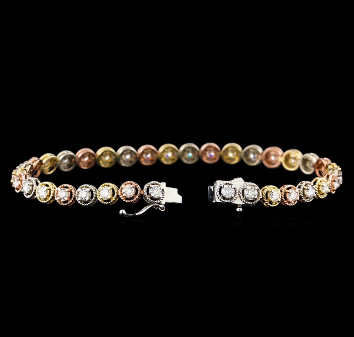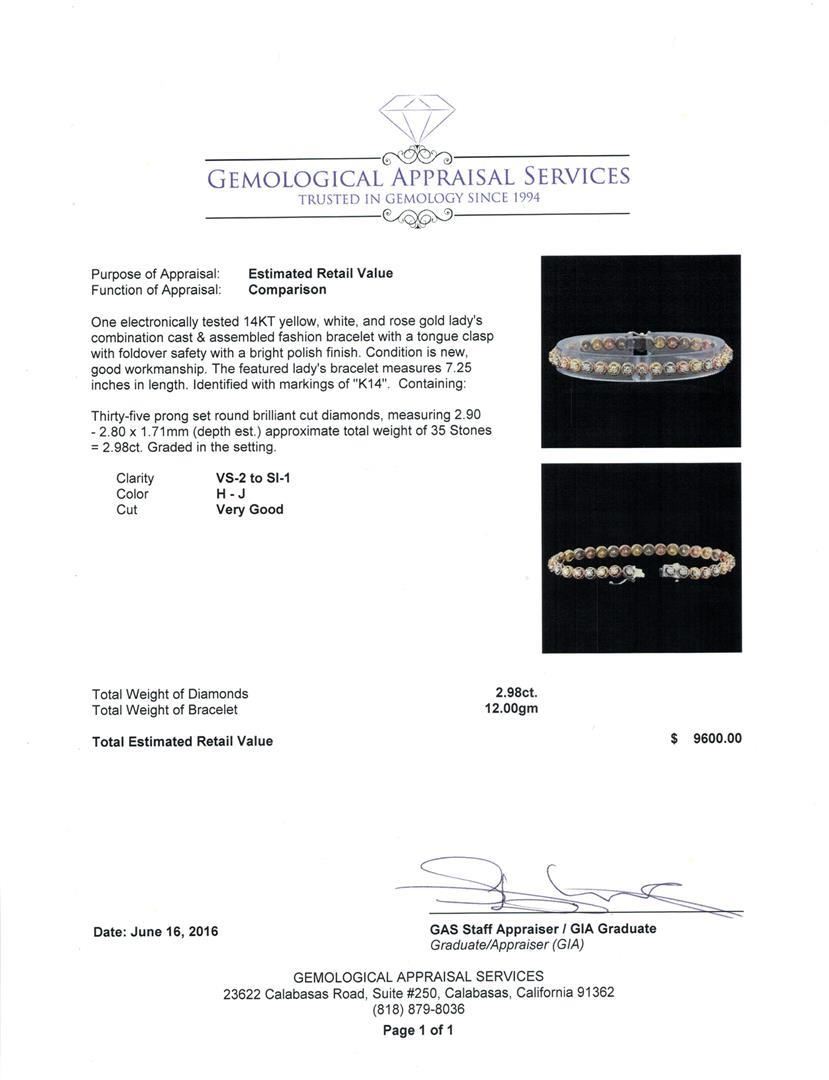 One electronically tested 14KT yellow, white, and rose gold lady's combination cast & assembled fashion bracelet with a tongue clasp with foldover safety with a bright polish finish. The featured lady's bracelet measures 7.25 inches in length. Identified with markings of "K14". Condition is new, good workmanship. Containing: Thirty-Five prong set round brilliant cut diamonds, measuring 2.90 - 2.80 x 1.71mm (depth est.) approximate total weight of 35 Stones = 2.98ct. Graded in the setting. Clarity: VS-2 to SI-1. Color: H - J. Cut Very Good. Total Weight of Diamonds 2.98ct. Total Weight of Bracelet 12.00gm GAS Appraised.
