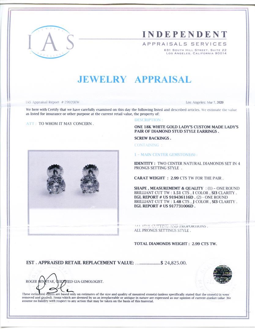 ONE 18K WHITE GOLD LADY'S CUSTOM MADE LADY'S PAIR OF DIAMOND STUD STYLE EARRINGS . SCREW BACKINGS #1 - MAIN CENTER GEMSTONE(S)# IDENTITY: TWO CENTER NATURAL DIAMONDS SET IN 4 PRONGS SETTING STYLE CARAT WEIGHT: 2.99 CTS TW FOR THE PAIR SHAPE , MEASUREIVIEMT and QUALITY: (1) - ONE ROUND BRILLIANT CUT TW: 1.51 CTS, I COLOR, SI3 CLARITY, EGL REPORT #US 919436116D (2) - ONE ROUND BRILLIANT CUT TW: 1.48 CTS, J COLOR, SI3 CLARITY, EGL REPORT #US 917731006D TOTAL DIAMONDS WEIGHT: 2.99 CTS