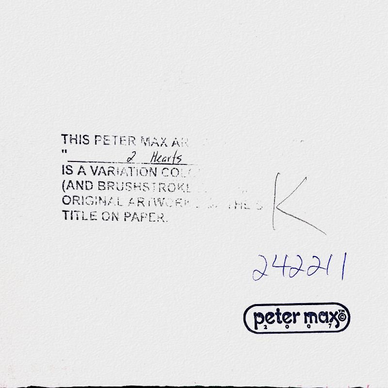 "2 Hearts" is a hand signed one-of-a-kind acrylic mixed media on paper by Peter Max. The piece comes custom framed with a backside cutout to display Peter Max Studio registration number 242211 certifying authenticity. Measures approximately 26" x 30" (frame), 13" x 17" (image).