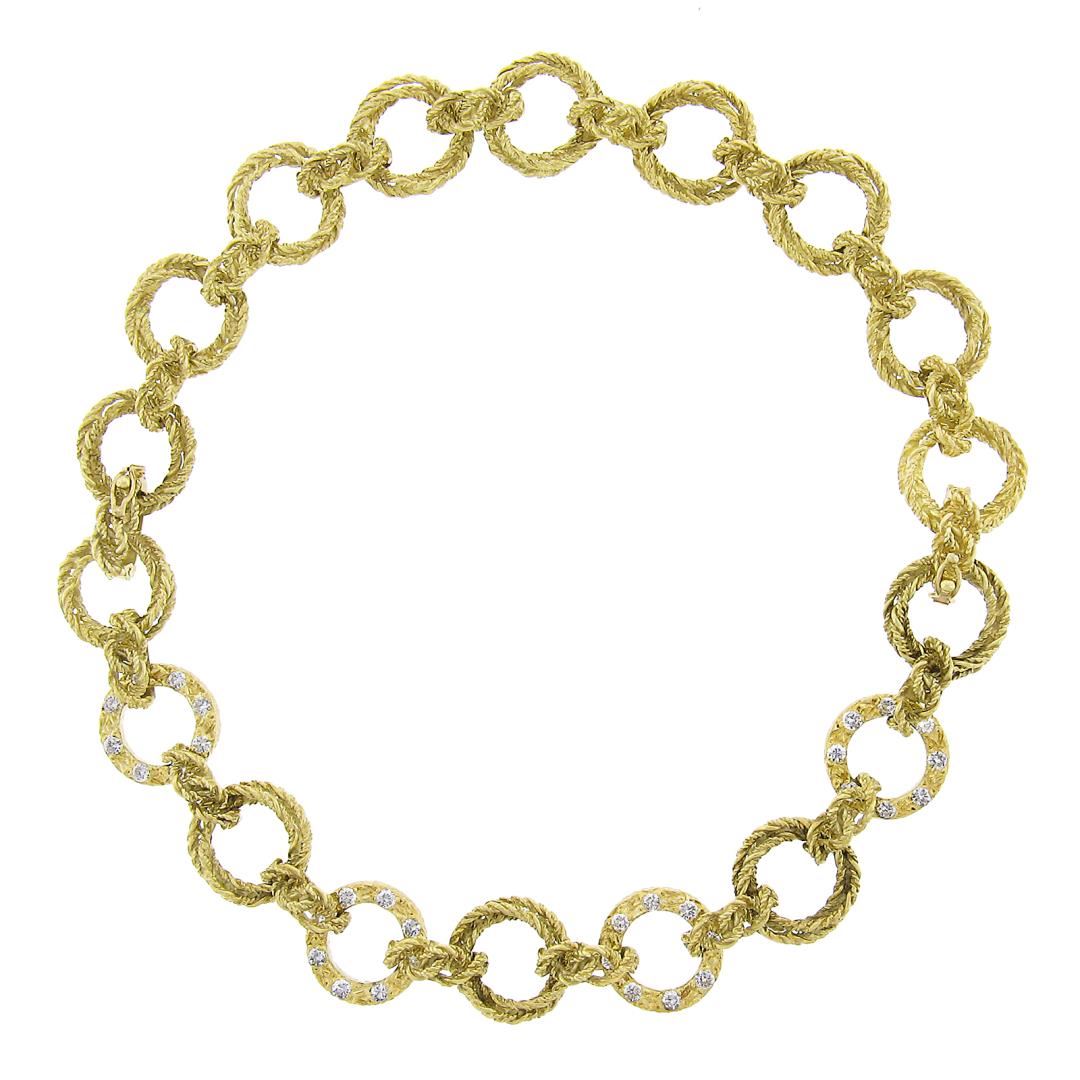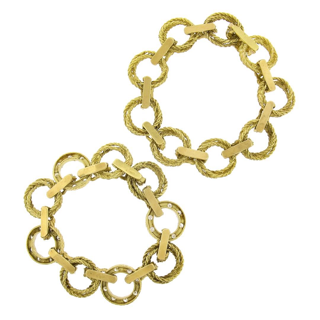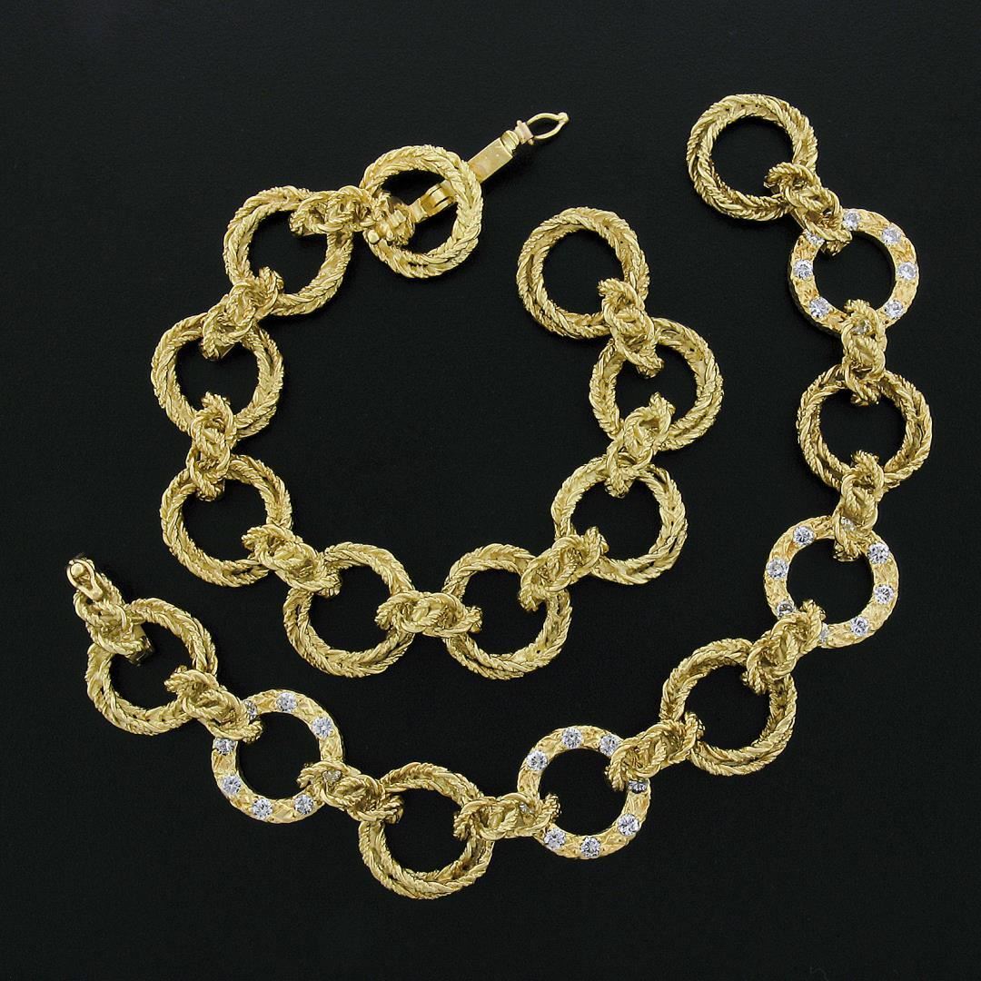 A vintage solid 18k yellow gold twisted wire link set of 2 bracelets or necklace, featuring 32 round brilliant cut natural diamonds (G/H - VS2/SI1 ; 2.56ctw ). It weighs a total of 90.50 grams, measures 18mm wide, and measures each 6.75 inches in length.