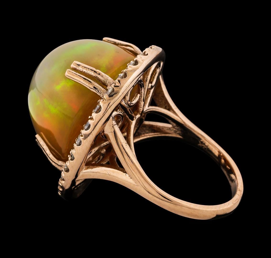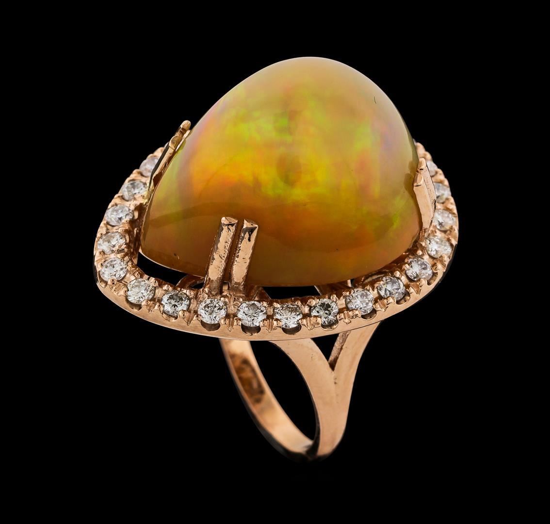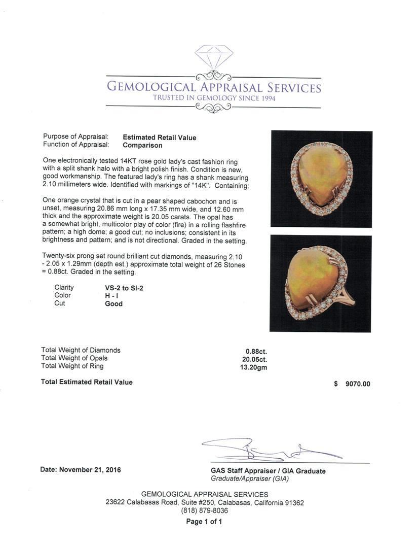 One electronically tested 14KT rose gold lady's cast fashion ring with a split shank halo with a bright polish finish. The featured lady's ring has a shank measuring 2.10 millimeters wide. Identified with markings of '14K'. Condition is new, good workmanship. Containing: One orange crystal that is cut in a pear shaped cabochon and is unset, measuring 20.86 mm long x 17.35 mm wide, and 12.60 mm thick and the approximate weight is 20.05 carats. The opal has a somewhat bright, multicolor play of color (fire) in a rolling flashfire pattern; a high dome; a good cut; no inclusions; consistent in its brightness and pattern; and is not directional. Graded in the setting. Twenty-Six prong set round brilliant cut diamonds, measuring 2.10 - 2.05 x 1.29mm (depth est.) approximate total weight of 26 Stones = 0.88ct. Graded in the setting. Clarity VS-2 to SI-2. Color: H - I Cut Good. Total Weight of Diamonds 0.88ct.. Total Weight of Opals 20.05ct.. Total Weight of Ring 13.20gm. GAS Appraised.