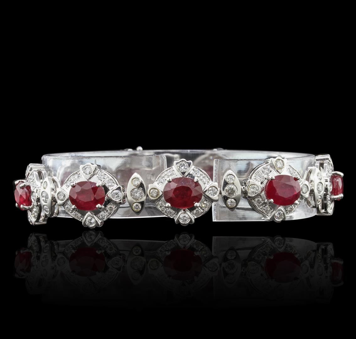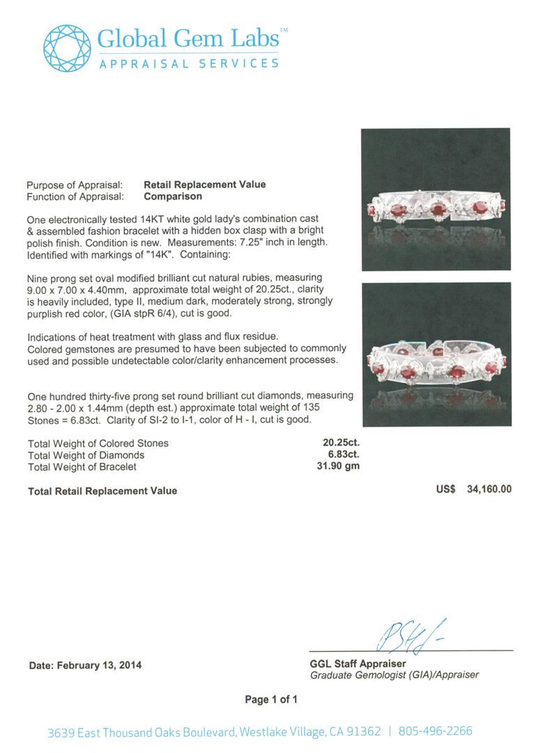 14KT White Gold 20.25ctw Ruby and Diamond Bracelet A7754. Great Condition! NM3005MK. One electronically tested 14KT White Gold lady's combination cast & assembled fashion bracelet with a hidden box clasp with a bright polish finish. Condition is new. Measurements: 7.25" inch in length. Identified with markings of "14K". Containing: Nine prong set oval modified brilliant cut natural rubies, measuring 9.00 x 7.00 x 4.40mm, approximate total weight of 20.25ct., clarity is heavily included, type II, medium dark, moderately strong, strongly purplish red color, (GIA stpR 6/4), cut is good. Indications of heat treatment with glass and flux residue. Colored gemstones are presumed to have been subjected to commonly used and possible undetectable color/clarity enhancement processes. One Hundred Thirty-Five prong set round brilliant cut diamonds, measuring 2.80 - 2.00 x 1.44mm (depth est.) approximate total weight of 135 Stones = 6.83ct. Clarity of SI-2 to I-1, Color of H - I, Cut is Good. Total Weight of Colored Stones 20.25ct. Total Weight of Diamonds 6.83ct. Total Weight of Bracelet 31.90gm. GGL Appraised at $34,160.00. GGL Appraised.