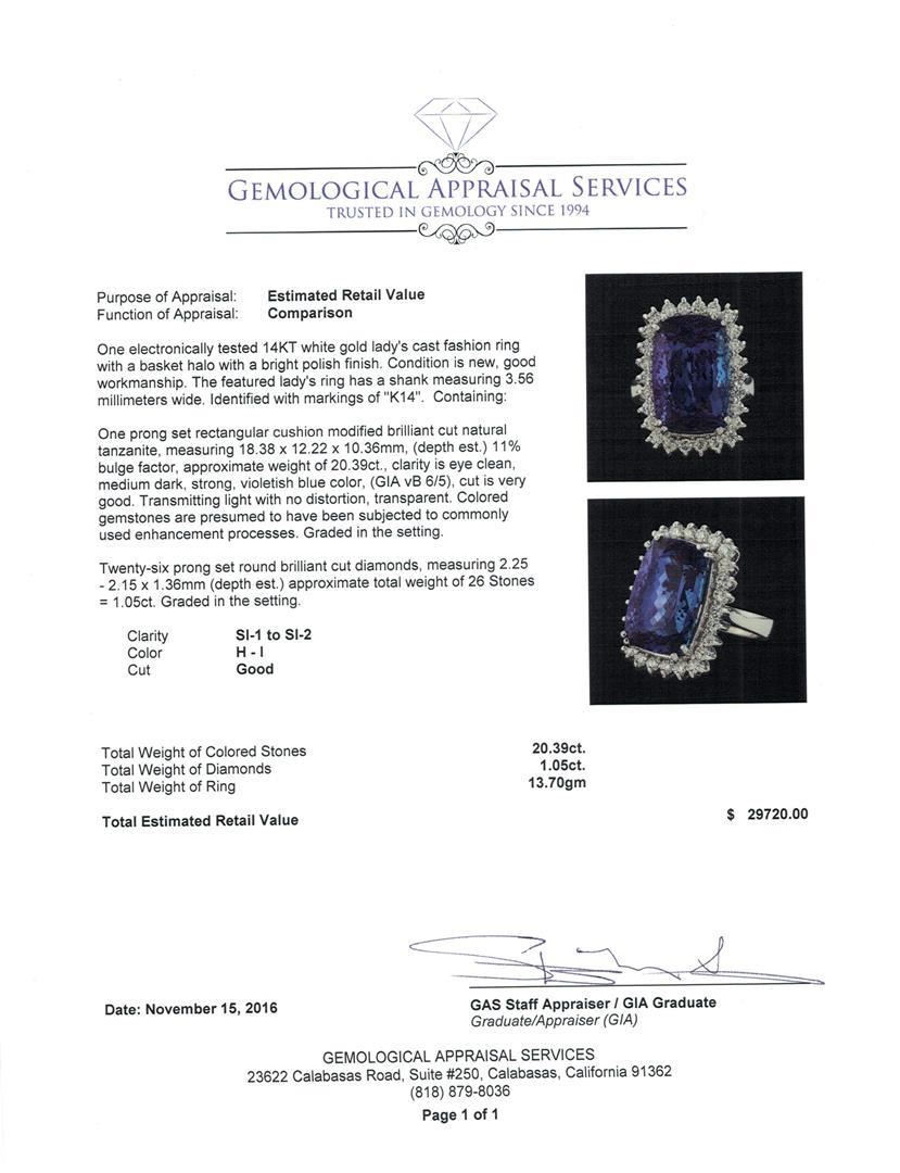 One electronically tested 14KT white gold lady's cast fashion ring with a basket halo with a bright polish finish. The featured lady's ring has a shank measuring 3.56 millimeters wide. Identified with markings of 'K14'. Condition is new, good workmanship. Containing: One prong set rectangular cushion modified brilliant cut natural tanzanite, measuring 18.38 x 12.22 x 10.36mm, (depth est.) 11%. bulge factor, approximate weight of 20.39ct., clarity is eye clean, medium dark, strong, violetish blue color, (GIA vB 6/5), cut is very good. Transmitting light with no distortion, transparent. Colored gemstones are presumed to have been subjected to commonly used enhancement processes. Graded in the setting. Twenty-Six prong set round brilliant cut diamonds, measuring 2.25 - 2.15 x 1.36mm (depth est.) approximate total weight of 26 Stones = 1.05ct. Graded in the setting. Clarity SI-1 to SI-2. Color: H - I Cut Good. Total Weight of Colored Stones 20.39ct.. Total Weight of Diamonds 1.05ct.. Total Weight of Ring 13.70gm. GAS Appraised.