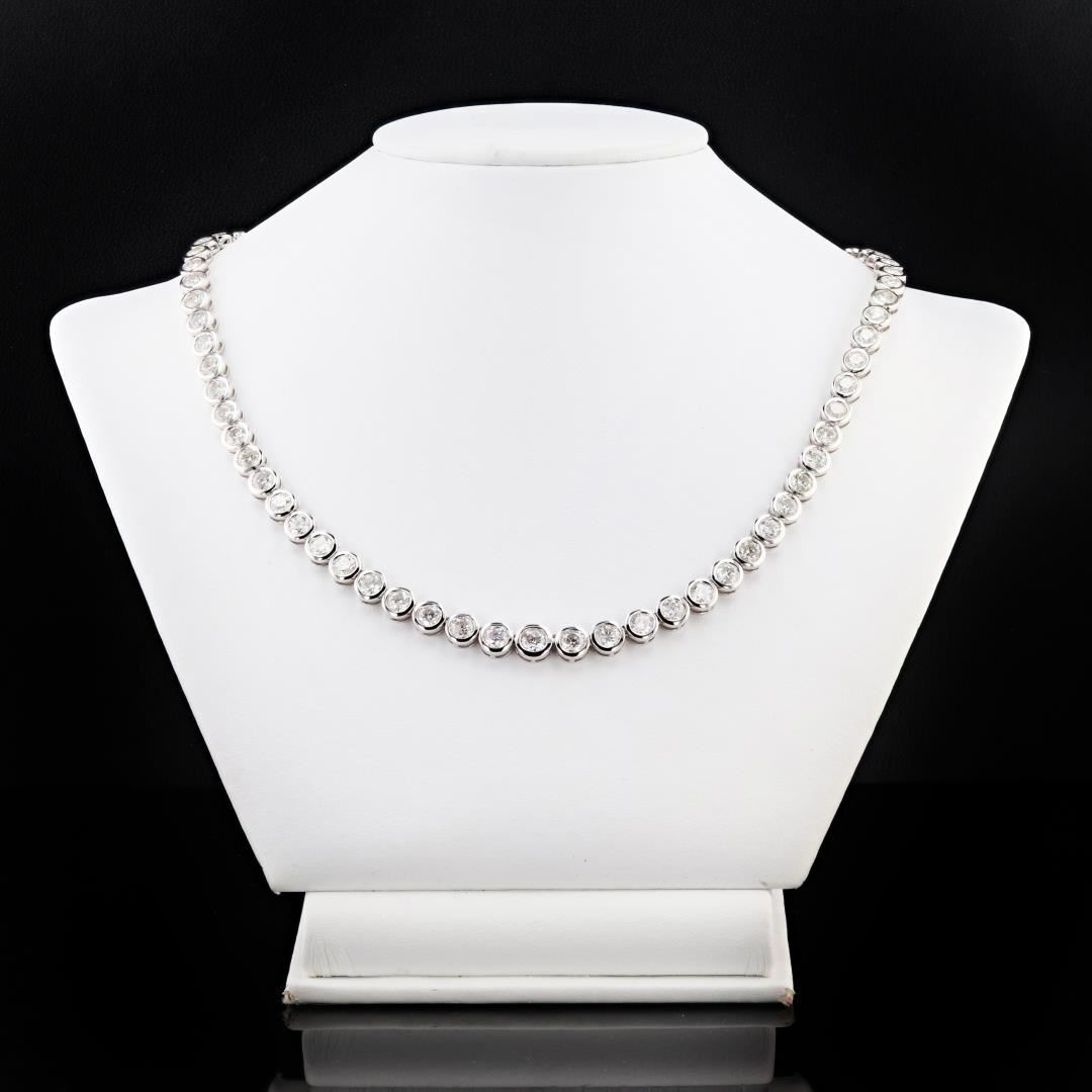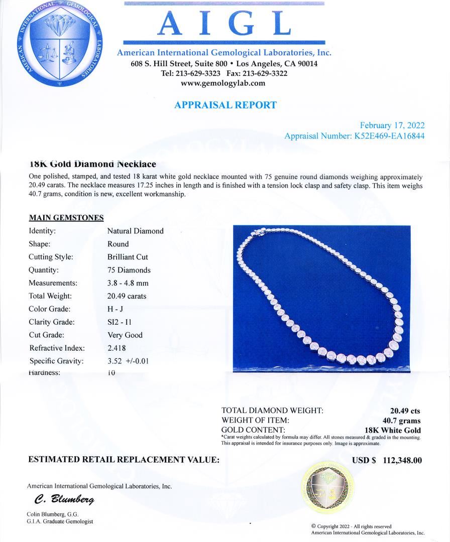 One polished, stamped, and tested 18 karat white gold necklace mounted with 75 genuine round diamonds weighing approximately 20.49 carats. The necklace measures 17.25 inches in length and is finished with a tension lock clasp and safety clasp. This item weighs 40.7 grams, condition is new, excellent workmanship. #MAIN GEMSTONES# Identity: Natural Diamond Shape: Round Cutting Style: Brilliant Cut Quantity: 75 Diamonds Measurements: 3.8 - 4.8mm Total Weight: 20.49 carats Color Grade: H - J Clarity Grade: SI2 - I1 Cut Grade: Very Good Refractive Index: 2.418 Specific Gravity: 3.52 +/-0.01 Hardness: 10 TOTAL DIAMOND WEIGHT: 20.49 cts WEIGHT OF ITEM: 40.7 grams GOLD CONTENT: 18K White Gold