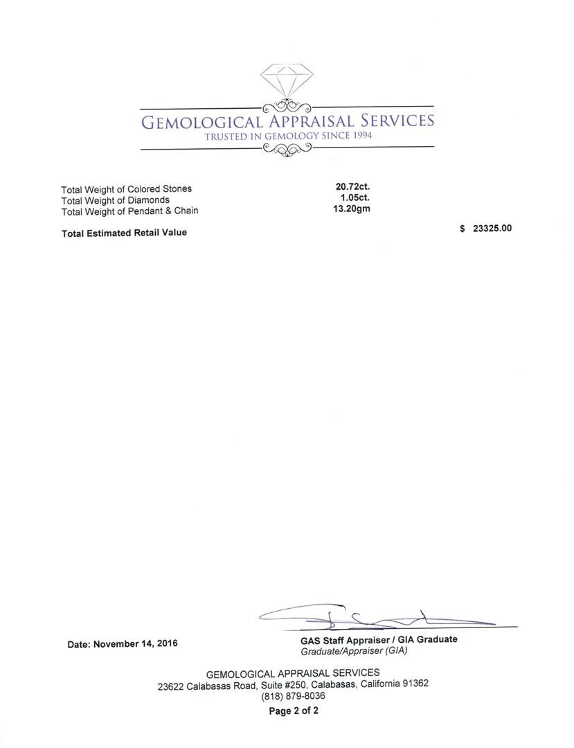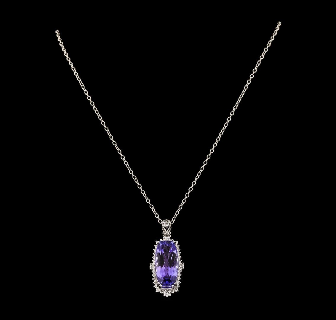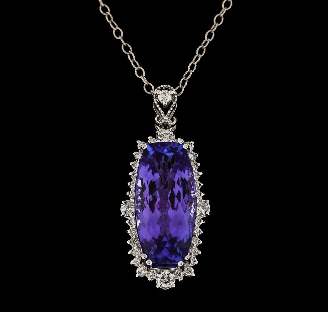 One electronically tested 14KT white gold lady's combination cast & assembled fashion pendant & chain 18.0' long, 1.9mm twisted oval shape link with a lobster claw clasp with a basket halo with a bright polish with milgrain detailing finish. The featured lady's pendant has a drop of 39 millimeters. Identified with markings of 'K14'. Condition is new, good workmanship. Containing: One prong set rectangular cushion modified brilliant cut natural tanzanite, measuring 23.05 x 11.47 x 8.80mm, (depth est.) 13%. bulge factor, approximate weight of 20.72ct., clarity is eye clean, medium light, moderately strong, bluish violet color, (GIA bV 4/4), cut is very good. Transmitting light with no distortion, transparent. Colored gemstones are presumed to have been subjected to commonly used enhancement processes. Graded in the setting. Four prong set round brilliant cut diamonds, measuring 3.10 - 3.00 x 1.86mm (depth est.) approximate total weight of 4 Stones = 0.42ct. Graded in the setting. Clarity SI-1 to SI-2. Color: G - H Cut Good One prong set round brilliant cut diamond, measuring 2.50 - 2.45 x 1.54mm (depth est.) approximate weight of 0.06ct. Graded in the setting. Clarity SI-2. Color: G Cut Good Twenty-Eight prong set round brilliant cut diamonds, measuring 1.80 - 1.70 x 1.09mm (depth est.) approximate total weight of 28 Stones = 0.57ct. Graded in the setting. Clarity VS-2 to SI-2. Color: G - H Cut Good. Total Weight of Colored Stones 20.72ct.. Total Weight of Diamonds 1.05ct.. Total Weight of Pendant & Chain 13.20gm GAS Appraised at $23,325.00.