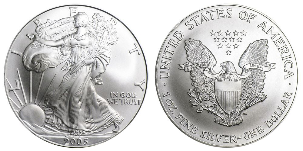 One 2005 American Silver Eagle .999 Fine Silver Dollar Coin.