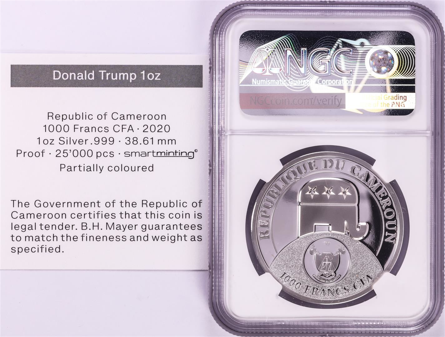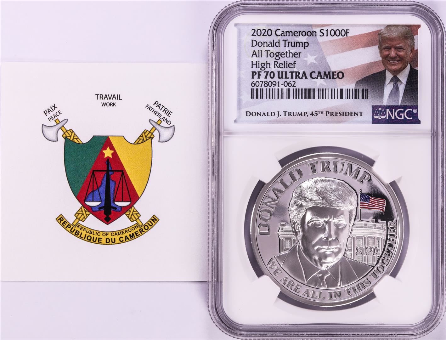 One 2020 Cameroon S1000F Donald Trump All Together High Relief PF 70 Ultra Cameo 1oz Silver .999 Coin.