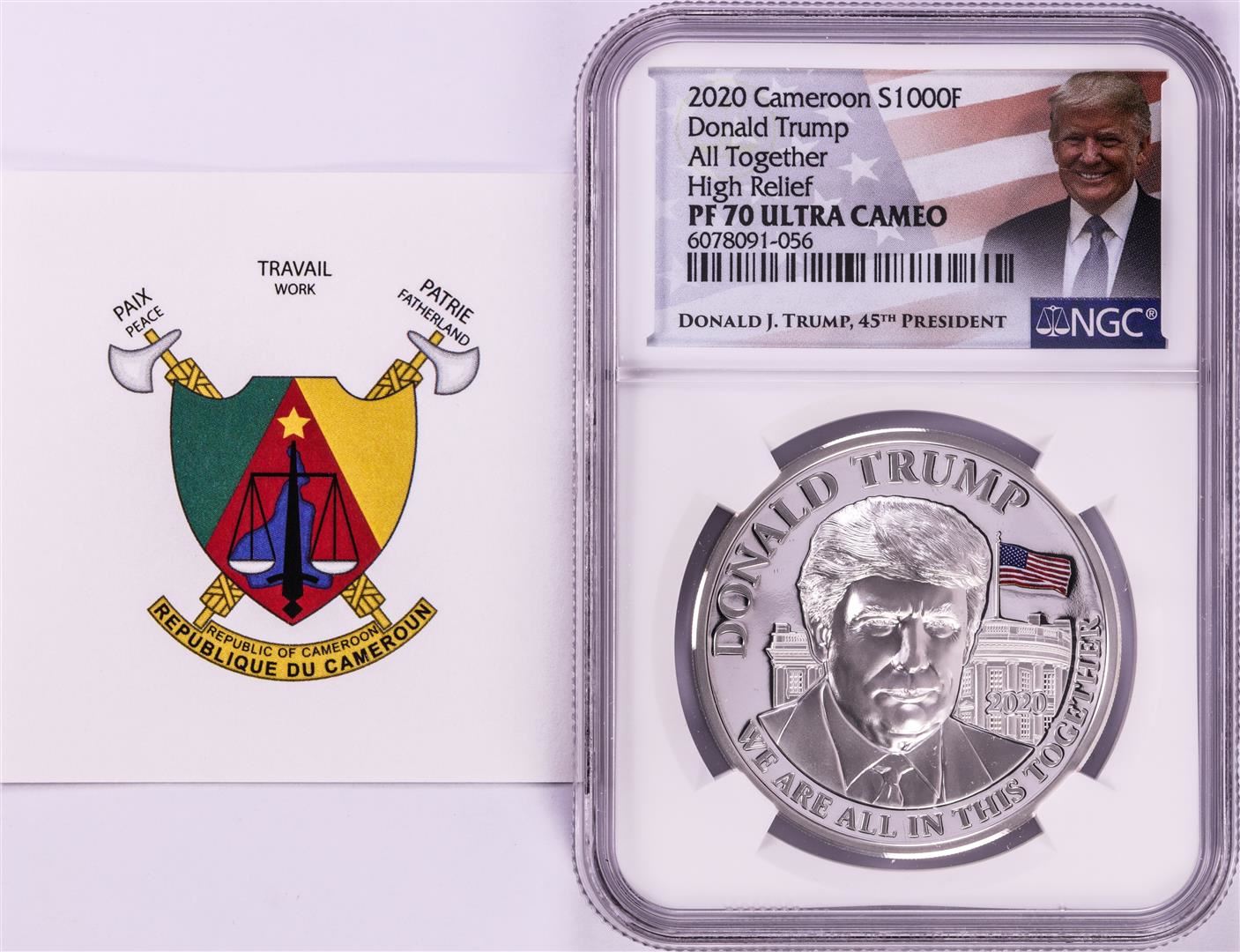 One 2020 Cameroon S1000F Donald Trump All Together High Relief PF 70 Ultra Cameo 1oz Silver .999 Coin.
