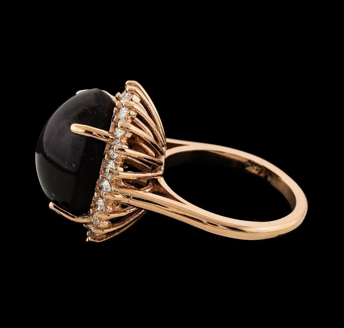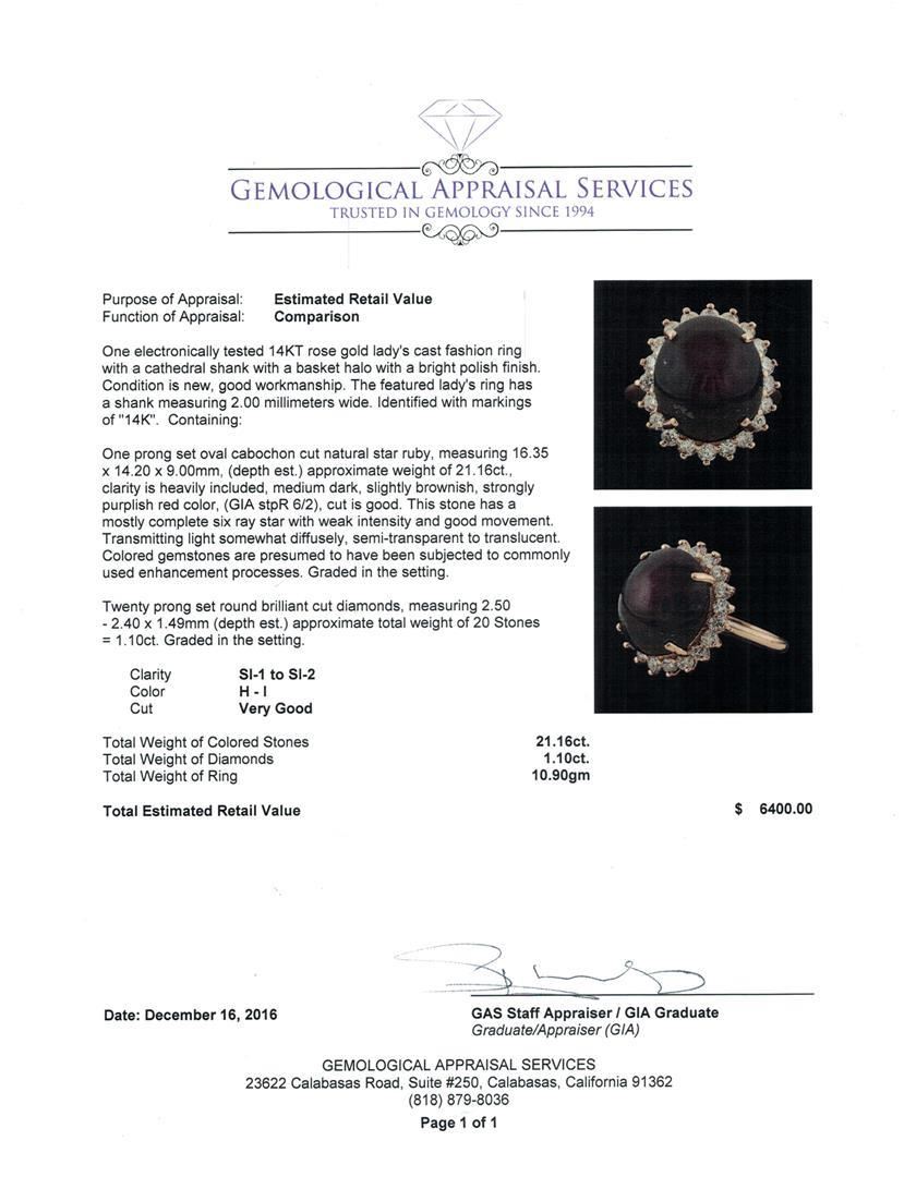 One electronically tested 14KT rose gold lady's cast fashion ring with a cathedral shank with a basket halo with a bright polish finish. The featured lady's ring has a shank measuring 2.00 millimeters wide. Identified with markings of '14K'. Condition is new, good workmanship. Containing: One prong set oval cabochon cut natural star ruby, measuring 16.35 x 14.20 x 9.00mm, (depth est.) approximate weight of 21.16ct., clarity is heavily included, medium dark, slightly brownish, strongly purplish red color, (GIA stpR 6/2), cut is good. This stone has a mostly complete six ray star with weak intensity and good movement. Transmitting light somewhat diffusely, semi-transparent to translucent. Colored gemstones are presumed to have been subjected to commonly used enhancement processes. Graded in the setting. Twenty prong set round brilliant cut diamonds, measuring 2.50 - 2.40 x 1.49mm (depth est.) approximate total weight of 20 Stones = 1.10ct. Graded in the setting. Clarity SI-1 to SI-2. Color: H - I Cut Very Good. Total Weight of Colored Stones 21.16ct.. Total Weight of Diamonds 1.10ct.. Total Weight of Ring 10.90gm. GAS Appraised.