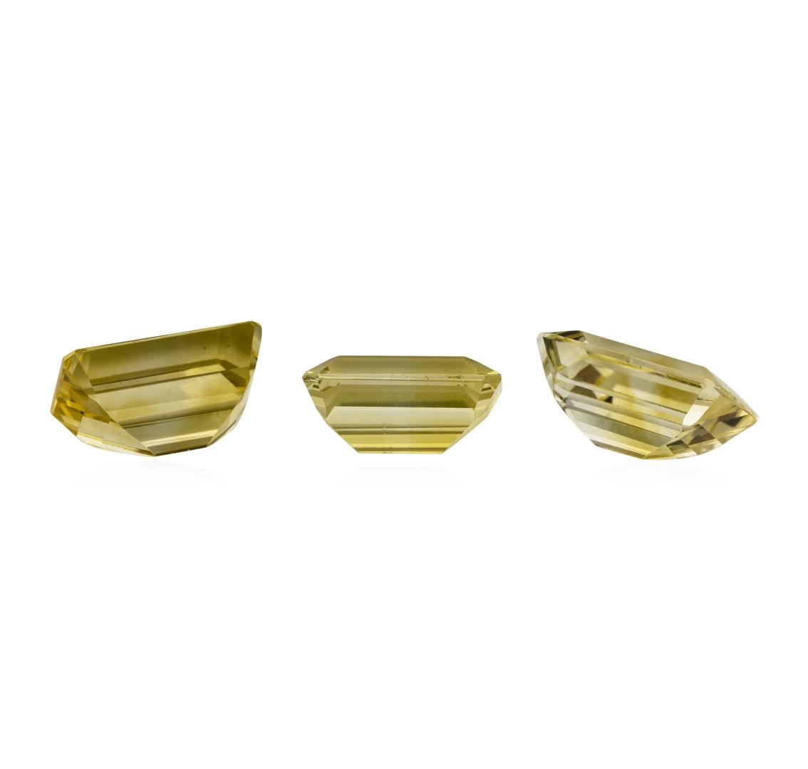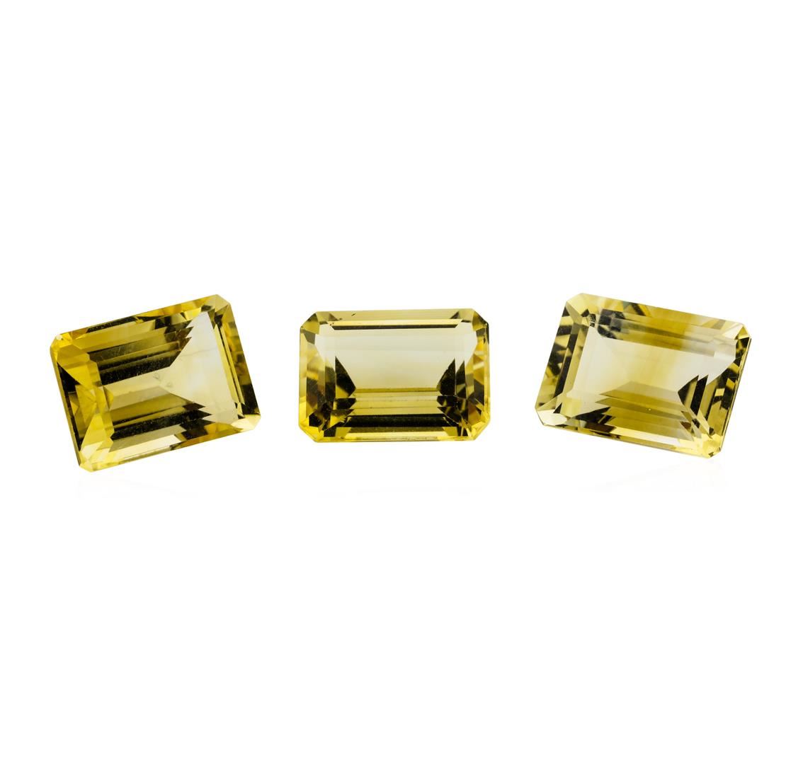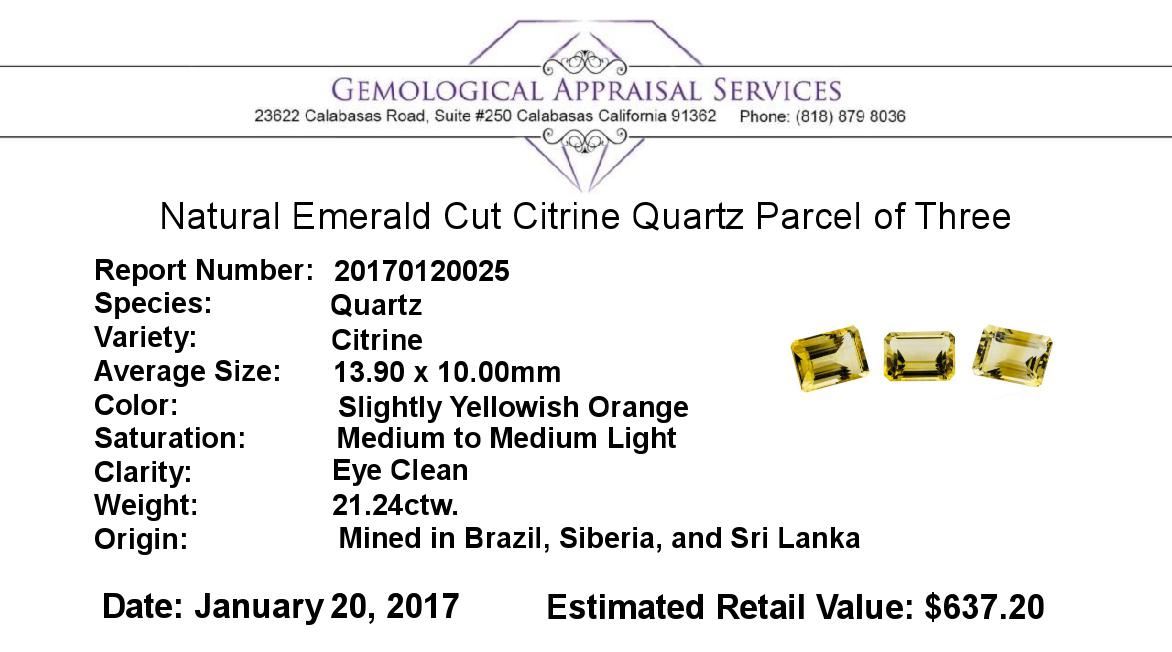 One natural emerald cut citrine quartz parcel of three with an exact weight of 21.24ctw., clarity is eye clean, slightly yellowish orange, medium to medium light. Gemological Appraisals Services estimates the retail value at $637.2 GAS Appraised.