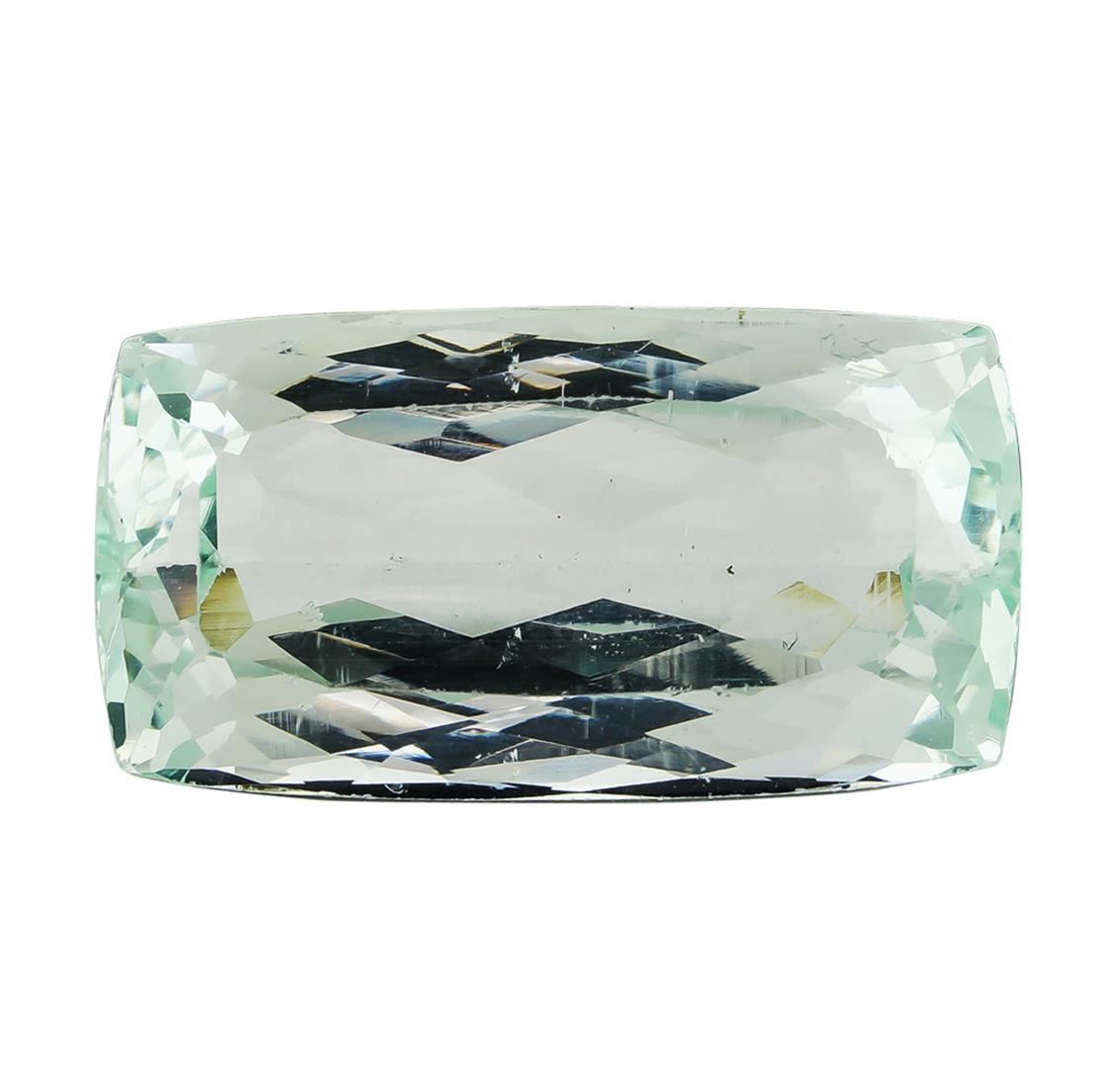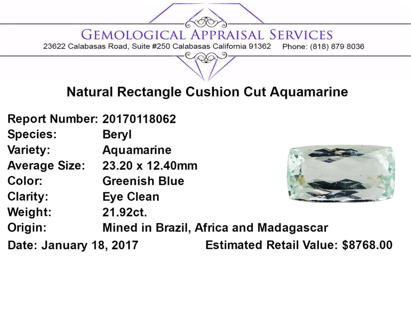 One natural rectangle cushion cut aquamarine with an exact weight of 21.92ct., clarity is eye clean, greenish blue. Gemological Appraisals Services estimates the retail value at $8768 GAS Appraised.