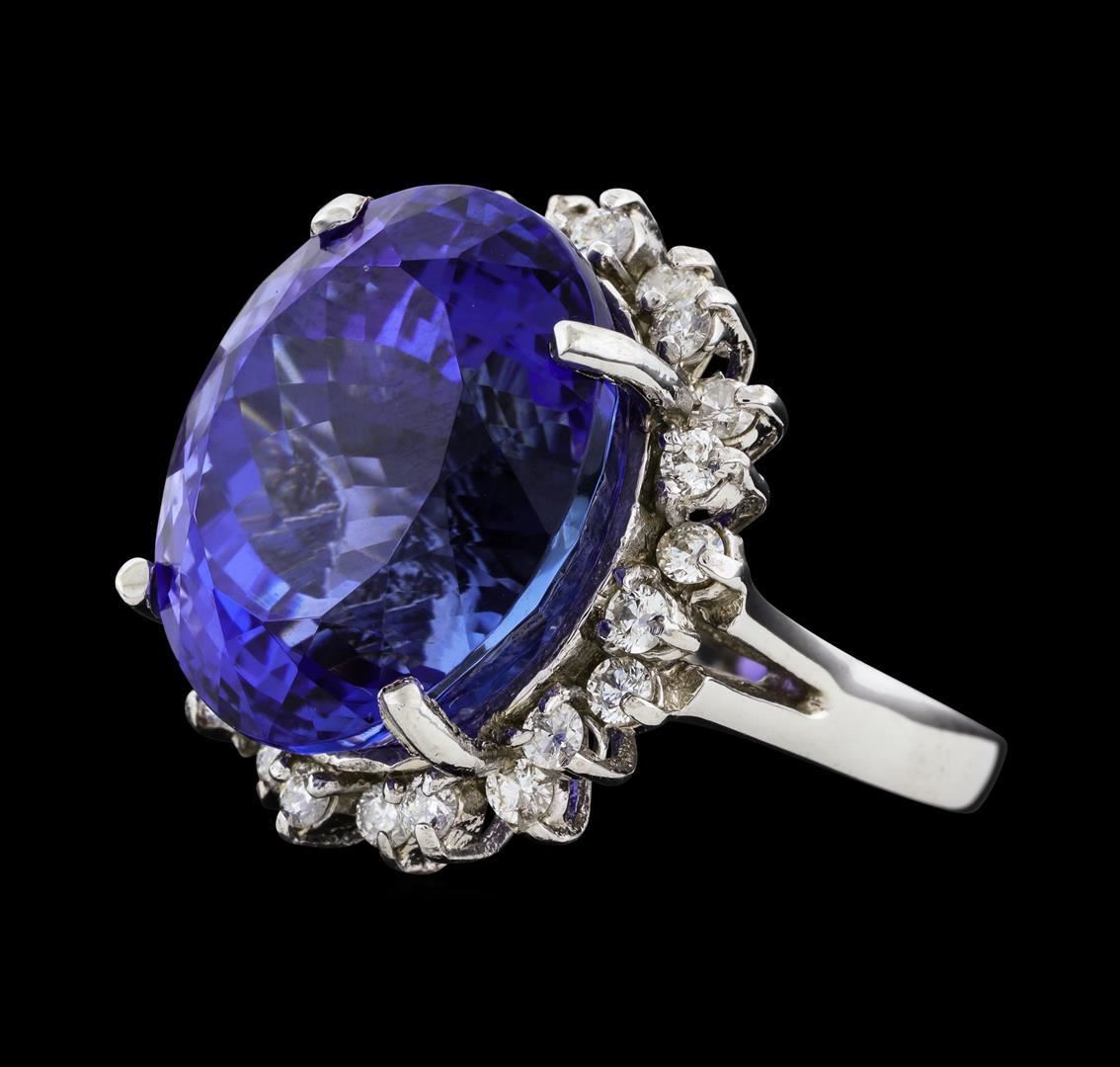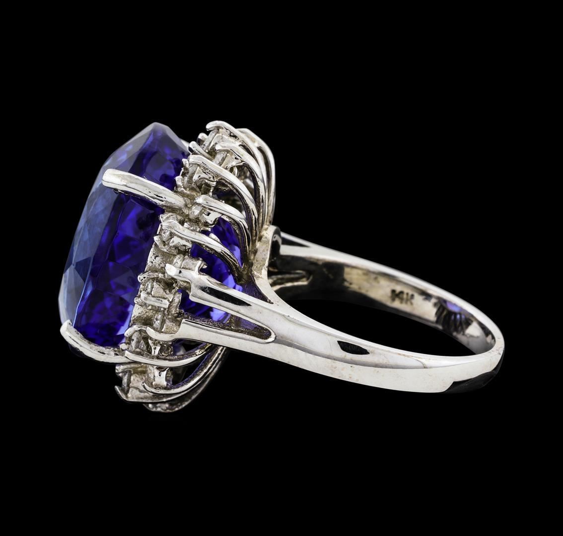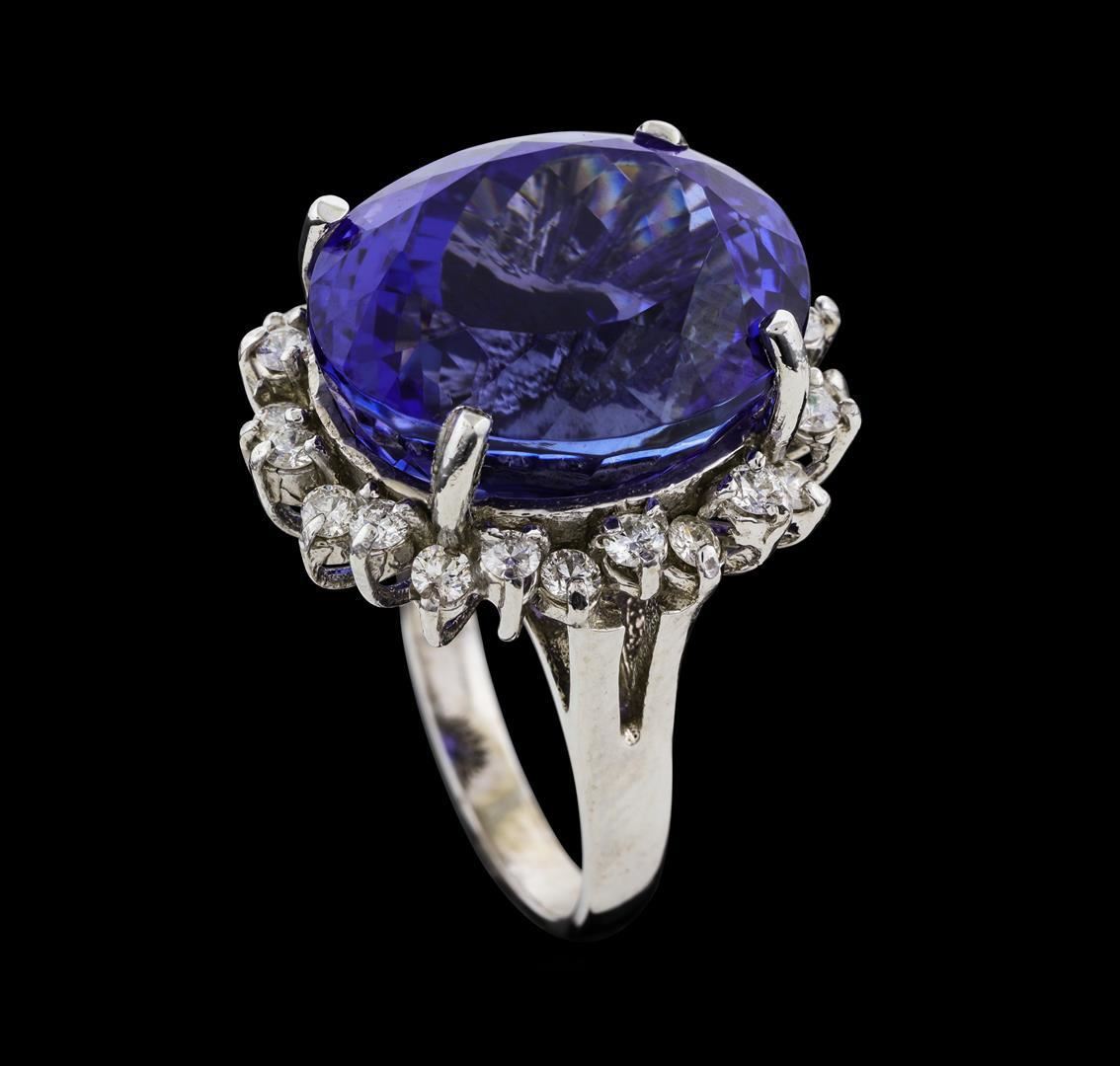 One electronically tested 14KT white gold lady's cast fashion ring with a staggered basket halo with a bright polish finish. The featured lady's ring has a split cathedral shank measuring 2.48 millimeters wide. Identified with markings of '14K'. Condition is new, good workmanship. Containing: One prong set oval modified brilliant cut natural tanzanite, measuring 17.45 x 14.60 x 11.84mm, (depth est.) 4%. bulge factor, approximate weight of 22.03ct., clarity is eye clean, medium dark, strong, violetish blue color, (GIA vB 6/5), cut is very good. Transmitting light with no distortion, transparent. Colored gemstones are presumed to have been subjected to commonly used enhancement processes. Graded in the setting. Twenty-Four prong set round brilliant cut diamonds, measuring 2.10 - 1.90 x 1.24mm (depth est.) approximate total weight of 24 Stones = 0.74ct. Graded in the setting. Clarity SI-1 to I-1. Color: H - I Cut Good. Total Weight of Colored Stones 22.03ct.. Total Weight of Diamonds 0.74ct.. Total Weight of Ring 11.50gm. GAS Appraised.