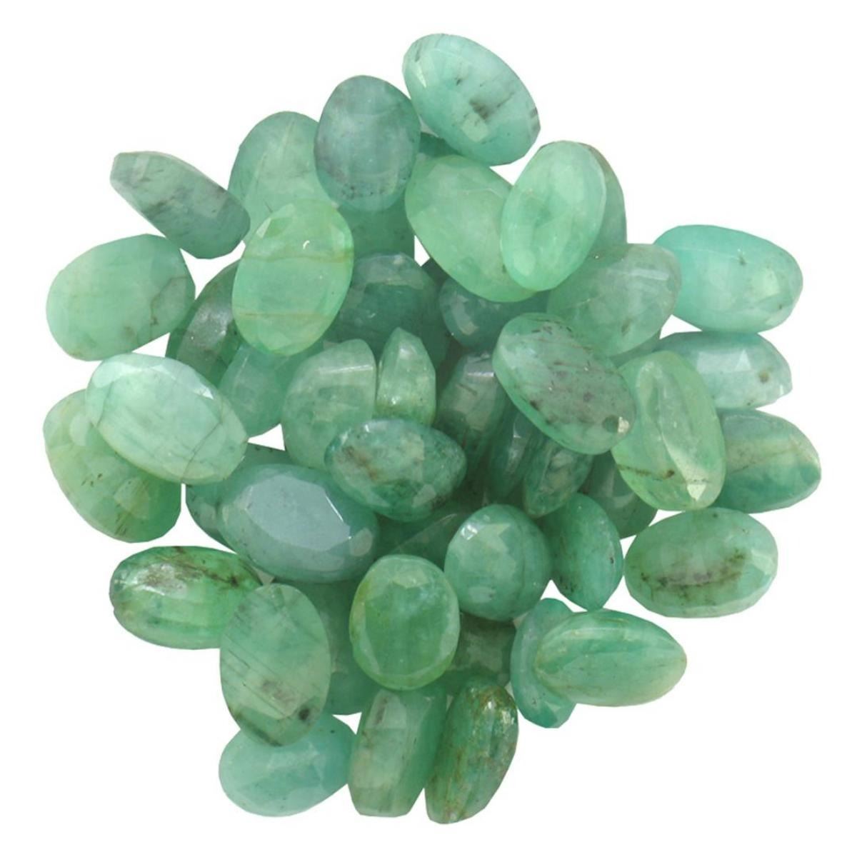 Fifty-two oval mixed cut natural emeralds exact total weight 22.11ct., clarity is heavily included, type III, medium dark, very slightly grayish, very slightly bluish green color, (GIA vslbG 6/3), cut is good. Westfield Appraised.